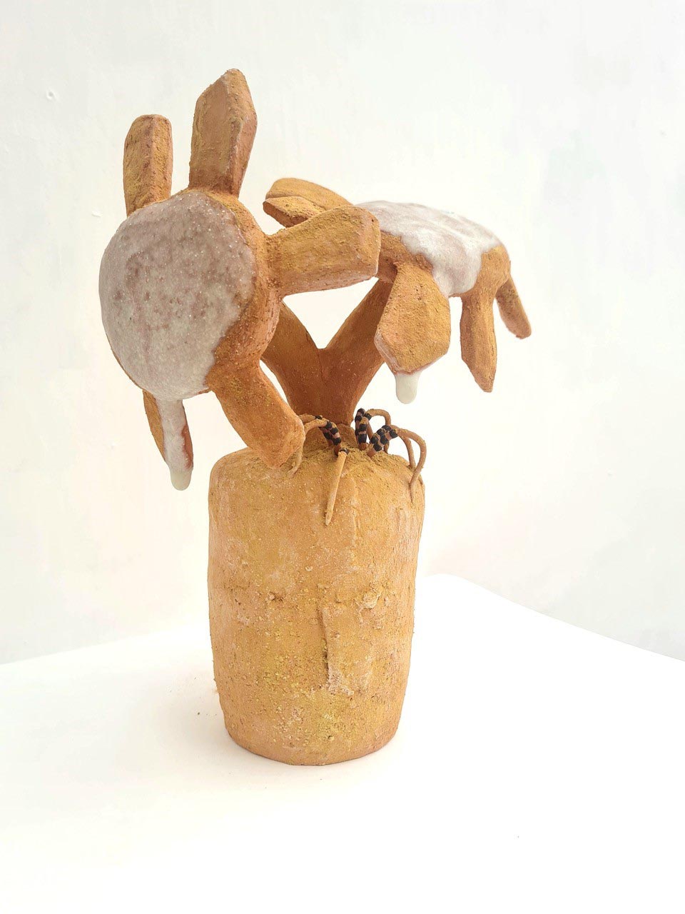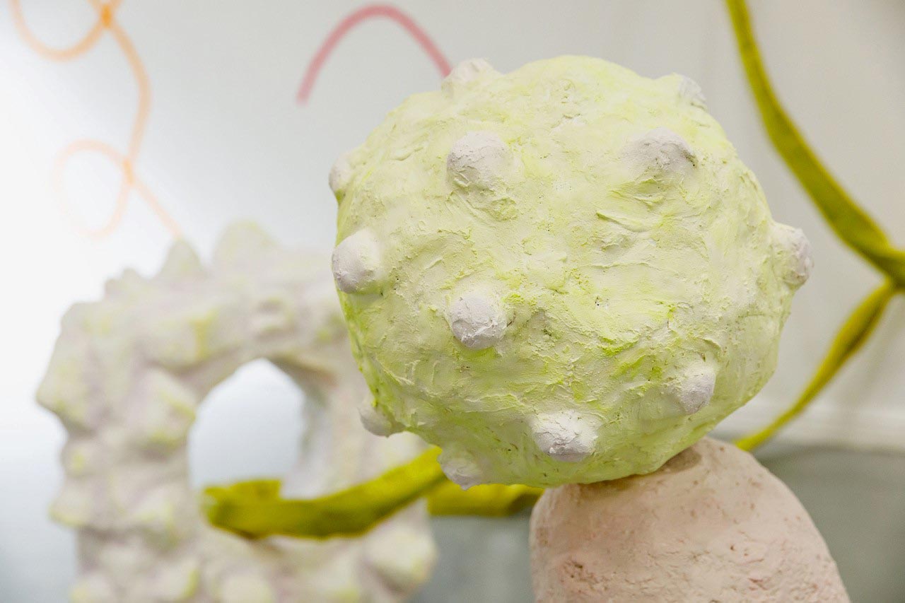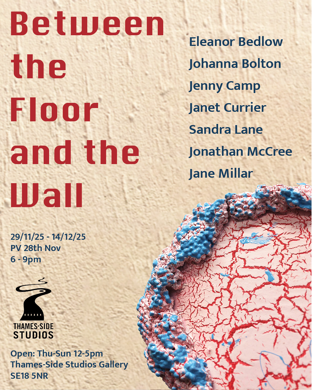 Between the Floor and the Wall presents the work of seven artists whose work oscillates between the flat and the fat; the horizontal and the vertical. Their diverse artistic outputs share an excitement about playing with spaces and meaning throughout the zone between the floor and the wall, bringing energy and humour to this project at Thames-Side Studios Gallery. The exhibition includes works made with diverse, experimental and sustainable approaches to textiles, sculpture, ceramics and found materials. About the artists: Eleanor Bedlow works in between the disciplines of drawing, painting and sculpture, pairing tactile and organic forms in works that feel as though they are exploring, leaning, feeling, listening. @eleanorbedlow Johanna Bolton works across sculpture, installation and performance, engaging with complexity and the unknowable, and imprints of human presence in everyday objects and material encounters. @johanna.bolton Jenny Camp practices sculptural auto-cannibalism, physically making things out of desire and necessity but then frequently chopping up, adding to, or breaking down older pieces, mining them as material for new work. @jennyscamp_ Pattern, repetition and rhythm are central to Janet Currier’s installation with sculpture, drawing and painting, where scraps of well-worn garments worked into her sculptures, and invented wallpaper denote the domestic space; vulnerability, care and resilience. @janetdcurrier Sandra Lane works feelings of ambivalence, optimism and failure into multiple forms made from malleable materials, exploring memories, how to be a female and the absurd. In new edible and wearable works she enjoys pushing against the limits of sculpture, as much as the materials themselves. @artysandralane Jonathan McCree works with drawing, painting, sculpture, film and performance, as a record of movement and emotion through space. His playful, experimental practice pushes the boundaries of architecture, exploring spatial ideas and qualities. @jonathanmccree Jane Millar works with ceramics, wall painting and installation. The narrative emerges from the chaotic zone between our perceived inside and outside; a place of becoming and repurposing, of remnants of objects, mythologies, and a future speculation of a cosmos. @jmillarstudio Thames-Side Studios Gallery Thames-Side Studios Harrington Way, Warspite Road Royal Borough of Greenwich London SE18 5NR For general Thames-Side Studios Gallery enquiries please email info@thames-sidestudios.co.uk Disabled access. Free, limited parking is available on site. How to get here: Bicycle: Thames River cycle path (16 mins cycle from Greenwich). Bus: 161 / 177 / 180 / 472 to Warspite Road bus stop. DLR: Woolwich Arsenal (1 minute walk to Plumstead Road and take Route Bus 177 towards Peckham Bus Station or 472 towards North Greenwich Station). Road: A2 corridor, first roundabout east of Thames Barrier onto Warspite Road. Train: From Cannon Street or London Bridge to Woolwich Dockyard (8 minute walk) or Charlton (12 minute walk). Tube: North Greenwich (Take the Route Bus 472 towards Thamesmead Town Centre). Crossrail: Elizabeth Line to Woolwich (take Route Bus 177 towards Peckham Bus Station or 472 towards North Greenwich Station).