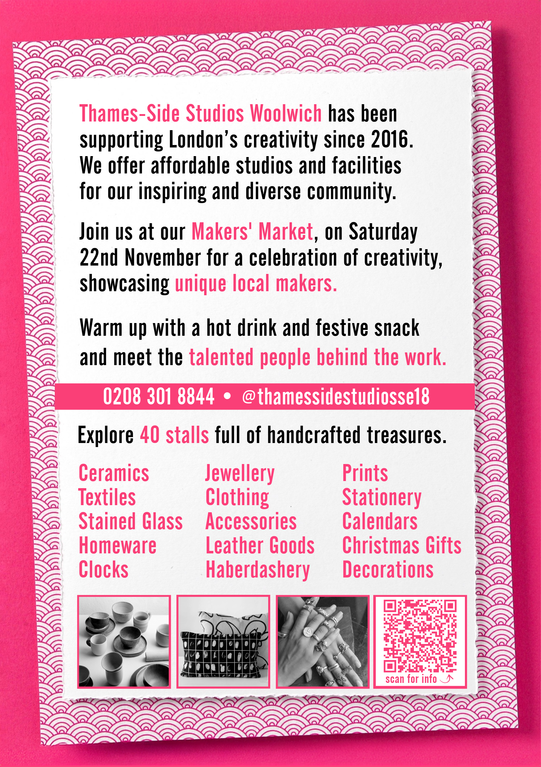 Our second Makers' Market will be held in Thames-Side Studios Gallery on Saturday 22nd November, from 11am-4pm. Free Entry. Join us for our Makers' Market - a celebration of creativity, showcasing unique local makers. Thames-Side Studios Woolwich has been supporting London’s creativity since 2016. We offer affordable studios and facilities for our inspiring and diverse community. Warm up with a hot drink and festive snack and meet the talented people behind the work. Explore 39 stalls full of handcrafted treasures. Ceramics Textiles Stained Glass Homeware Clocks Jewellery Clothing Accessories Leather Goods Workshop Vouchers Prints Stationery Calendars Christmas Gifts Decorations Disabled access. Free, limited parking is available on site. Thames-Side Studios Gallery Thames-Side Studios Harrington Way, Warspite Road Royal Borough of Greenwich London SE18 5NR How to get here: Bicycle: Thames River cycle path (16 mins cycle from Greenwich). Bus: 161 / 177 / 180 / 472 to Warspite Road bus stop. DLR: Woolwich Arsenal (1 minute walk to Plumstead Road and take Route Bus 177 towards Peckham Bus Station or 472 towards North Greenwich Station). Road: A2 corridor, first roundabout east of Thames Barrier onto Warspite Road. Train: From Cannon Street or London Bridge to Woolwich Dockyard (8 minute walk) or Charlton (12 minute walk). Tube: North Greenwich (Take the Route Bus 472 towards Thamesmead Town Centre). Crossrail: Elizabeth Line to Woolwich (take Route Bus 177 towards Peckham Bus Station or 472 towards North Greenwich Station).