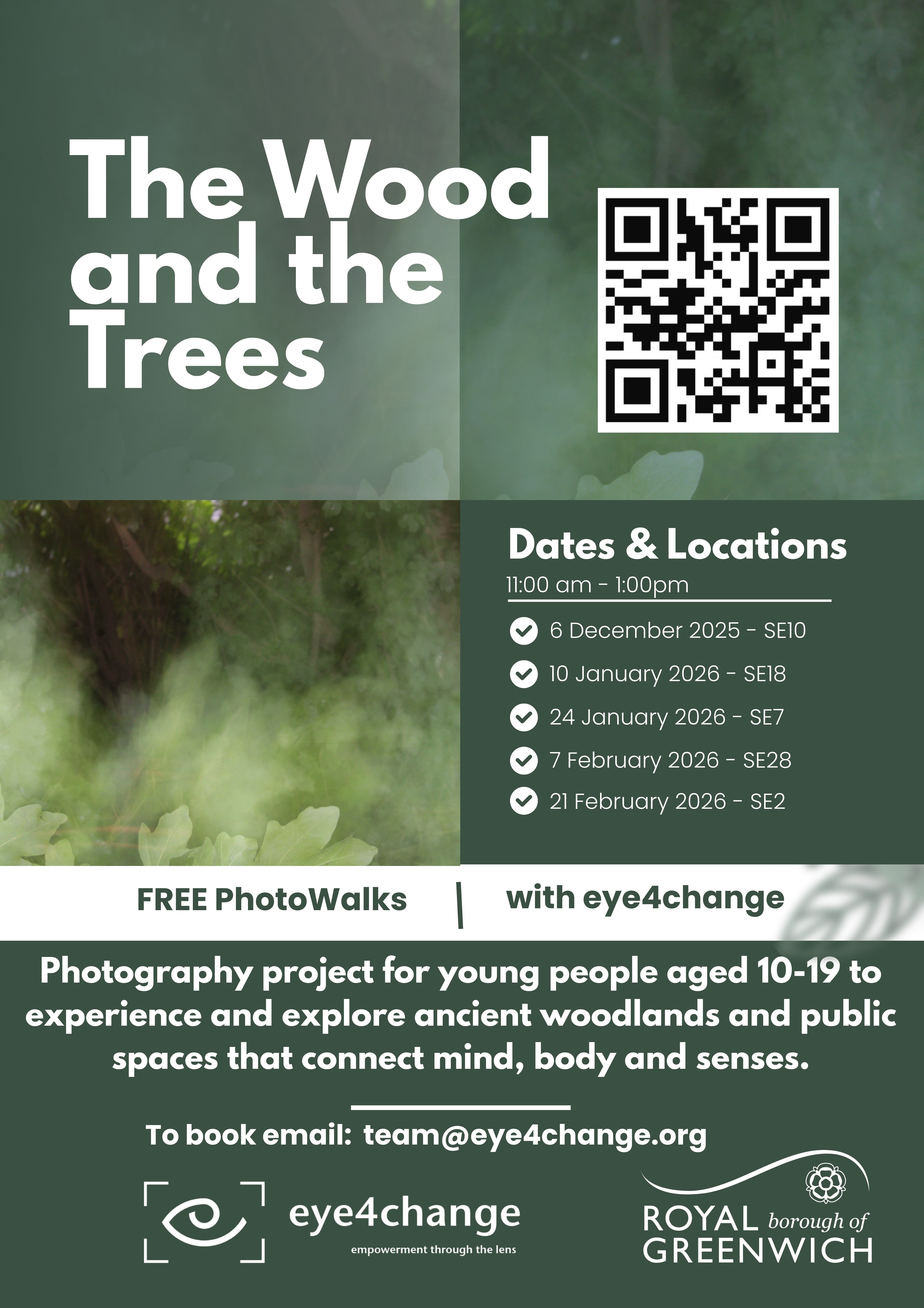 The Wood and the Trees are free photowalks with Eye4Change for young people age 10-19 to experience and explore ancient woodlands and public spaces that connect mind, body and senses. Locations SE10, SE18, SE7, SE28, SE2 To book email: team@eye4change.org