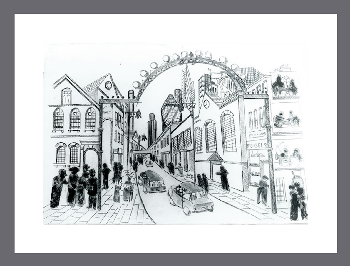 Guided by the question, “If I am only for myself, what am I?” (Hillel, 10 BC), she explored urban landscapes, particularly places of worship and docks—sites of migration and social change. Stewart highlights the immigrant struggle with displacement, cultural shifts, and stereotypes, drawing from her family history and teaching in London’s diverse schools.