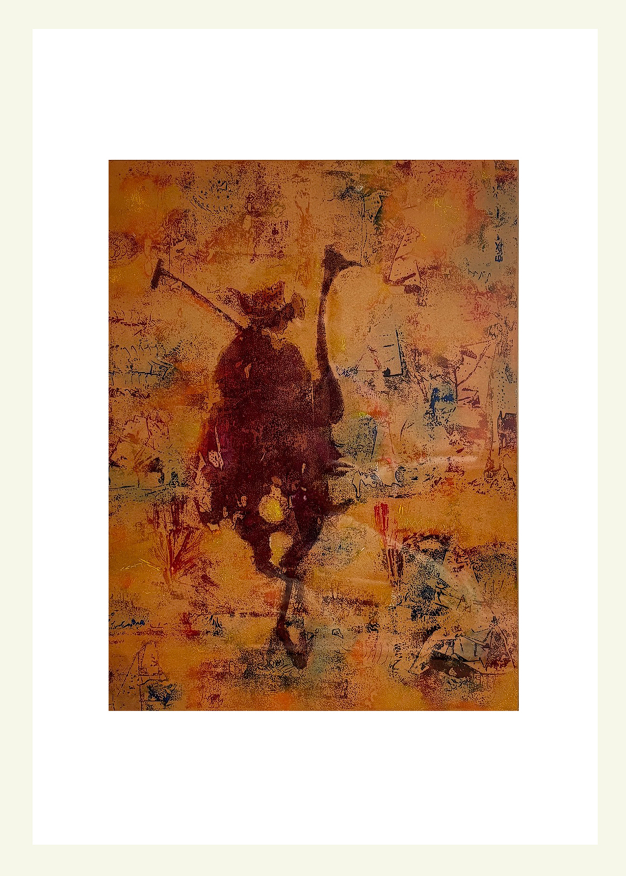 Elena's visual stories continue in her latest series of prints'Walk About'. Her mind ventured through the land of the 'Upside-down', a beloved yet intangible space. The series presents a dozen etchings depicting the imaginary game of ostrich polo set in the dangerous Outback from the perspective of a lost little girl's eyes.