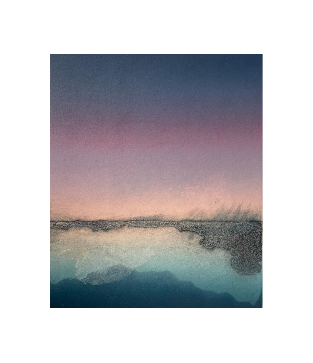 She uses various printing techniques which allow her to explore rich textures, shapes and nuanced colours. Every print she creates is unique as she uses multiple layers of hand mixed colours and torn pieces of paper on each print.