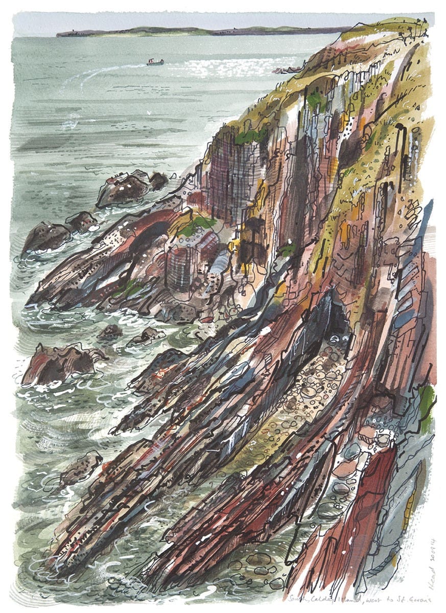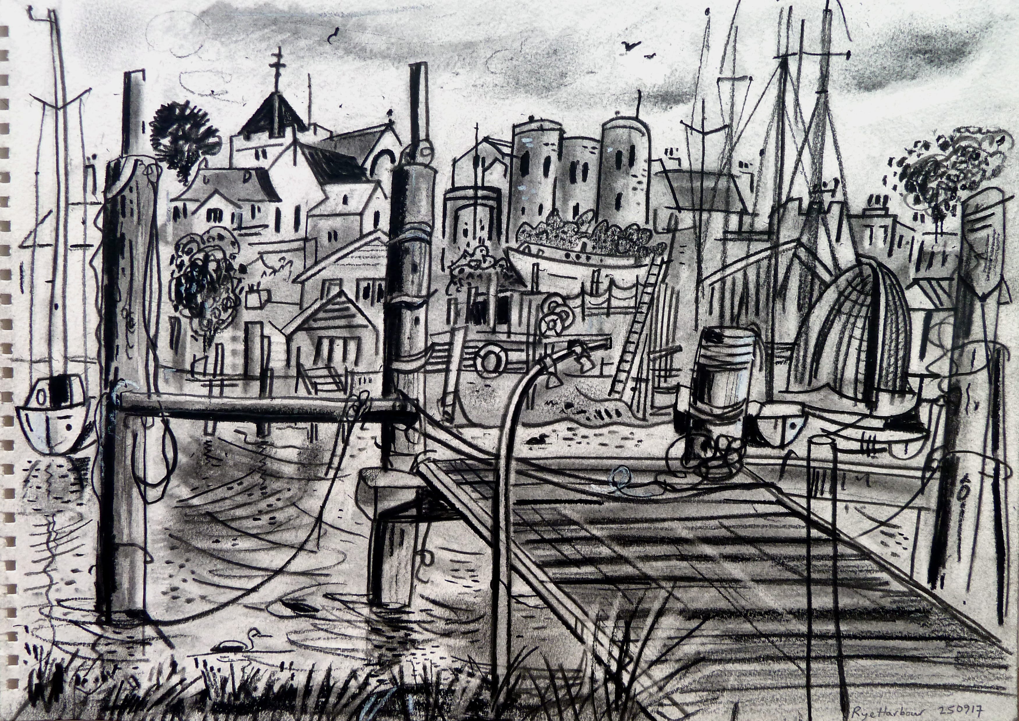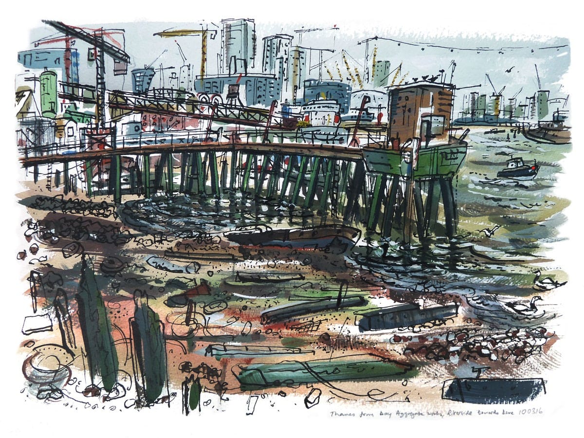 Until now, these drawings have resided in copious sketchbooks, having served a purpose in recording Mick's unique response to the landscape/cityscape and in providing the key direction for resulting printmaking. For Faulting & Folding at Thames-Side Studios Lounge, Mick will present the original works which led on to inform his printmaking alongside other drawn responses to a wide variety of locations.