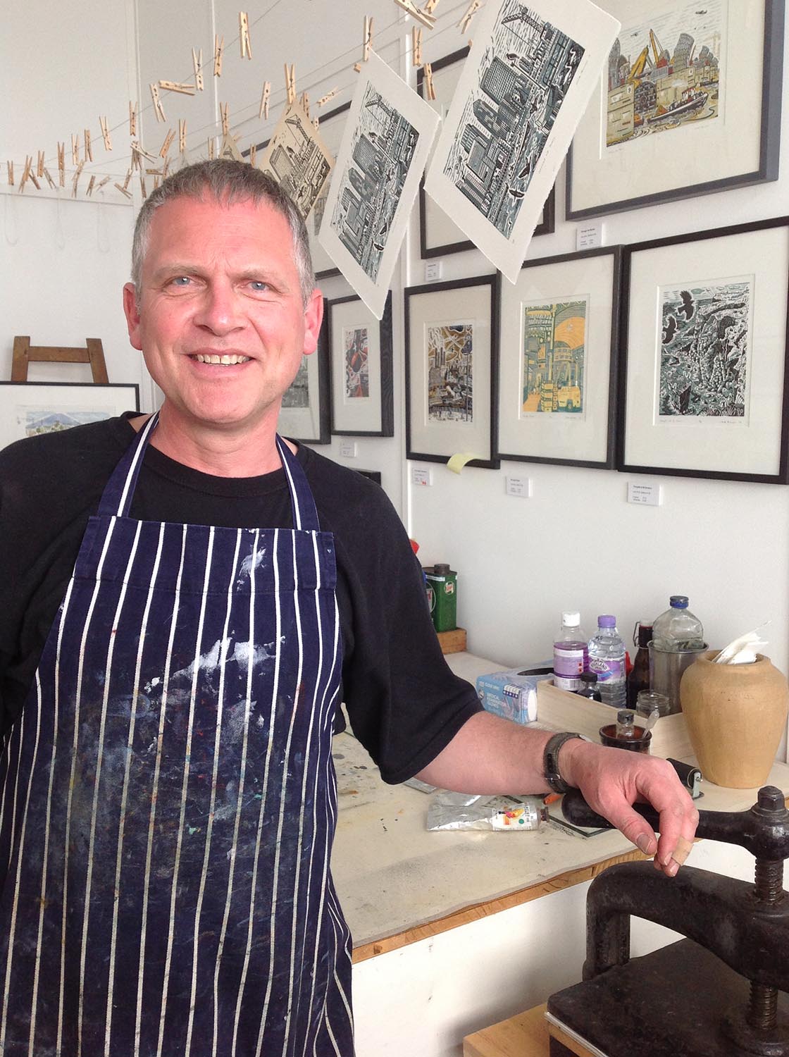 Thames-Side Studios-based Mick Armson's distinctive lino prints and etchings always evolve directly from drawings completed on location.