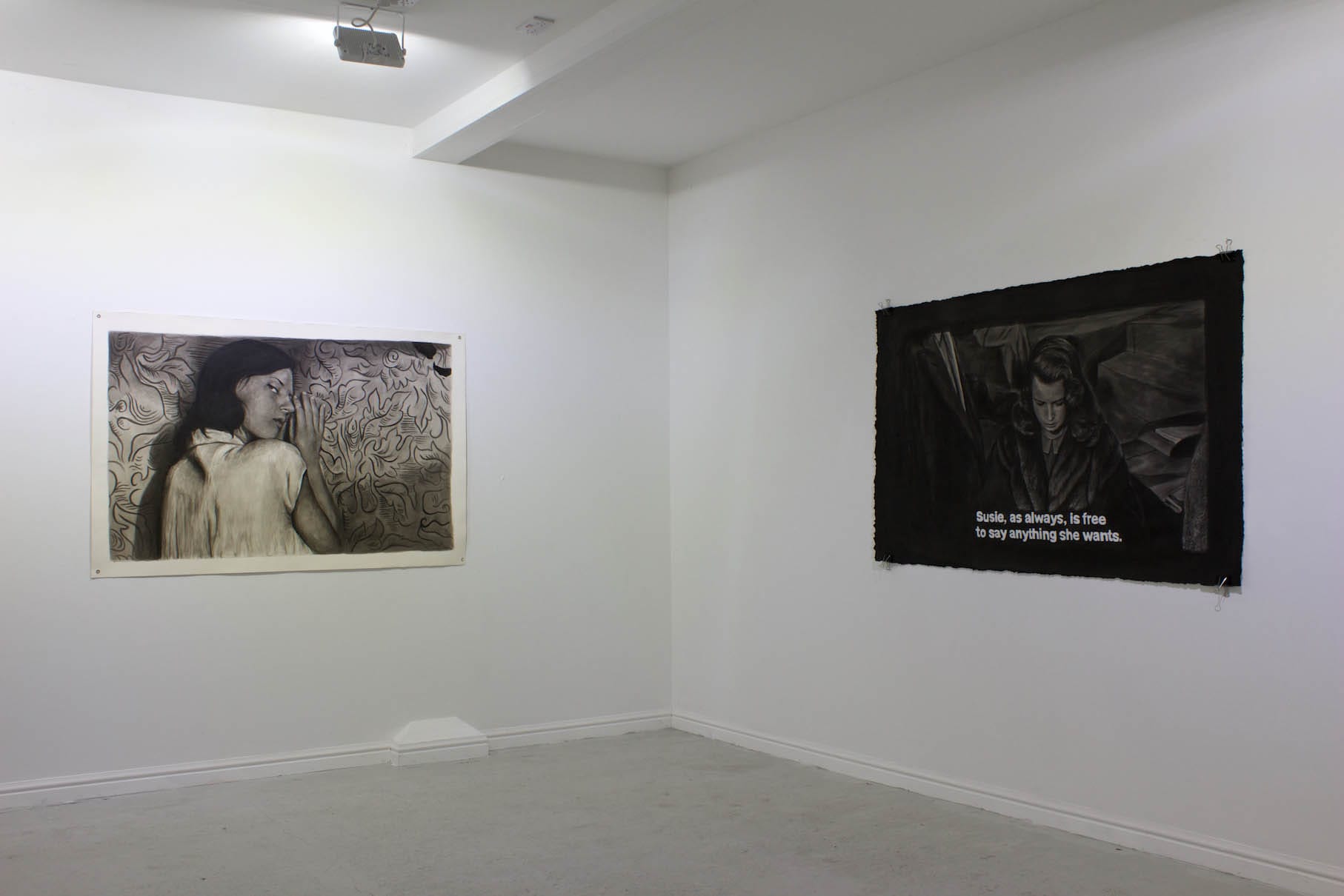 Thames-Side Studios presents Here then, was I / Here now, am I, a group exhibition featuring works by Annette Fernando, Alistair Leys, Sarah 'Kenikie' Palmer, Ema Pina and Helen Wilson. The exhibition brings together a group of artists whose works reflect one's relationship with the outside world through a personal quest into one's self. Inner thoughts and shared aspirations, ubiquitous screens and physical surroundings are presented intertwined. Each artist, guided by their self-awareness, navigates the murky sea of the tangible and the digital world. The show's title is inspired by Virginia Woolf’s extended essay A Room of One's Own (1929) and the docufiction film by Portuguese director Pedro Costa In Vanda's Room (2000). Whereas Woolf critiques the conditions required for the success of female writers, Costa cuts a space for emigrant junkies and the socially excluded. Both resort to fictions within reality in order to carve out a literal and figurative space from where to voice what remains unheard. To have one’s own room is a fundamental desire difficult for millennials to achieve in London, both literally and metaphorically. A desire to reclaim space and time for the individual. Focusing on issues of personal and social identity, the exhibition hopes to highlight the importance of creative work in questioning the ‘self’ and in understanding one's role within society. About the artists: Annette Fernando draws from mediated images, sourced primarily from television and film. She selects the part of the story that resonates with her, whilst bringing to light clichéd depictions of masculinity and femininity embedded within cultures. Annette's work reappropriates images of femininity away from the patriarchal gaze, and by re-exposing these images she calls into question the extent cultural conditioning effects our desires, relationships and the way we behave. annettefernando.carbonmade.com Alistair Leys The contradictory space. The self its place in society and its endlessly multiplying image. The drug fueled selfish hedonism and the selfless activism. The political and the personal. The space of dreams and of concrete. Poetry and pain. Reality and spectacle. The inner and outer. The slow and the fast. The street and the gallery. Alistair's work brings to surface the paradoxes that coexist in our schizoid century and addresses how to represent its feeling and its look. He considers how political issues figure in relation to intimate sexual politics and moments of hallucination. alistairleys.com Sarah 'Kenikie' Palmer's paintings examine the hypnotism of entertainment television. Her work reduces illusionistic scenes from the screen to mesmeric impressions, attempting to expose the TV as a mirror that reflects the isolation and ennui of the habitual watcher. kenikie.com Based at Thames-Side Studios, Ema Pina's paintings oscillate between analytical observations and idle reveries in order to reconcile what something is with what it could be. Wishful-thinking, longing and daydreaming are materialised into objects, bodies and nature. Pina's recent works, like psychological landscapes, evolve from associations made between surfaces, textures and skin, and their relationship to colour, tone and mark. She is interested in the moment when the picture is charged with a ruminative thinking presence. emapina.com Inspired by everyday spaces and how we spend our time, Helen Wilson uses performance, film, drawing and installation to highlight the idiosyncrasies in our society. Her current work explores how people’s relationship to time changes depending on the space they occupy from the fast pace and forward focus of the commuters over London Bridge to mothers in Peckham meandering through the shops. Through performances and daily experiments she explores the essence of time - how to make it, lose it, save it, slow it down and speed it up. helenhelen.co.uk Thames-Side Studios Gallery Thames-Side Studios Harrington Way, Warspite Road Royal Borough of Greenwich London SE18 5NR. Thames-Side Studios Gallery is open Thursday-Sunday 12-5pm during exhibitions, and by appointment. For general Thames-Side Studios Gallery enquiries please email info@thames-sidestudios.co.uk