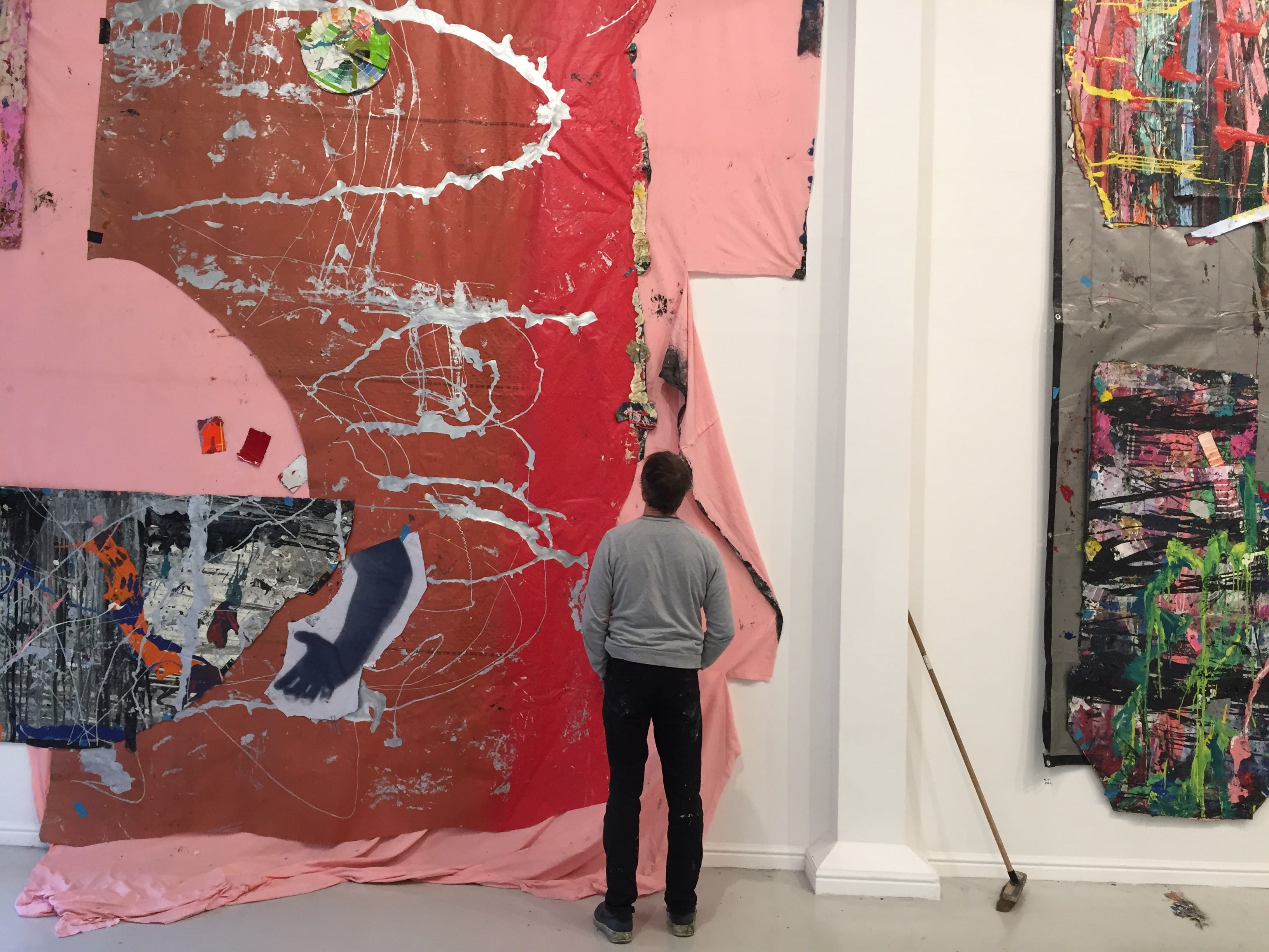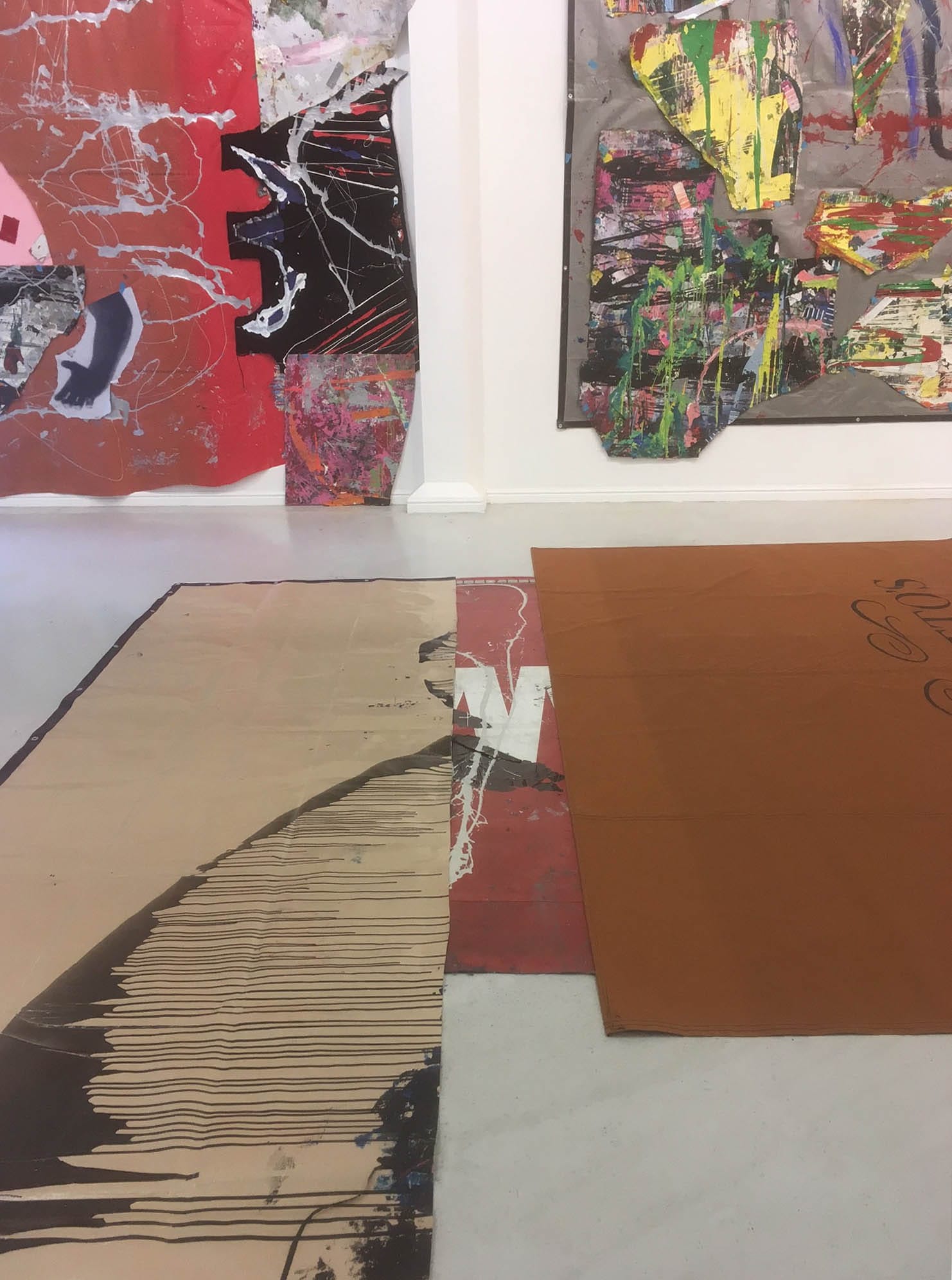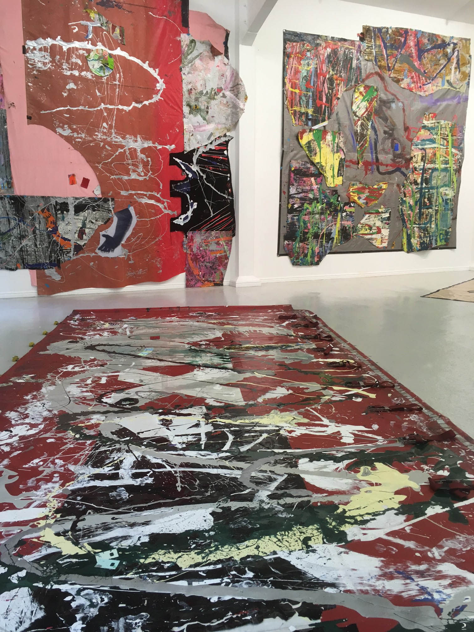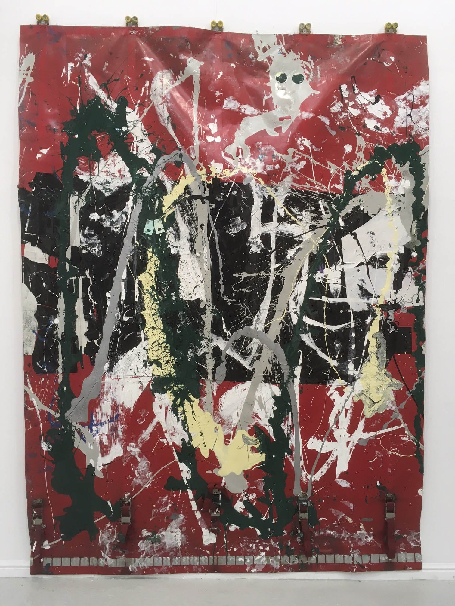 Exhibition Dates: 10 March–1 April 2018 Preview: Friday 9 March 2018, 6.30-8.30pm Howard Dyke presents a new series of large scale paintings and collages based around materiality and the figure, played through the devices of abstraction and gesture. Cut, torn, displaced images are played out on a variety of substrates including translucent, coloured and patterned tarpaulins; a red PVC lorry side curtain split in half, adorned by two monumental imposing figures; and a painting of Fidel Castro made on a 2017 general election aluminium hoarding. Howard Dyke (born 1971) lives and works in London. Exhibitions include Biennale, Drawing Room, London (2017); Self Storage, Ridgeway Road, London (solo, 2017); Residency, Bon Volks, Margate, Kent (2017); The British Society of Self Depreciation, Cheng Centre for Contemporary art, Beijing (2016); KEROSENE, Charlie Dutton Gallery (solo, 2012); London 12, City Art Gallery Prague (2012); Law of the Jungle, Lehman Maupin, New York (2011). Collections include Saatchi Collection, David Roberts Foundation, Simmons & Simmons and Beth de Woody. Thames-Side Studios Gallery Thames-Side Studios Harrington Way, Warspite Road Royal Borough of Greenwich London SE18 5NR. Thames-Side Studios Gallery open Thursday-Sunday 12-5pm during exhibitions and by appointment. For general Thames-Side Studios Gallery enquiries please email info@thames-sidestudios.co.uk Images: Howard Dyke, DOUIN tent paintings, preview; Howard Dyke, Mountains, collage, 40 x 50cm, 2017; United Front, oil and acrylic on polyester, 239 x 258cm, 2011; Global Awning, 2017; studio shot of work being made for DOUIN tent paintings, oil, acrylic and collage on Lorry side curtain, 300 x 400cm (approx), 2018; Castro, oil, acrylic and collage on di-bond aluminium, 244 x 244cm, 2017. All courtesy the artist, 2018, except United Front courtesy the artist and Saatchi Gallery London, 2011. Text stills from The Law Of Surprise an essay on Howard Dykes paintings by Matthew Collings.