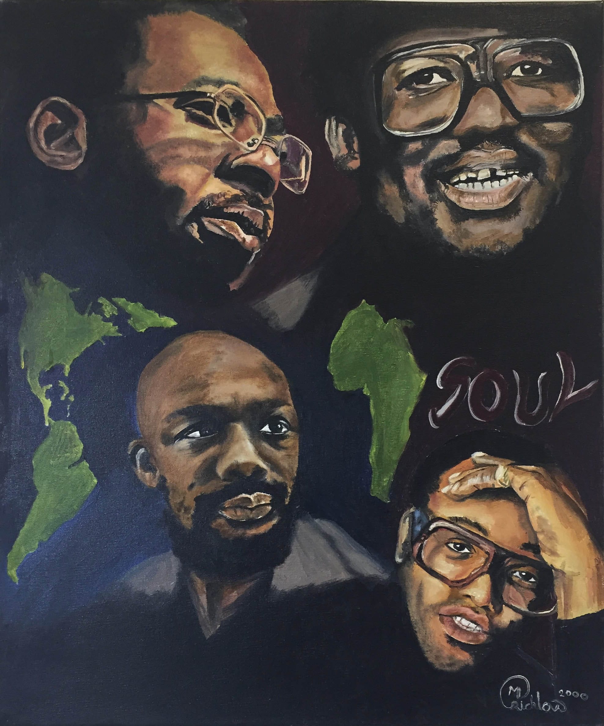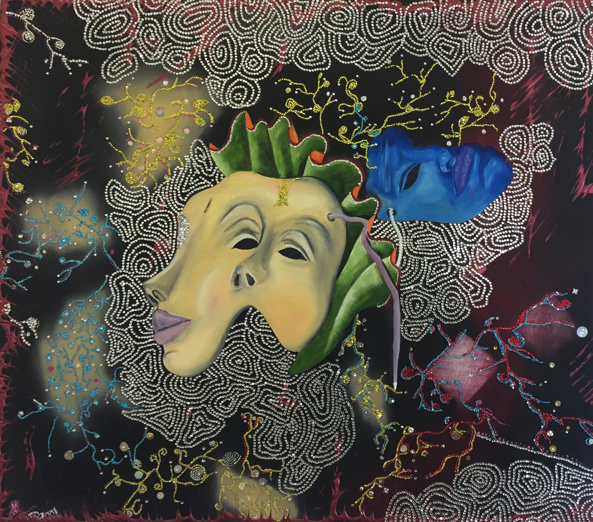 Images: Max Crichlow, Diversity, Thames-Side Studios Lounge, installation view, 2018; Eastern Beauty, oil and mixed media on hardboard; Coloured Maze, mixed media on hardboard; Floating Mask (detail), mixed media on hardboard; Curtis & Friends, oil on canvas; Diversity, installation view, 2018, courtesy the artist.