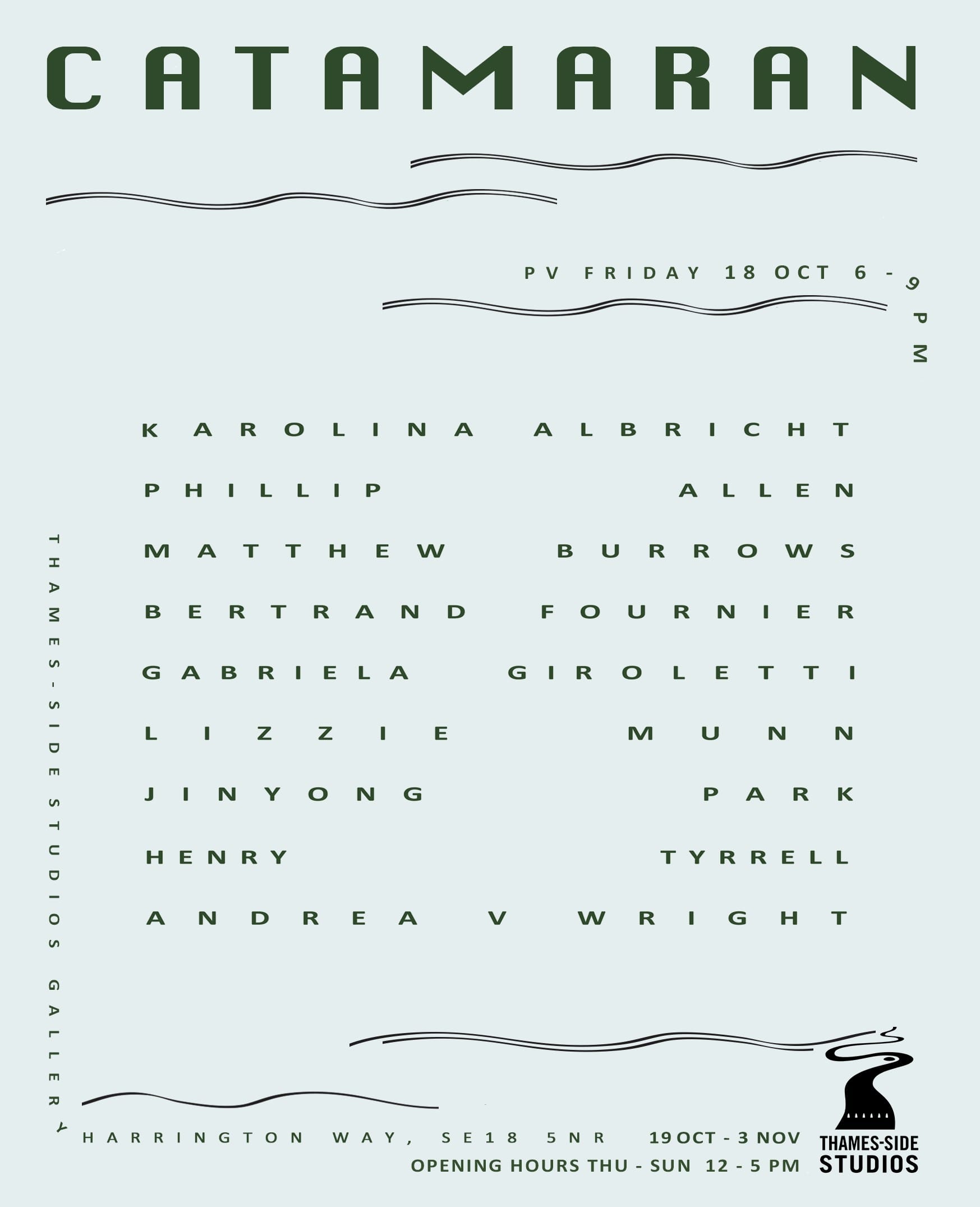 Catamaran Exhibition Dates: 19 October - 3 November 2019 Preview: Friday 18 October 2019, 6-9pm Curated by Karolina Albricht and Gabriela Giroletti Accompanying text by Phil King Karolina Albricht Phillip Allen Matthew Burrows Bertrand Fournier Gabriela Giroletti Lizzie Munn Jinyong Park Henry Tyrrell Andrea V Wright A Catamaran is a type of boat that features two parallel hulls of equal size. It suggests equilibrium and stability, and in this case represents the parallel ideologies between painting and sculpture, particularly in the work of these artists and their shared interests in form and colour. For these artists form and colour is a balancing act, relying on the strength between these two fundamental elements to resist heeling and capsizing. It also draws attention to the site’s proximity to the water. The artists in the exhibition are deeply attracted to materials and processes as well as chance and serendipity, though constantly observing the tension between colour and form as the main component of their work. Karolina Albricht Karolina Albricht was born in Krakow, Poland. In 2008 she graduated with a Master’s Degree from the Academy of Fine Arts in Krakow. In 2007 she completed Socrates-Erasmus at ArtEZ Institute of Fine Arts in Arnhem, the Netherlands. Following her graduation, she moved to London and has lived and worked here since. Albricht is currently doing 2018/2020 Turps Studio Programme in London. She has exhibited across Europe and participated in various competitions including ArtGemini Prize (Public Choice Award) and Arte Laguna Prize. She has been previously shortlisted for the Royal Academy of Arts Summer Exhibition, the Threadneedle Prize and National Open Art Competition. Phillip Allen Phillip is a painter represented by The Approach Gallery London, The Kerlin Gallery Dublin and Luca Tommasi Arte Contemporanea Milan. His work can be seen in major collections including Tate Britain, the Arts Council, the British Academy, the British Council, Government Art Collection, as well as numerous private collections. Phillip is a Course Coordinator at Turps Studio Painting Programme, London, a tutor at the Royal College of Art, a visiting professor of painting at Helsinki Academy of Art as well as visiting tutor at UEL- Wimbledon College of Art, Westminster University. He has also been a visiting lecture at various colleges including The Royal Academy, Ruskin School of Art Oxford and Goldsmiths. Matthew Burrows Matthew Burrows was born in 1971 in the Wirral, UK. He currently lives and works in East Sussex. He studied as an undergraduate at Birmingham School of Art in 1990-93 and graduated with a master’s degree in painting from the Royal College of Art London in 1995. He is represented by Vigo Gallery London. Solo exhibitions include Beyond the Garden Wall Vigo Gallery, London, 2017; Para-Dice Vigo Gallery, London, 2014; Cultic Twister Alexia Goethe Gallery, London, 2009; Anyone Here? Midlands Art Centre, Birmingham, 2003; A Divine Comedy Gloucester Cathedral, touring to Gloucester City Art Gallery, Huddersfield City Art Gallery, 2000-2001. Awards and prizes include; 20016-19 Artist Fellow University of Chichester, 1999-2000 Artist in Residence, Gloucester Cathedral, 1999-2000; 2006 John Moore’s 24, Prize Winner, 2006; Artist's Residency, National Gallery, London, 2000-2001. Teaching experience includes The National Gallery, London; University of Chichester, University of Brighton, University of Central England, Birmingham; Senior Lecturer in Painting and Drawing University of Huddersfield, 1997-2003. Bertrand Fournier Bertrand Fournier (1985, born and live in France) is an autodidact painter. Between abstraction and symbolism, figuration and minimalism, Bertrand Fournier works primarily on colour and its combinations. He is represented by Sebastian Fath Contemporary (Mannheim), The Dot Project (London), WTC The Hague Art Gallery (La Haye), Galeria Miquel Alzueta (Barcelona) and Galerie Details (Paris). Gabriela Giroletti Gabriela Giroletti (b. 1982, Brazil) is a painter based in London. Gabriela has recently graduated from Slade School of Fine Art. She was awarded the Desiree Painting Prize and was an artist in residence at Winsor and Newton in 2017. Recent shows include Of Course I Haven’t Forgotten at 155a Artists Space, Rubber-Chew/Clink, adieu at Unit 1 Gallery | Workshop, The Politics of Too Many Rubbish Dinner Parties at Chalton Gallery and BEEP Wales Painting Biennial. In 2018 she was the runner up for the Chadwell Award, shortlisted for Elephant x Griffin Prize and The Ingram Collection Purchase Prize. She is a 2019 Bloomberg New Contemporaries artist and holds a position as Research Associate at Slade School 2019/20. Lizzie Munn Lizzie Munn completed a BA in Fine Art at Newcastle University in 2018 and currently lives and works in London. She was awarded the Forshaw Residency in 2018, spending a month at the British School at Rome. Recent exhibitions include: PAINT, PS Mirabel, Manchester (2019); the loving treatment, Creekside Projects, London (2019); Enjoy it While it Lasts, Deptford X, London (2018); Ode to Number Four, 36 Gallery, Newcastle (2018). Jinyong Park Jinyong Park (b. 1990) is a South Korean painter based in London. Park approaches the daily use of the language as a phenomenological experience, which is deeply based on her mother language, Korean, where the words are based on the shapes of the speaker’s mouth when pronouncing them. When she moved to London in 2013, her bilingual experience reinforced her interest in the language and brought her painting to a more personal level. Since she graduated from the Royal College of Art in 2015 with her MA in Painting, she has extensively participated in exhibitions, projects and publications. Henry Tyrrell Henry Tyrrell is an artist who lives and works in London. Tyrrell received an MA in Painting from the Slade School of Fine Art in 2018 and a BA in Fine Art from Chelsea College of Art in 2012.
