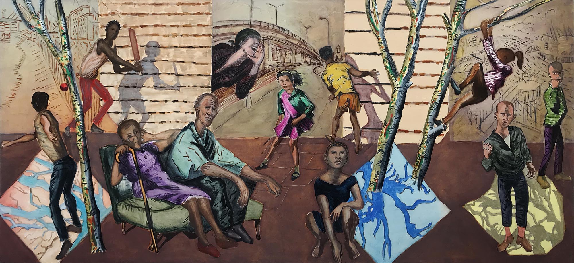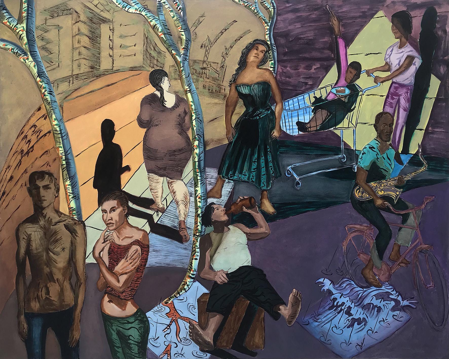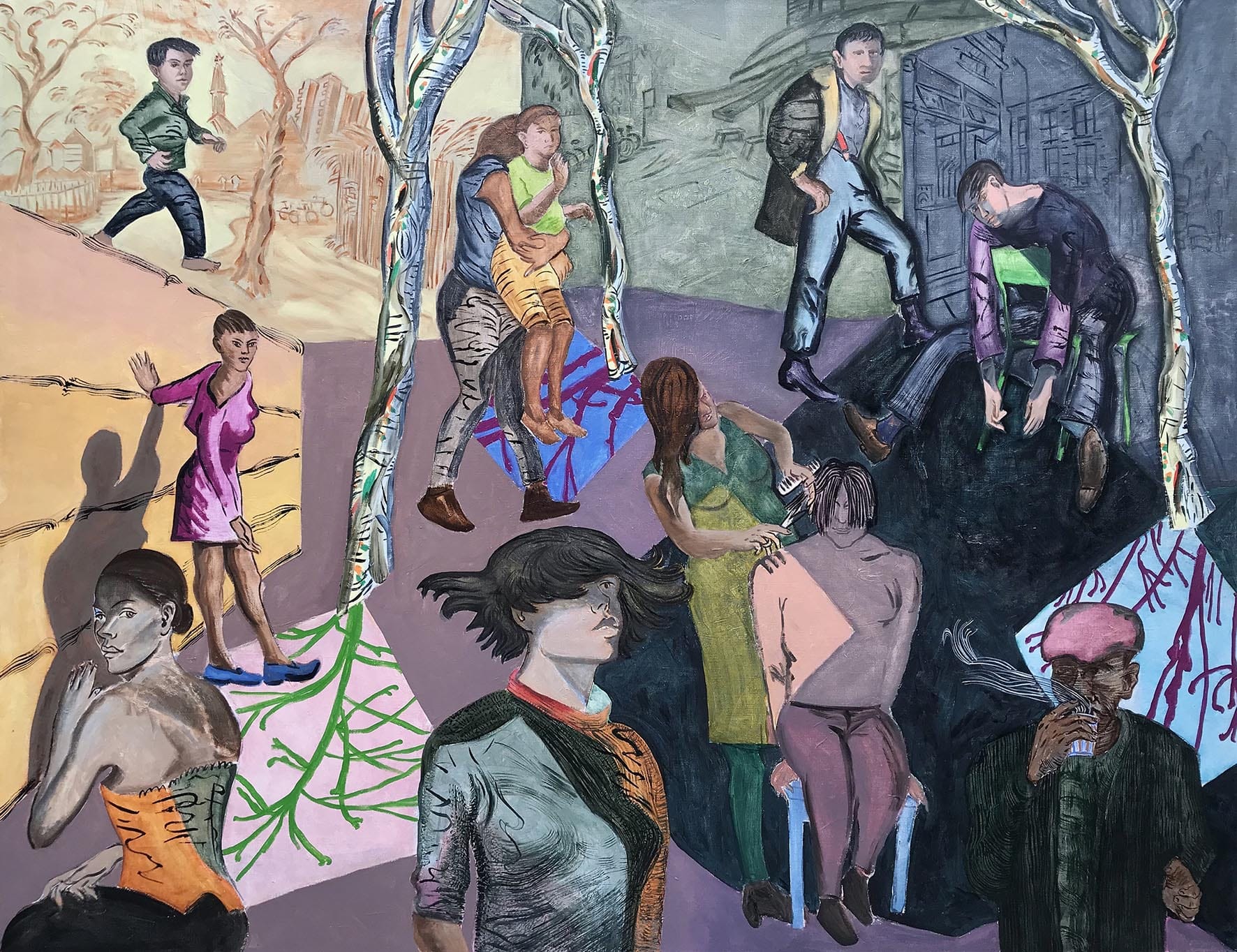 "Painting is a bit like cooking; you can have complicated ingredients and a simple method, or simple ingredients and a complicated method. You can follow a recipe closely or see what’s in the cupboard and use your knowledge, cooking skills and intuition to make a meal. The ingredients for these paintings are found images of people that resonate with my memories and emotions, brought together with cityscapes that I have made on location in East London that carry an emotional bank of knowledge. My painting is a combination of internal and external motivations; the method is to create compositions in a collage technique that is guided more by an internally motivated chem-istry than an externally motivated existing narrative. However the story I want to visualise is about a group of people coming together in a place, maybe with a common purpose, or just brought together by chance; sequential art and murals have influenced the style and making of the work. 'If we imagine what our nation would see as the home of our national character, it would be the small town, not the metropolis, or the wild countryside.' Patrick McCabe, the Irish writer, was in conversation on Radio 3 and this sentence got me thinking about the paintings I was making. Moving into Bromley by Bow in East London in 1986, and joining a newly formed community project, we ran a summer festival in the first year, and building on the success and the sense ‘that when something is born of the community it needs to be repeated’ - we did it the following year and the next 35 years after that. I ran a youth arts project for 11 years, every Thursday 7-9pm, we made murals and large papier-mâché sculptures and sometimes trips out across London. On one occasion the minibus took us past St. Pauls Cathedral, I pointed this out - some of the children responded by saying 'do you mean St Paul’s Way School?' (the local primary school). Despite living in London E3, Zone 3 on the tube line, many local children had not been outside their ‘village’ into the west end. I began to realise that London was like a series of small towns. I think the summer festivals were like a momentary ‘Bubble of Utopia’, a market place for the community, sharing gossip, home made food, creativity and meeting people of different cultures that live on the same street. In fact a healthy community needs gateway experiences that become part of the narrative of neighbourhood life, these events that are like safe spaces create lasting friendships. Being curious and observing people together socialising or working together I began to notice the characters I was creating in my drawing reflected different kinds of personality traits: (I stumbled across the theory of ‘Big Five’ personality traits) Extroversion, Open-ness to experience, Agreeableness, Conscientiousness, Neuroticisms. For me painting deals with how I negotiate these preoccupations about community life into pictorial space. Recent months have demonstrated that our health and a healthy life style is clearly connected to being together with people and with our relationships in the community. Just like the community festival that I experienced being part of over many years, the current paintings in this show are titled after other places, events and moments I have observed: the Comedy Club, Lower Clapton Road Pond, Bow Flyover, By The River Thames, Palm 2 shop, House of Lower Clapton, Coffee at Canary Wharf." Frank Creber, June 2020 Frank Creber is based at Thames-Side Studios. For more on Frank's work visit www.frankcreber.space Thames-Side Studios Gallery Thames-Side Studios Harrington Way, Warspite Road Royal Borough of Greenwich London SE18 5NR. Thames-Side Studios Gallery open Thursday-Sunday 12-5pm during exhibitions and by appointment. For general Thames-Side Studios Gallery enquiries please email info@thames-sidestudios.co.uk