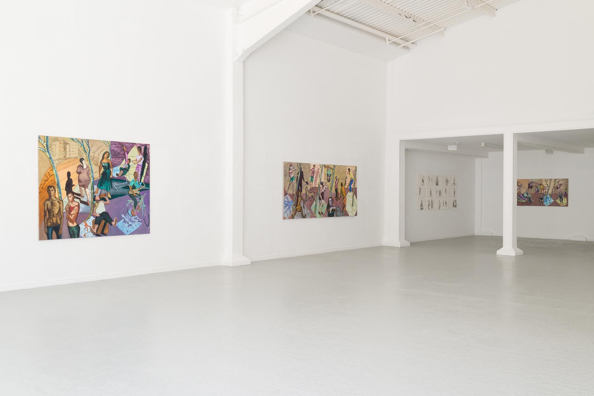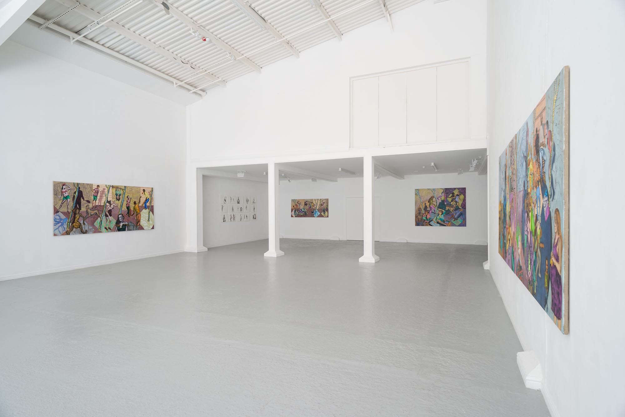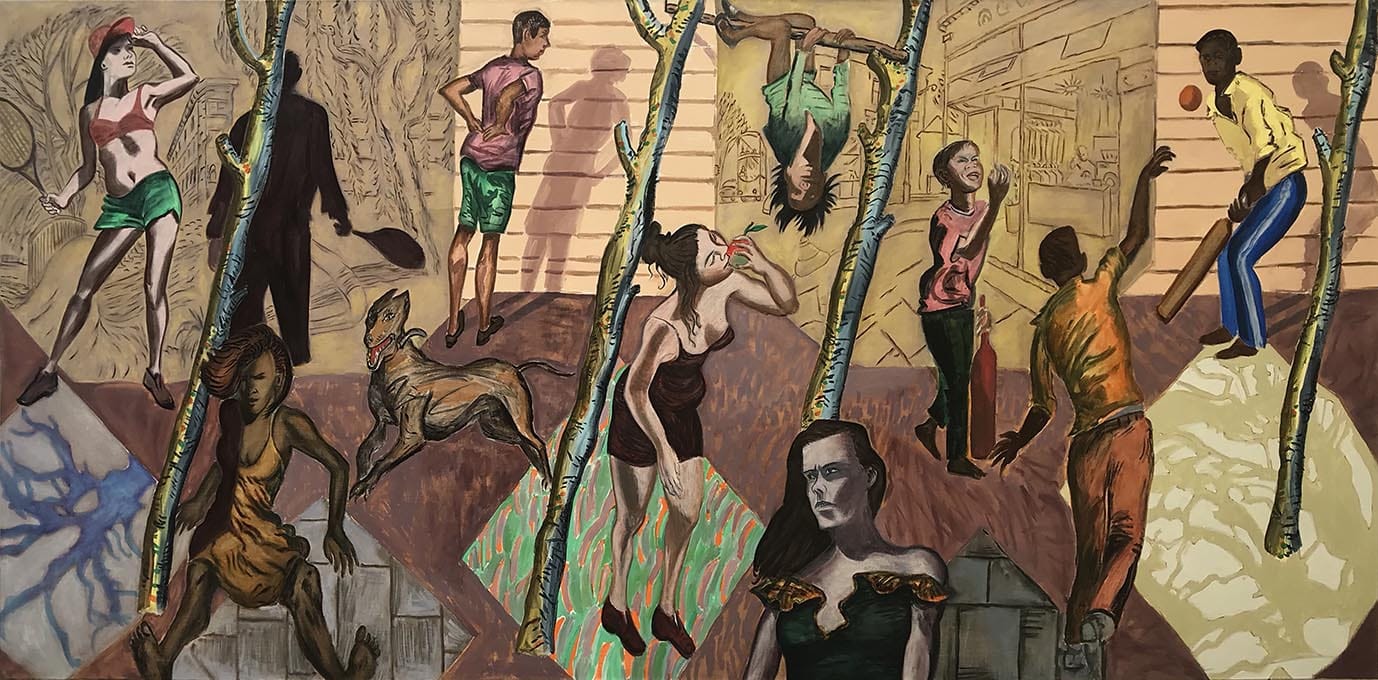 "Painting is a bit like cooking; you can have complicated ingredients and a simple method, or simple ingredients and a complicated method. You can follow a recipe closely or see what’s in the cupboard and use your knowledge, cooking skills and intuition to make a meal. The ingredients for these paintings are found images of people that resonate with my memories and emotions, brought together with cityscapes that I have made on location in East London that carry an emotional bank of knowledge. My painting is a combination of internal and external motivations; the method is to create compositions in a collage technique that is guided more by an internally motivated chem-istry than an externally motivated existing narrative. However the story I want to visualise is about a group of people coming together in a place, maybe with a common purpose, or just brought together by chance; sequential art and murals have influenced the style and making of the work. 'If we imagine what our nation would see as the home of our national character, it would be the small town, not the metropolis, or the wild countryside.' Patrick McCabe, the Irish writer, was in conversation on Radio 3 and this sentence got me thinking about the paintings I was making. Moving into Bromley by Bow in East London in 1986, and joining a newly formed community project, we ran a summer festival in the first year, and building on the success and the sense ‘that when something is born of the community it needs to be repeated’ - we did it the following year and the next 35 years after that. I ran a youth arts project for 11 years, every Thursday 7-9pm, we made murals and large papier-mâché sculptures and sometimes trips out across London. On one occasion the minibus took us past St. Pauls Cathedral, I pointed this out - some of the children responded by saying 'do you mean St Paul’s Way School?' (the local primary school). Despite living in London E3, Zone 3 on the tube line, many local children had not been outside their ‘village’ into the west end. I began to realise that London was like a series of small towns. I think the summer festivals were like a momentary ‘Bubble of Utopia’, a market place for the community, sharing gossip, home made food, creativity and meeting people of different cultures that live on the same street. In fact a healthy community needs gateway experiences that become part of the narrative of neighbourhood life, these events that are like safe spaces create lasting friendships. Being curious and observing people together socialising or working together I began to notice the characters I was creating in my drawing reflected different kinds of personality traits: (I stumbled across the theory of ‘Big Five’ personality traits) Extroversion, Open-ness to experience, Agreeableness, Conscientiousness, Neuroticisms. For me painting deals with how I negotiate these preoccupations about community life into pictorial space. Recent months have demonstrated that our health and a healthy life style is clearly connected to being together with people and with our relationships in the community. Just like the community festival that I experienced being part of over many years, the current paintings in this show are titled after other places, events and moments I have observed: the Comedy Club, Lower Clapton Road Pond, Bow Flyover, By The River Thames, Palm 2 shop, House of Lower Clapton, Coffee at Canary Wharf." Frank Creber, June 2020 Frank Creber is based at Thames-Side Studios. For more on Frank's work visit www.frankcreber.space Thames-Side Studios Gallery Thames-Side Studios Harrington Way, Warspite Road Royal Borough of Greenwich London SE18 5NR. Thames-Side Studios Gallery open Thursday-Sunday 12-5pm during exhibitions and by appointment. For general Thames-Side Studios Gallery enquiries please email info@thames-sidestudios.co.uk