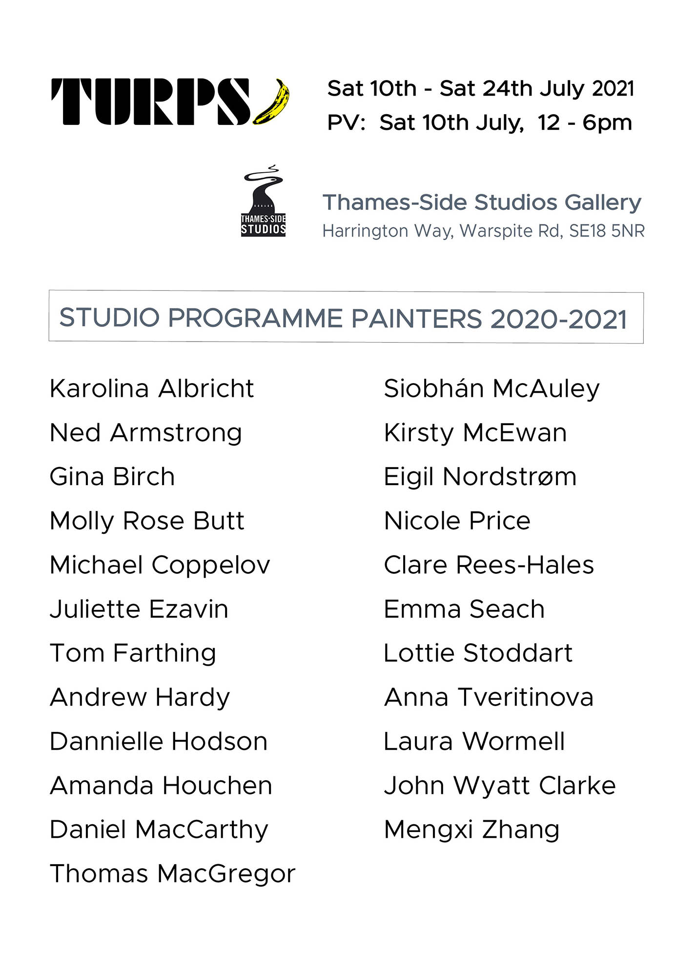 Turps Studio Programme brings together their 23 painters in Turps Leavers Show. This exhibition will unite leavers from both 2020 and 2021 and will be accompanied by a catalogue. Coinciding with the opening day will be the launch of Turps Magazine Issue 24. Turps Studio Programme is a unique opportunity for a select group of painters to take up residence in their own dedicated studios within an exciting studio and gallery development in London. It’s designed to fulfil a fundamental and broad view of what we believe a solid painting programme requires by creating an environment that parallels the studio practice of an independent artist, within the supportive structure of an intensive mentoring programme. The gallery will be open to visitors with Covid safety measures in place. We would ask that all visitors wear masks at all times inside the gallery and maintain social distancing during their visit. Entry to the space will be limited to a twenty person capacity at any one time and you may have to wait for a short time outside the gallery for access. Thames-Side Studios Gallery Thames-Side Studios Harrington Way, Warspite Road Royal Borough of Greenwich London SE18 5NR. Thames-Side Studios Gallery open Thursday-Sunday 12-5pm during exhibitions and by appointment. For general Thames-Side Studios Gallery enquiries please email info@thames-sidestudios.co.uk