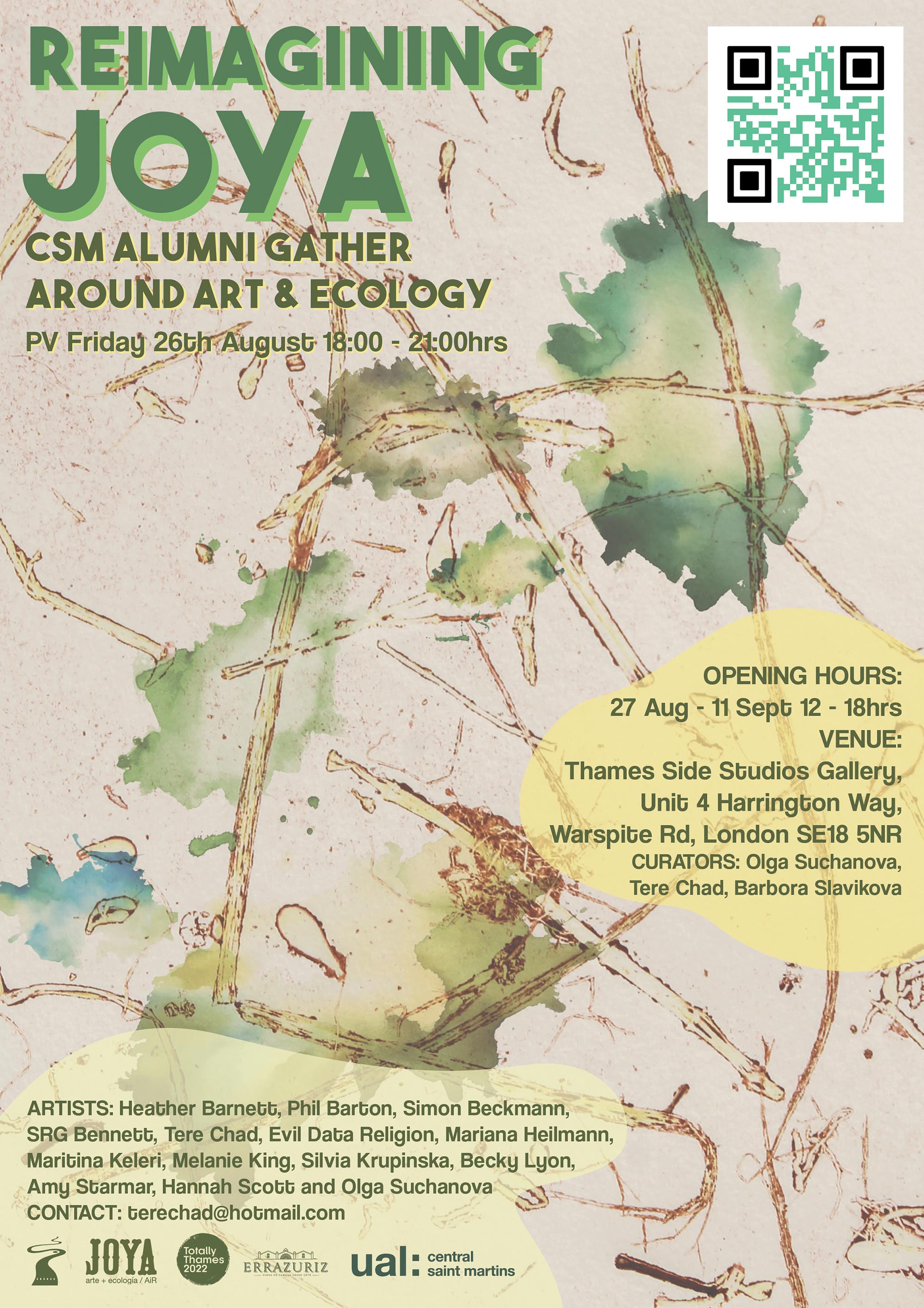 Reimagining Joya is an exhibition inspired by the experiences and artistic responses of a group of artists who have all participated in Joya: Art + Ecology / AiR residency. Joya is a multidisciplinary arts residency, which offers a place to develop creativity in the natural environment of Andalucía in Spain. The curators, Olga Suchanova, Tere Chad and Barbara Slavikova, have selected a body of works which explore the way we inhabit, survey, feel, and relate to the natural landscape and its living creatures. During the exhibition the artists will be hosting the following workshops and public events: