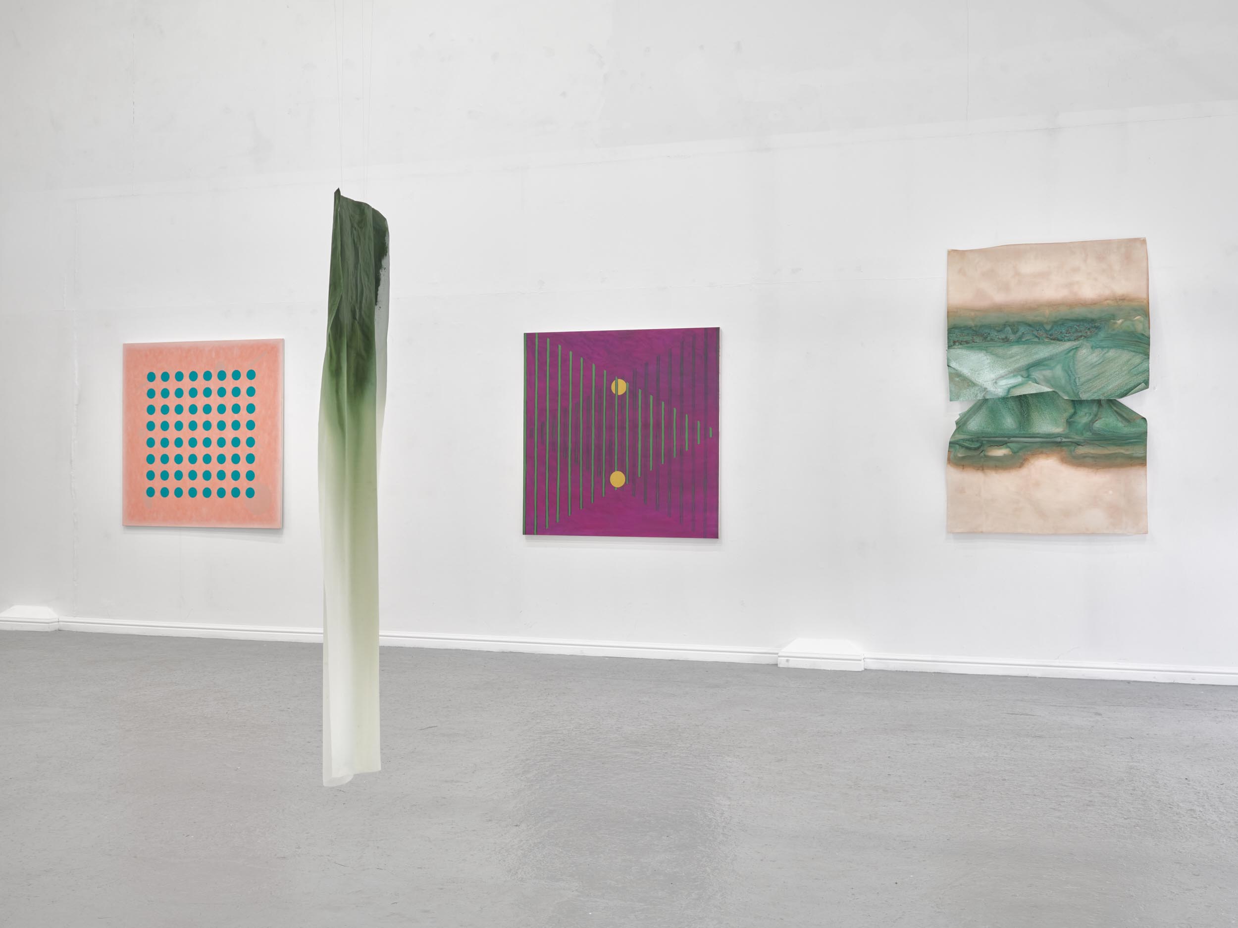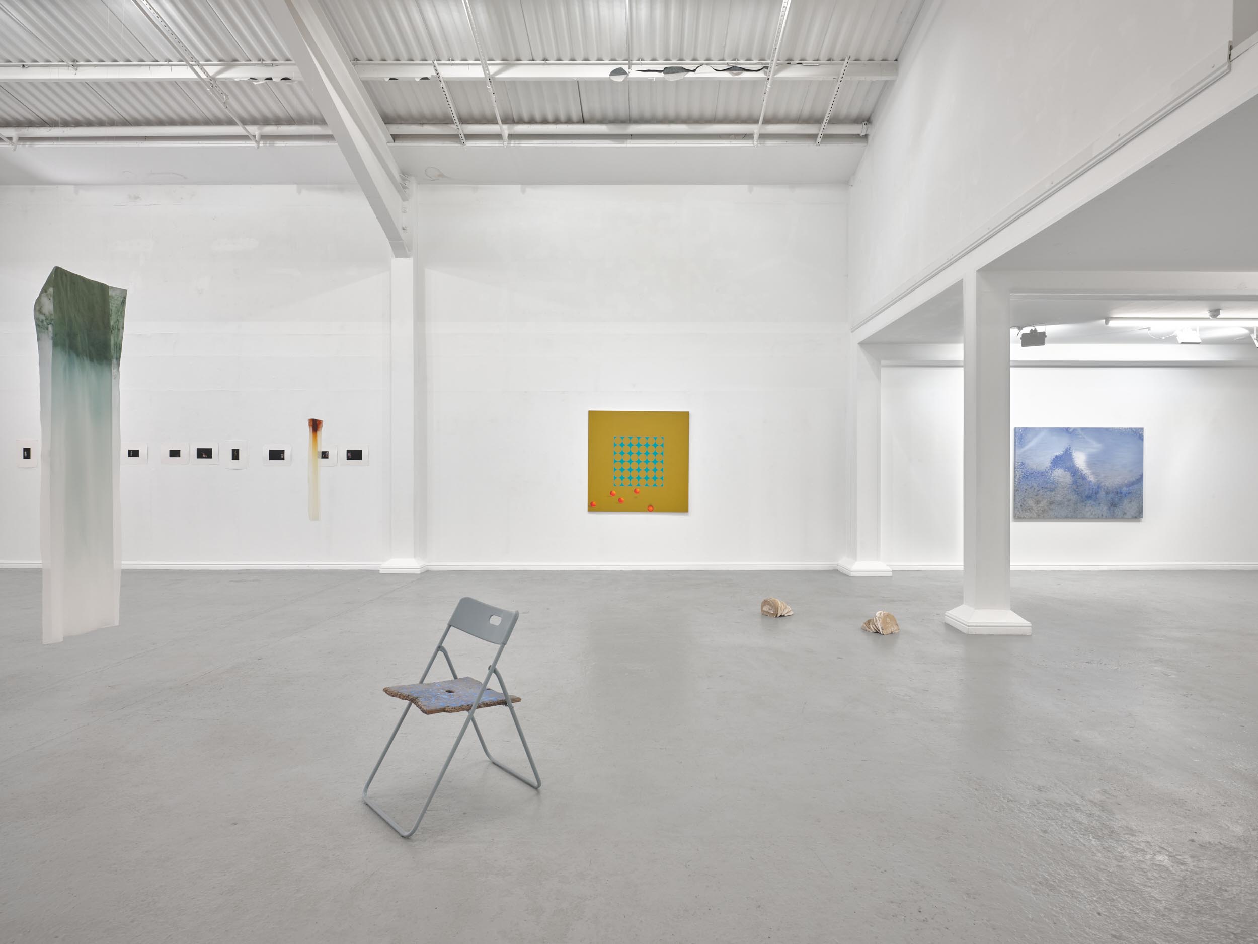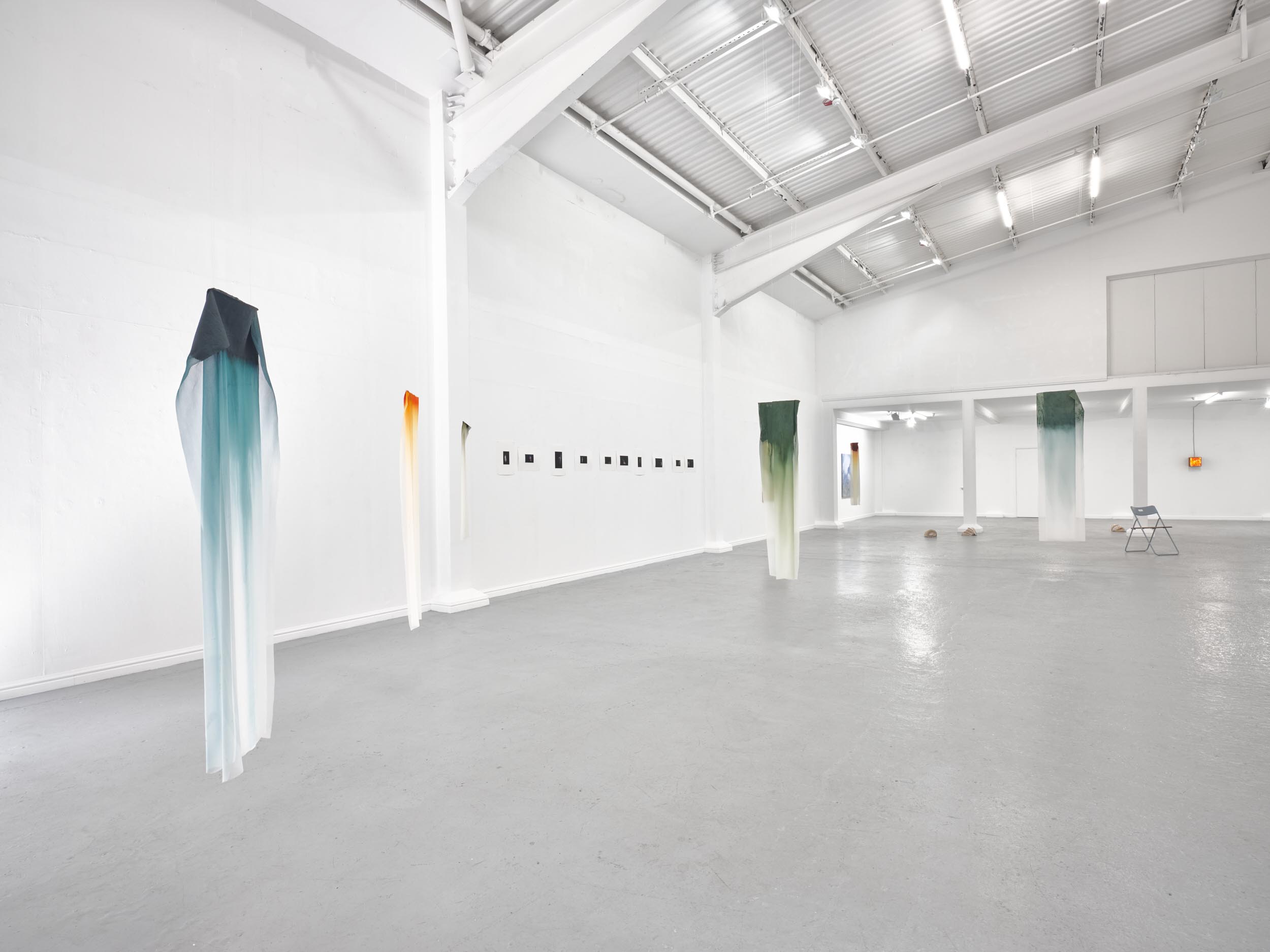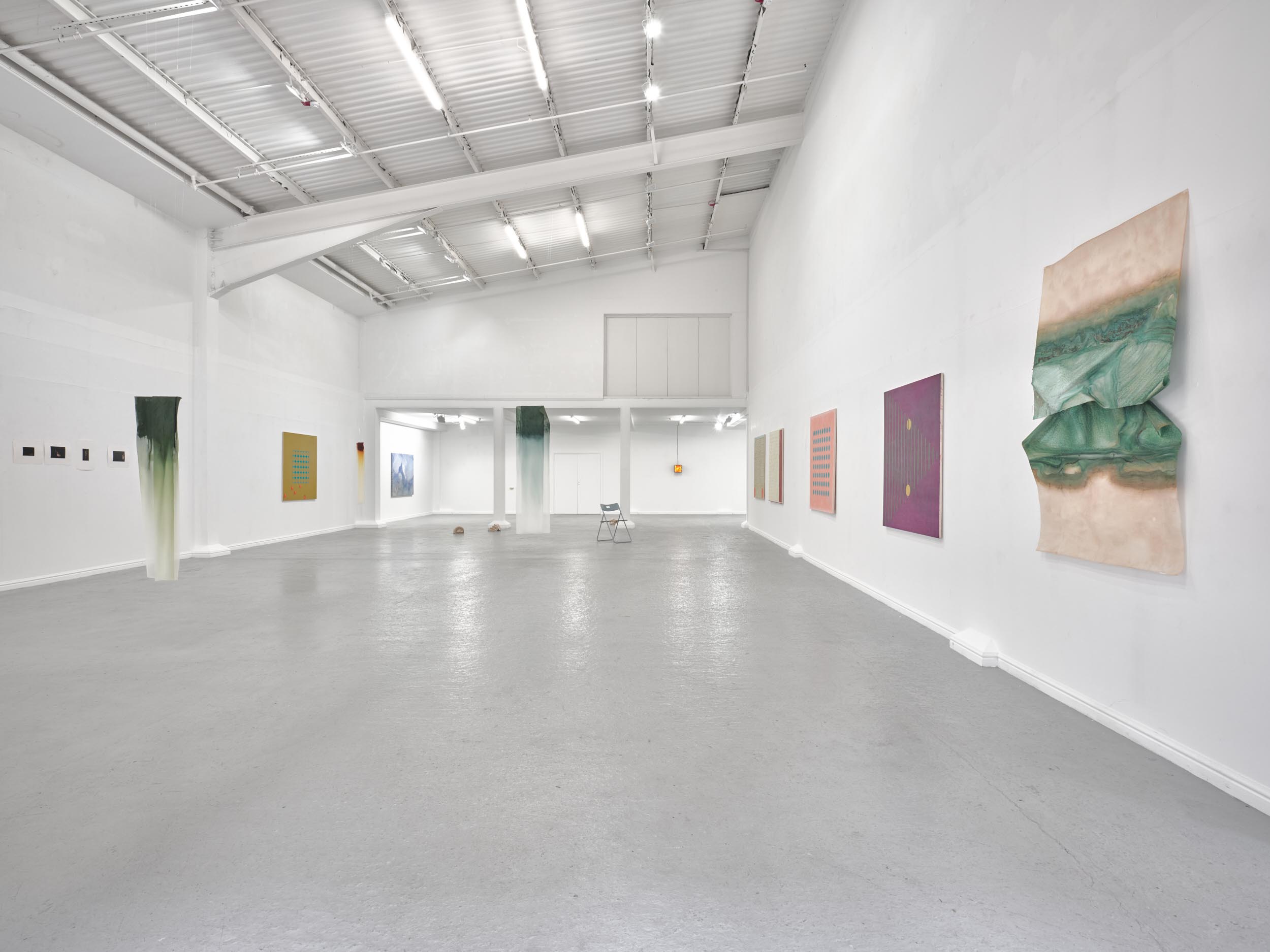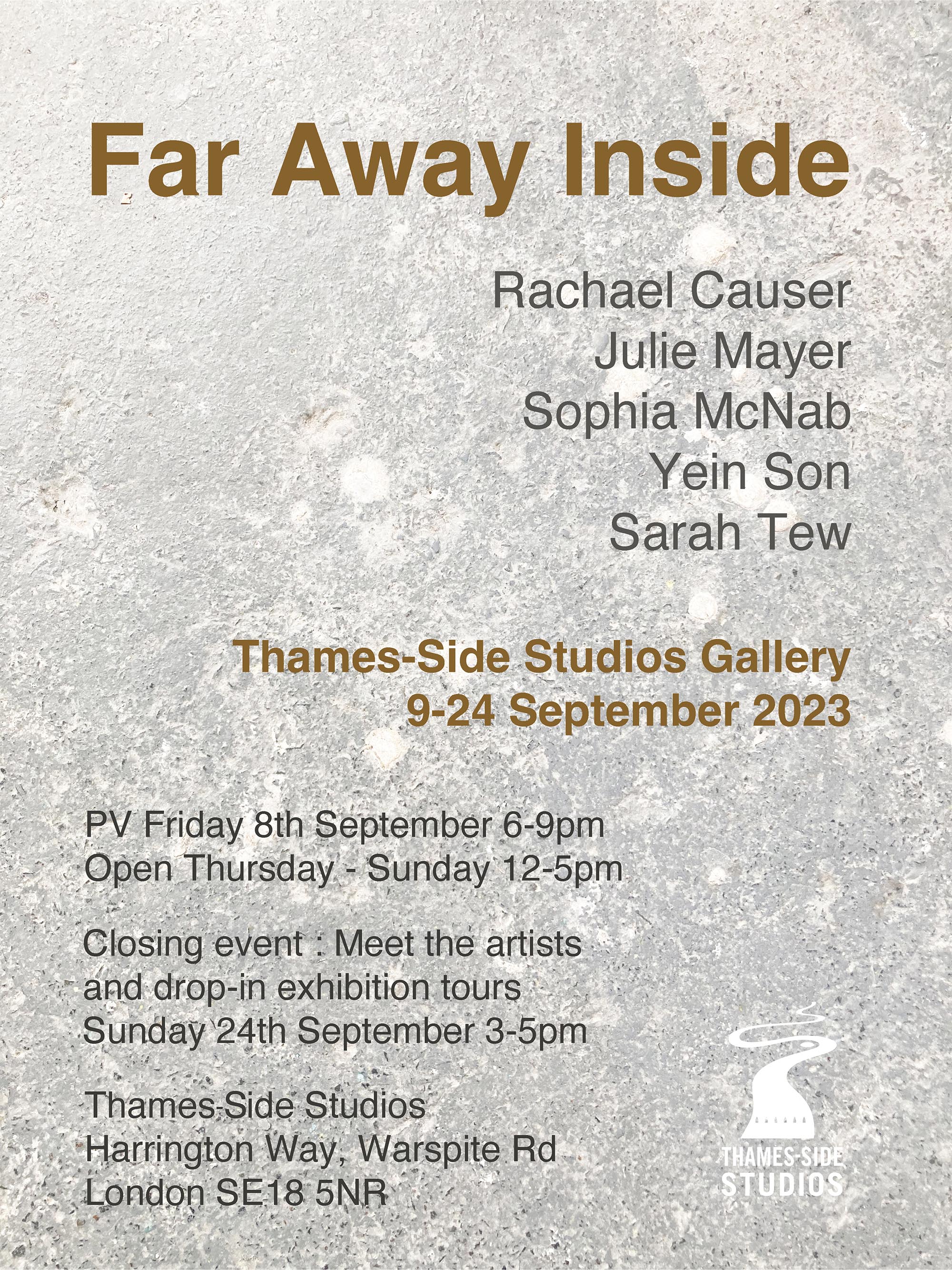 Far Away Inside brings together works by Rachael Causer, Julie Mayer, Sophia McNab, Yein Son and Sarah Tew. Material affinities and gut feeling have been a strong driving force in creating this exhibition. If things are stuck, they’re not stuck for long. Through ideas of skin, landscape, the domestic and ritual, these artists are harnessing their sensitivity to, and are highlighting, the crashing tectonics of attempts to understand the world around us. Both meaning and substance appear to crack, opening up alternative terrains which give a shifted view of what we take for granted in the act of seeing. Eyes becoming attuned to nuance, sensation, vibration listening to what the world has to say. If things are stuck, they’re not stuck for long. The exhibition encompasses painting, printmaking and sculpture. Within these disciplines boundaries are blurred and celebrated: we glimpse into Sophia McNab’s monoprints which feel momentary, yet also Yein Son’s works on fine fabric which give an arresting view of a vast terrain of other worldly skin; we see languages colliding within Julie Mayer’s paintings through pattern and lost sequences, but also the vicissitudes of time captured and held within the textile installations of Sarah Tew, with their residual nature suggesting a freshwater stream. Compare this to Racheal Causer’s sculptures which tell stories through an accumulation of time and debris (which has then been reformed) and we see the breadth of approaches taken here. Rachael Causer is an artist living and working in London. Her practice explores the ways human and non-human activities intertwine and is a subtle nod to the tenuous line we tread between co-existing and colliding fragile ecologies. Her sculptures stem from the familiar but bridge into the unfamiliar, witnessing breakage, scattering, dissolving and transformation over time. She graduated from Camberwell College of Art, with an MA in Fine Art in 2020, and was a member of the MASS Sculpture Programme in 2021-23. www.rachaelcauser.com Julie Mayer is an abstract painter whose practice is rooted in traditional materials, processes, and histories of modernist geometric painting. Interrupted patterns combine with colour combinations, which are drawn from observations of domestic, urban and coastal landscapes and the traditions of colour theory (such as the work of Josef Albers and Sanzo Wada). The combinations are then translated into a limited palette and complex geometry which references a ‘site’ of a lived experience within the painting. Julie now lives and works in Preston and completed an MA in Fine Art at University of Central Lancashire in 2019. www.juliemayer.org Sophia McNab is an artist based in Hastings, East Sussex, with an MA in Fine Art from City & Guilds of London Art School. Sophia's work spans printmaking, collage and stitching to explore memory, agency and our relationship to landscape. She draws on a family archive of photographs and postcards, as well as natural and found materials. Lost and remembered landscapes are evoked through thoughtful material exploration. Exhibitions include North Coast Asylum, Newquay; Warbling Collective, London; Phoenix Art Space, Brighton; Blue Shop Galleries and Woolwich Contemporary Print Fair, London. www.sophiamcnab.com Central to Yein Son's work is the physical analogy between the surface of a painting and bodily skin, its relevant metaphors, and interpretations. In addition to the painting's materiality and 'skin-like' tactility, she has considered the symbolic value of 'skin' as a medium and painting method. Using psychoanalyst Didier Anzieu's concept of the 'skin-ego', she has investigated the metaphor of skin as a thin interface between inner and outer. She has extrapolated this to develop a painting practice with a specific haptic visual vocabulary based on layering. Yein now lives and works in Seoul after completing her PhD at the Slade School of Fine Art, UCL, in 2022. www.ucl.ac.uk/slade/research/mphil-phd/yein-son Sarah Tew was brought up in the Cumbrian Lake District, North West England. She now lives and works in London, graduating from Slade School of Fine Art, MFA Fine Art in 2019. Her practice incorporates painting, installation, and site-responsive work. The physical interactions of materials and time play a central role in her making, exploring their inheritance of cultural and historical contexts in relation to landscape painting. Recent works explore the potential of watercolour in largescale silk painting. Recent awards include the Boise Travel Scholarship 2019 which funded a residency at Arts Letters & Numbers in upstate New York 2020, with explorations into Thomas Cole’s landscapes of the Catskills and The Hudson River School. www.sarahtew.co.uk Thames-Side Studios Gallery Thames-Side Studios Harrington Way, Warspite Road Royal Borough of Greenwich London SE18 5NR. Thames-Side Studios Gallery open Thursday-Sunday 12-5pm during exhibitions and by appointment. For general Thames-Side Studios Gallery enquiries please email info@thames-sidestudios.co.uk