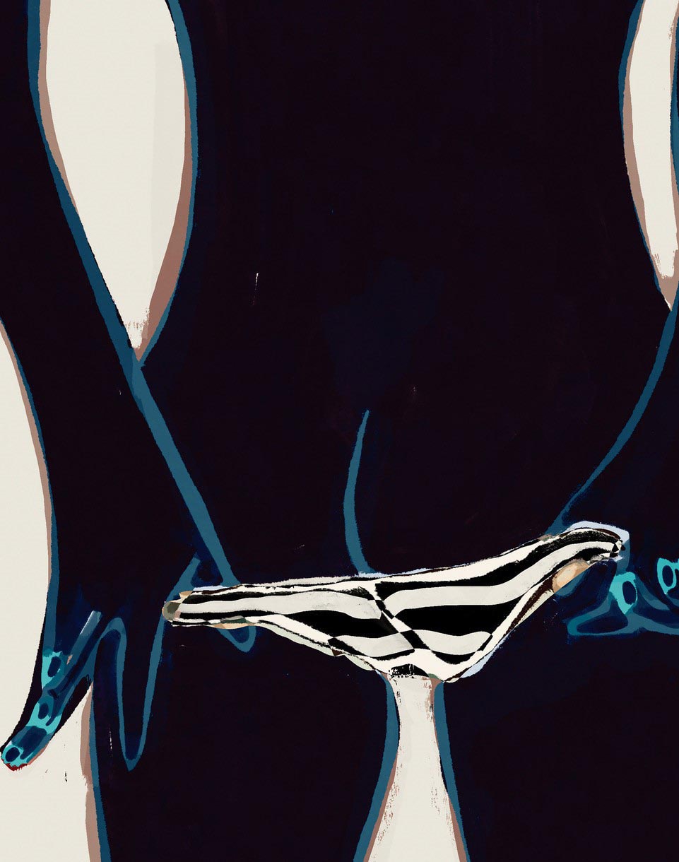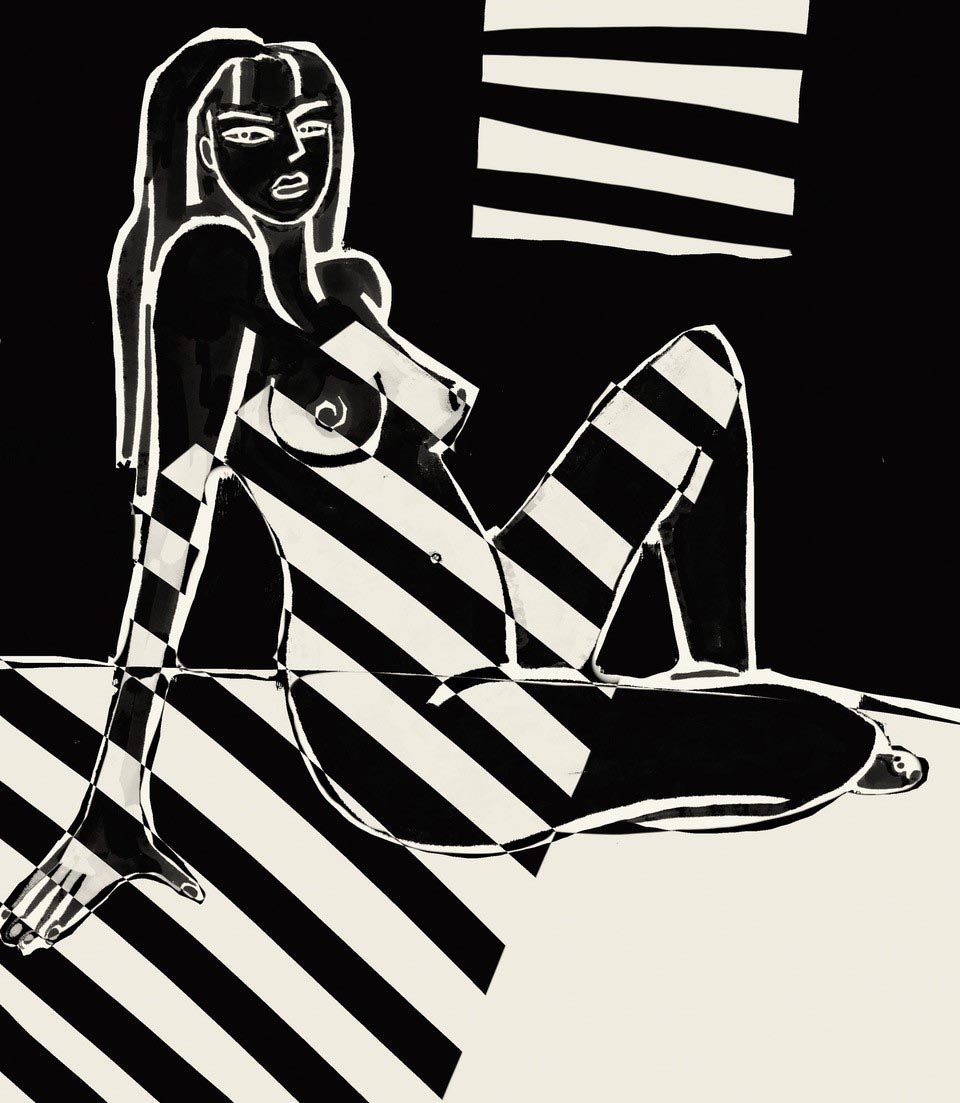 Juliet is known for her stylised, simplified use of line and contrast portraying a variety of subject matter. She places an emphasis on light and shadow interplaying with the subject’s relationship within the space it occupies. The results of her battle to outwit the censors creates and extra layer to the experience of seeing a painting and how we interpret what is acceptable versus explicit and unacceptable.