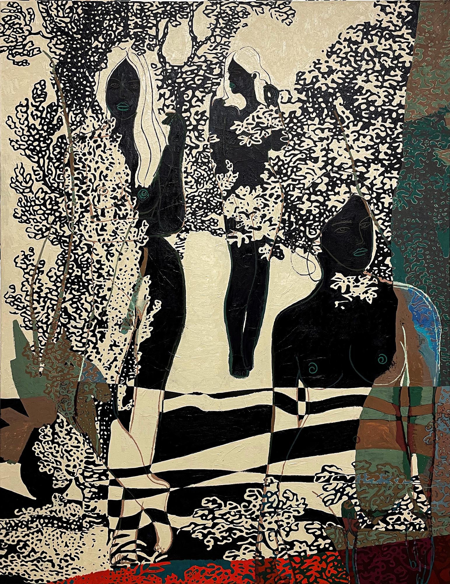 This exhibition includes examples of ways that Juliet has attempted to beat the algorithms to ensure her work remains available for all to see. Tactics include incorporating the 'red dots of doom' (circles that obscure and censor the body) into paintings as a subversive tactic to draw attention to the body, and creating elaborate repeat patterns and reversed images akin to the concept of World War II dazzle ships.