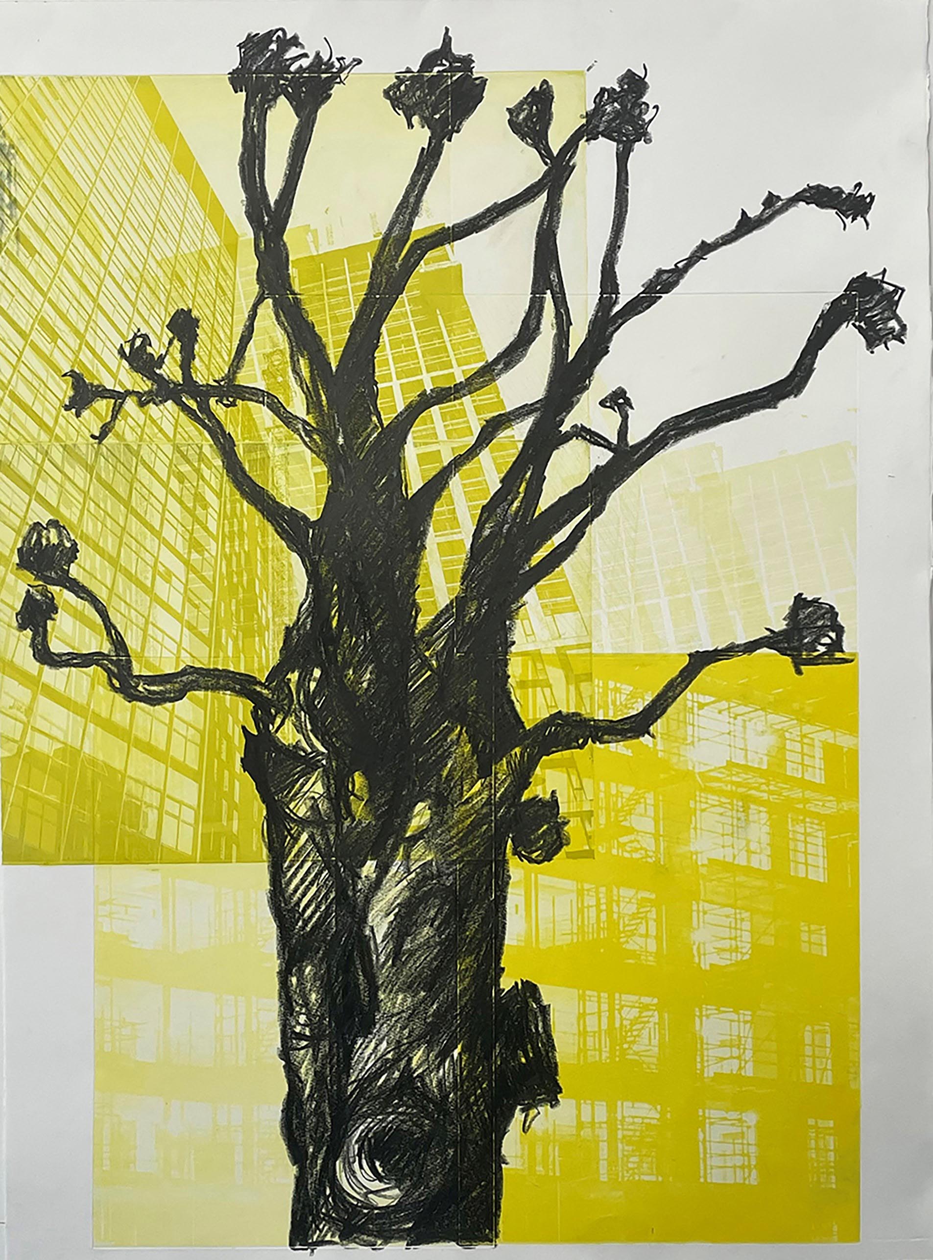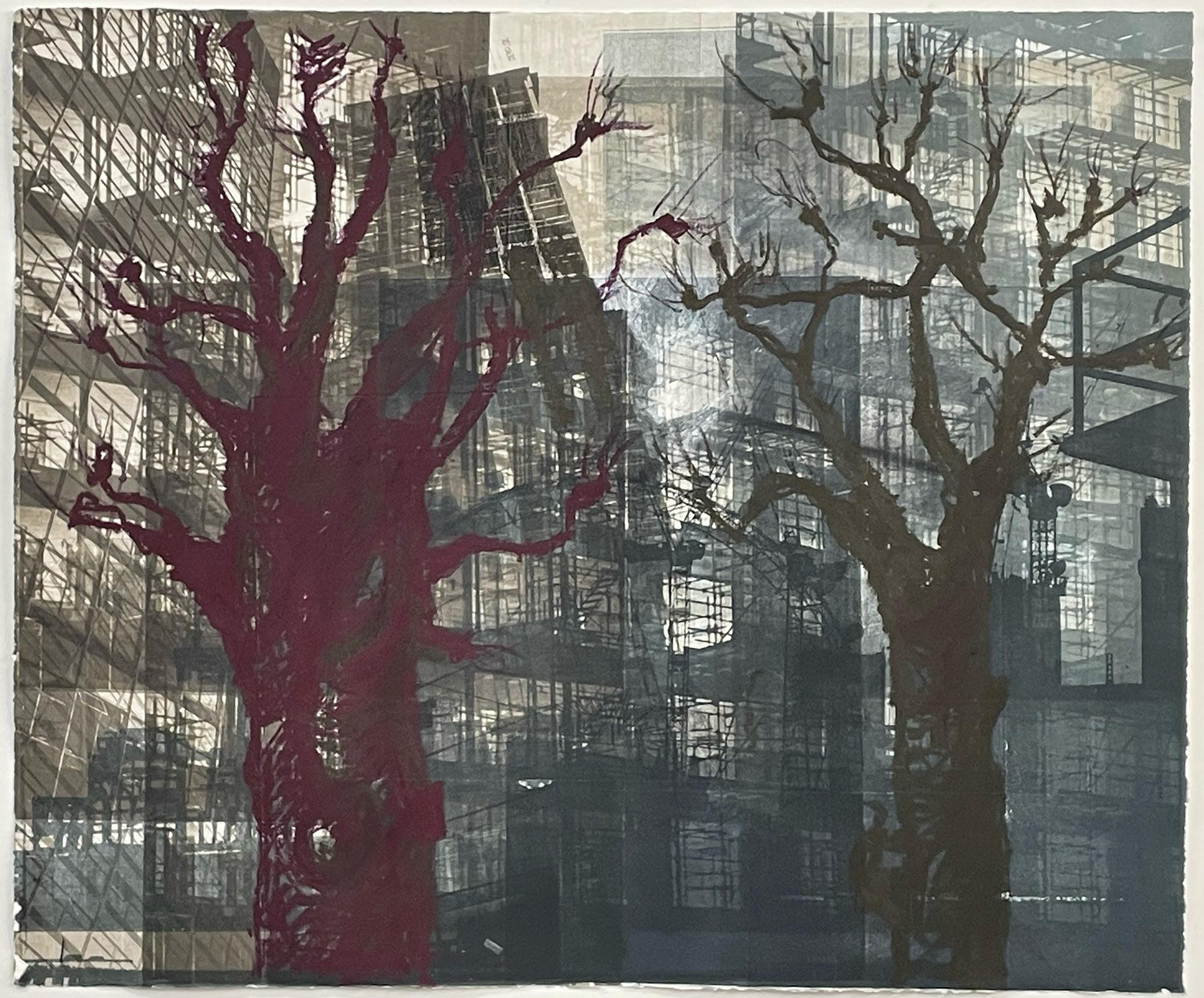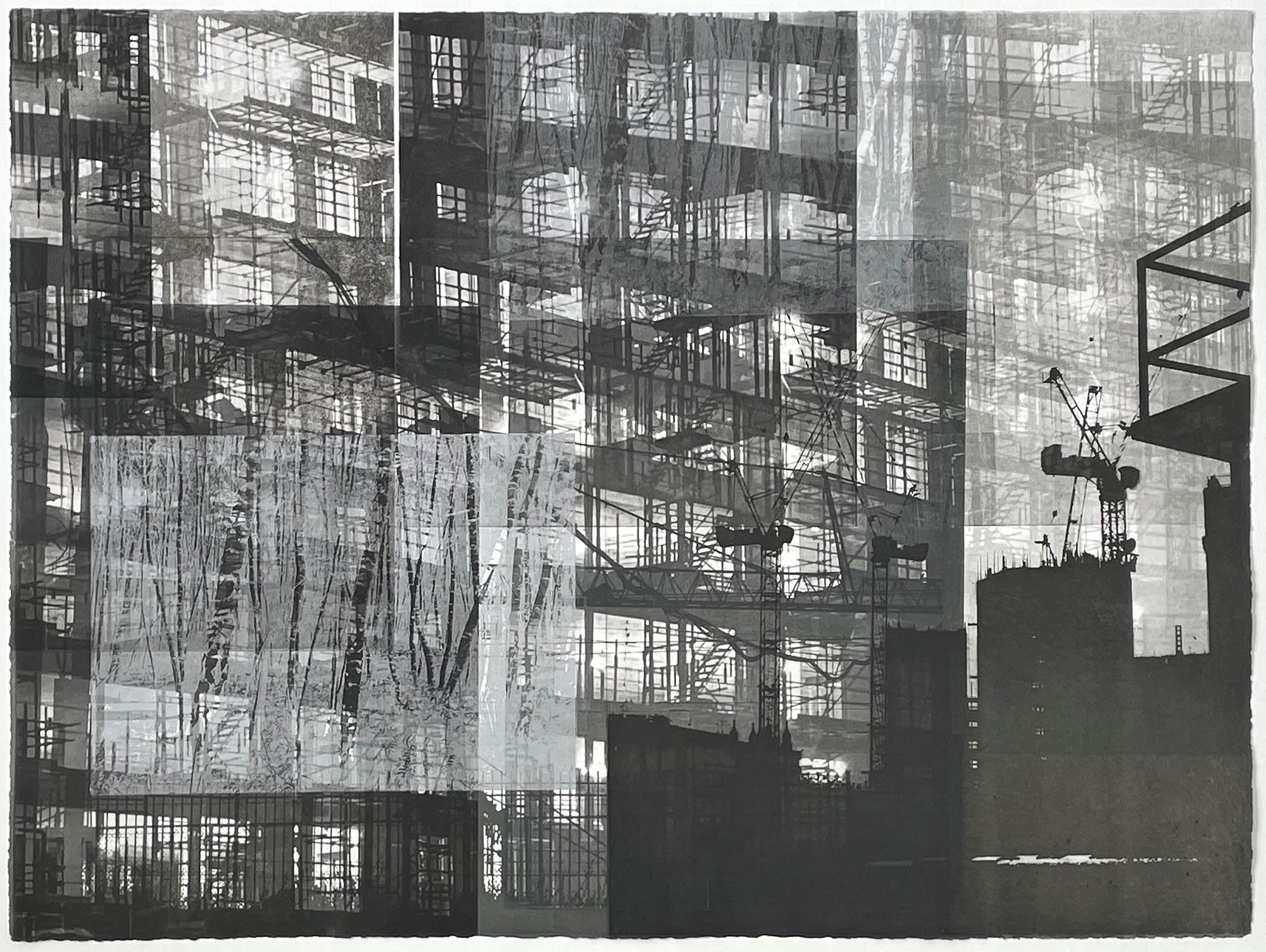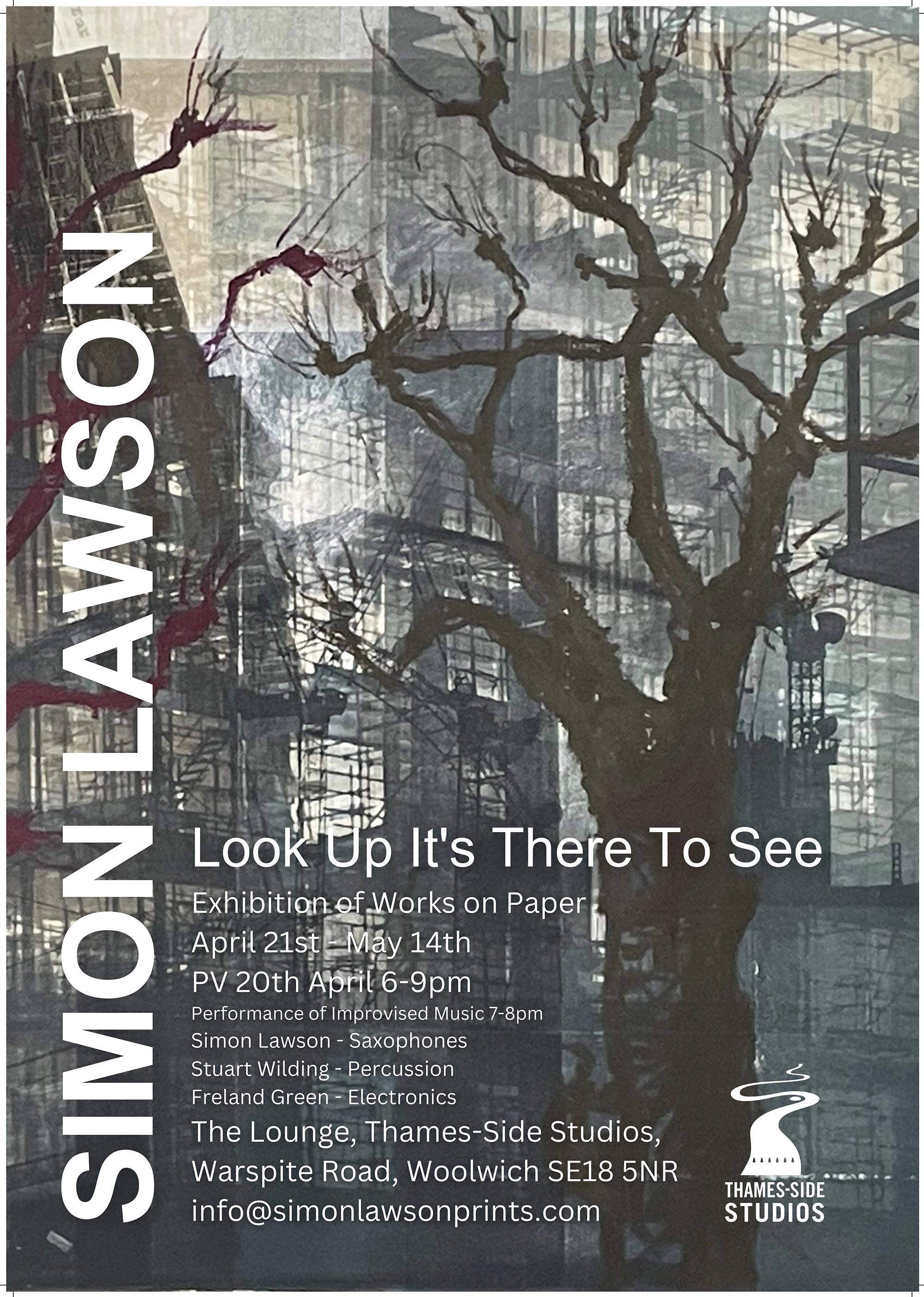 An Exhibition of Works on Paper There’s real estate and unreal estate… He tells them how nice, a tree, a shrub, see how it makes up for the noise and monstrousness of tearing down an old building and putting up a new building. That’s the whole secret of corporate structures, my friend.Tell the enemy you’ll plant some trees. - Don DeLillo Simon Lawson (Studio TB-11) applies a comparative aesthetic, collaging new and archive plates, to produce unique composite prints. The result is an ongoing series of large format etchings which explore experimentation in the structure, texture and construction of the print itself. "The recent Amelioration Series take physical subjects as their basis, to represent the human presence and it’s legacy. These prints focus on the impact of people, in their quest to make an improved society and the conflict between urban development and its ever-increasing effect on the environment. Although conscious of the footprint of human impact on the ground I am constantly aware of looking upwards, a neglected activity with our increasing fixation with our phones for direction and answers. The ever-increasing development above our eyeline, that which occurs outside of our consciousness but which greatly impacts our wellbeing and ultimately our future existence." - Simon Lawson, March 2023 For more information visit www.simonlawsonprints.com and email info@simonlawsonprints.com Thames-Side Studios Lounge is located on the second floor of Unit 0 and open to all studio holders and by appointment. For general Thames-Side Studios enquiries please email info@thames-sidestudios.co.uk