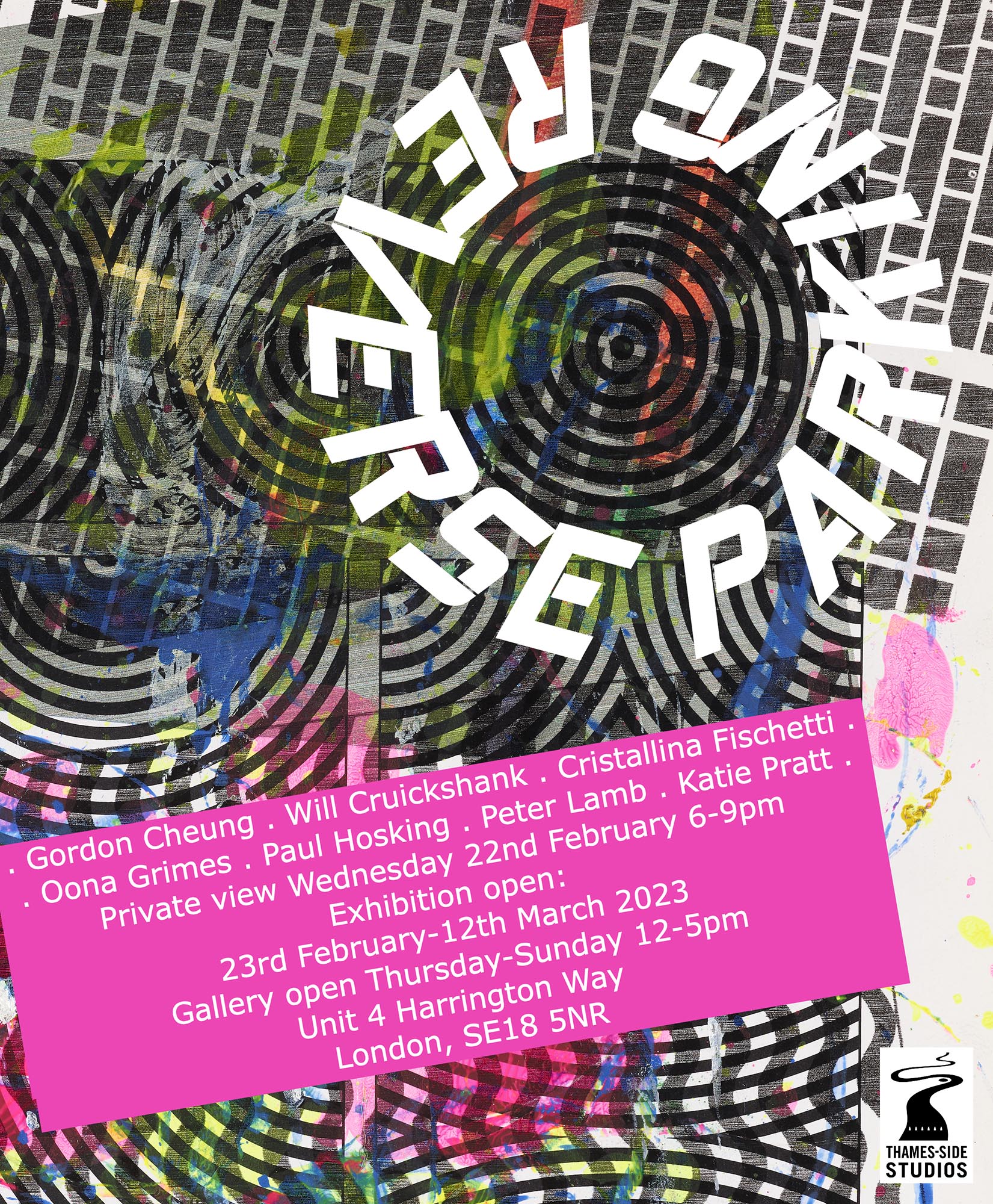 Curated by Peter Lamb and Katie Pratt, Reverse Parking presents seven artists whose work explores the duality of reality and the technological sublime. The possible’s slow fuse is lit by the imagination. Emily Dickinson If you try and take a cat apart to see how it works, the first thing you have on your hands is a nonworking cat. Douglas Adams Through the alchemy of the creative process, something transcendental happens so that an artwork exceeds the sum of its component parts. The novel combination of material and context propels the imagination forward. Reverse Parking examines the duality of a tangible physical presence and the aura of cyberspace and psychic landscape. This exhibition is formulated as a mathematical sequence of sorts, to replicate the aspect of art-making where taking two steps forward and one step back leads to resolution: via remapping; mirroring; igniting; reassembling; renewing; collapsing; absenting and evaporating. The work presented is a product of the digital age, made out of a sense of wonder and dazzle, whether employing new technologies or bamboozled by them. Here, contrasts abound whether from the machinations of the studio or the curatorial conversation. The reflective, industrial surfaces of Paul Hosking’s structures both assert their presence and disappear into a virtual maze of real and imagined spaces. Peter Lamb’s prints combine pristine digital desirability with residual studio grunge. Thames-Side Studios Gallery Thames-Side Studios Harrington Way, Warspite Road Royal Borough of Greenwich London SE18 5NR. Thames-Side Studios Gallery open Thursday-Sunday 12-5pm during exhibitions and by appointment. For general Thames-Side Studios Gallery enquiries please email info@thames-sidestudios.co.uk
