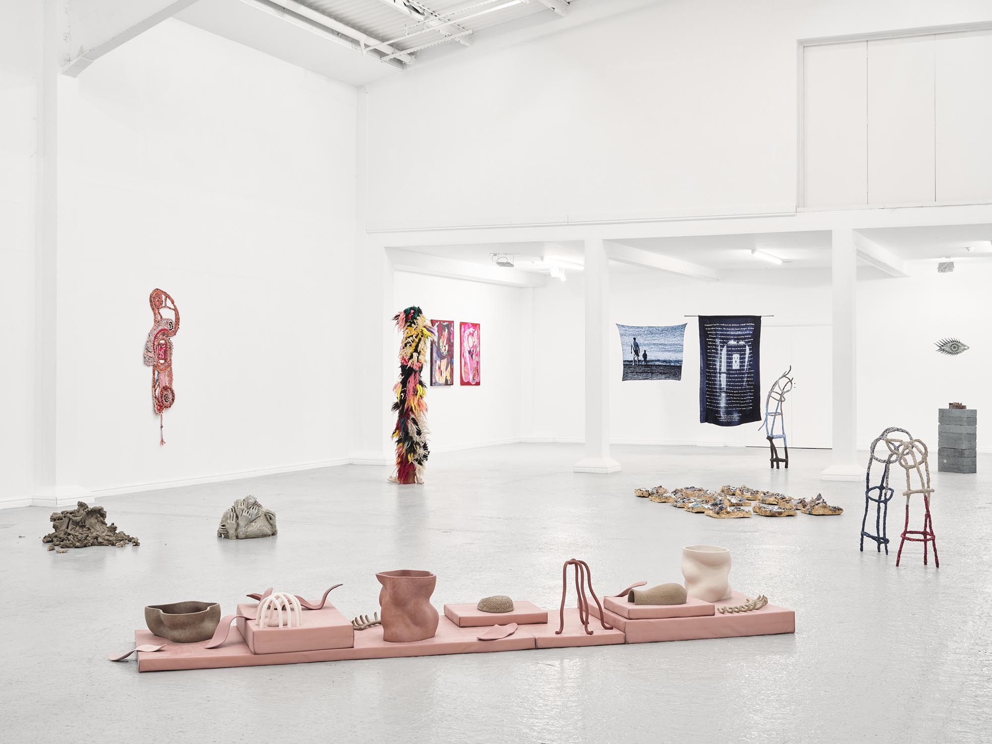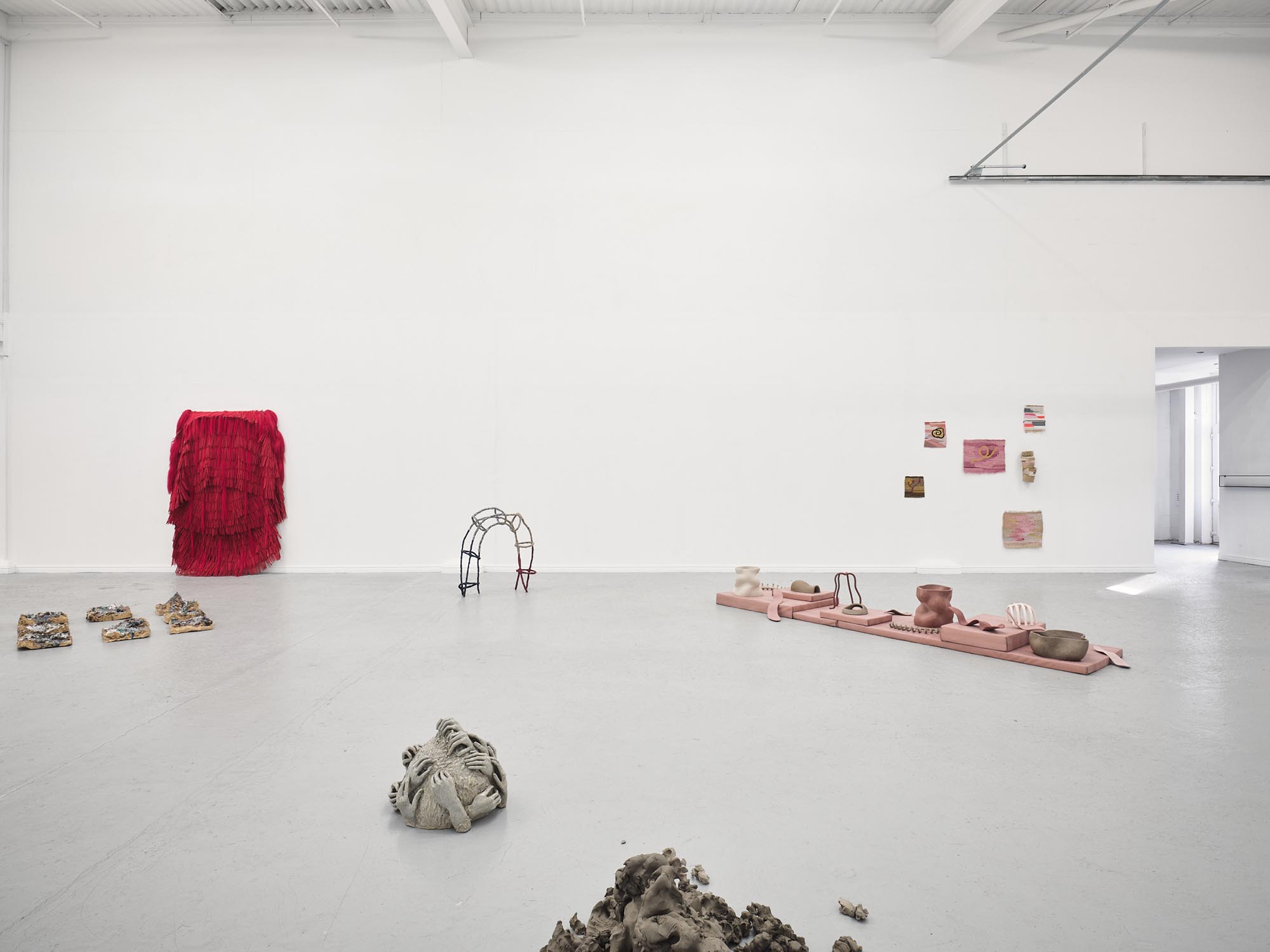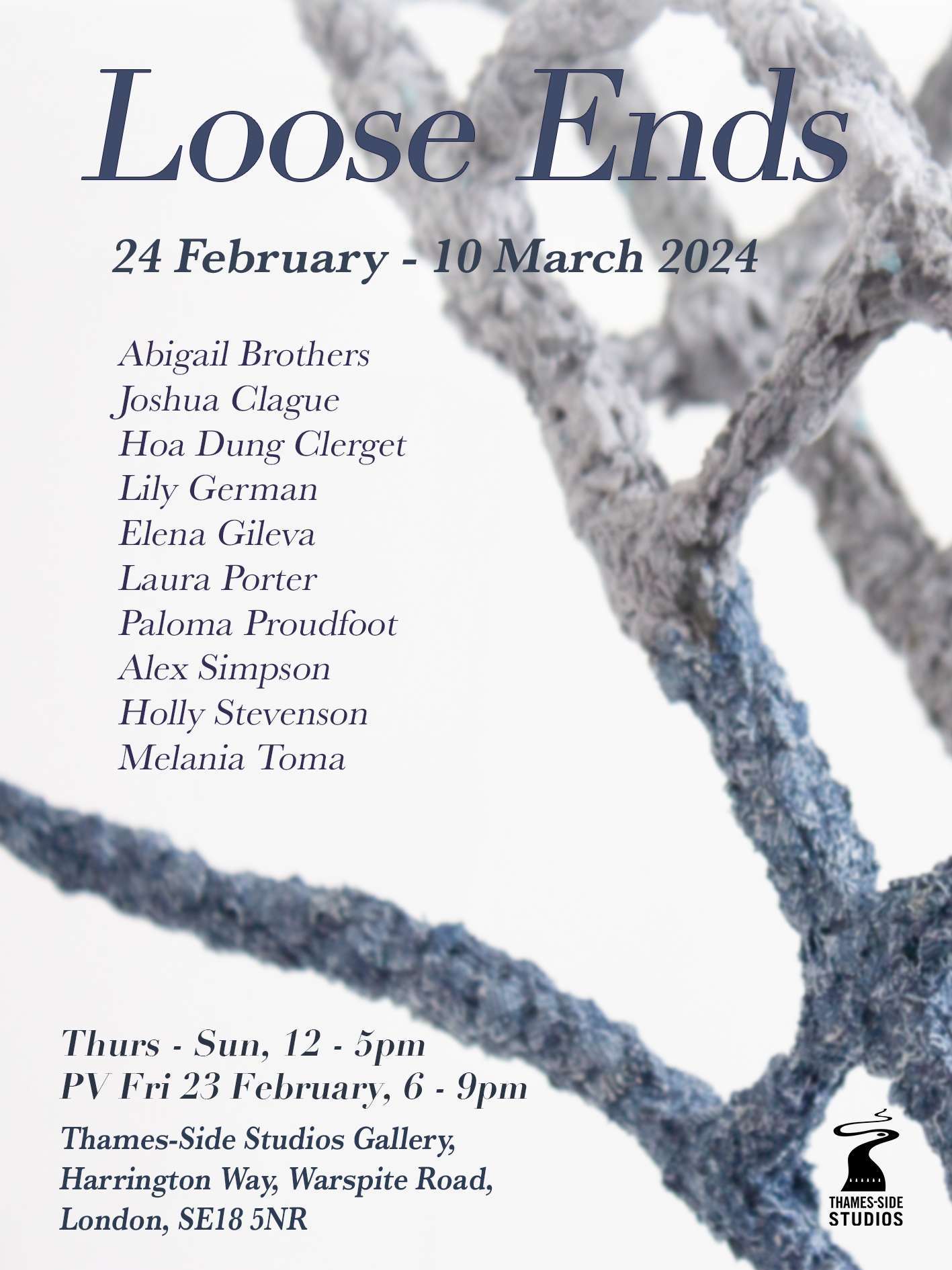 Loose Ends is a group exhibition which will bring together ten artists working across ceramics, textiles and performance. The exhibition will present a range of sculptures, performances and surface works which explore connections and the interwoven poetics of material and the body. Within the gallery these works will inhabit the floor and walls. Exhibiting artists: Abigail Brothers, Joshua Clague, Hoa Dung Clerget, Lily German, Elena Gileva, Laura Porter, Paloma Proudfoot, Alex Simpson, Holly Stevenson and Melania Toma. Clay coils are rolled and pressed together. Hands slide past one another; materials slip off fingertips as loose ends collect and are scattered on the floor beneath. The act of making and touch are preserved in the ceramic form and present between each taut thread. Touch solidified within the material. There is inherent proximity to the body in textiles through the everyday encounters of fibre we experience. Woven fibres are held, stretched, pushed and scraped against one another with flexing fingers. Everyday materials are manipulated and transformed into sculpture. A programme of events and performance will be presented at moments throughout the duration of the exhibition. These bursts of activity of outstretched bodies and voice will begin a conversation between the works in the gallery. Curated by Lily German. Free Programme of Events: