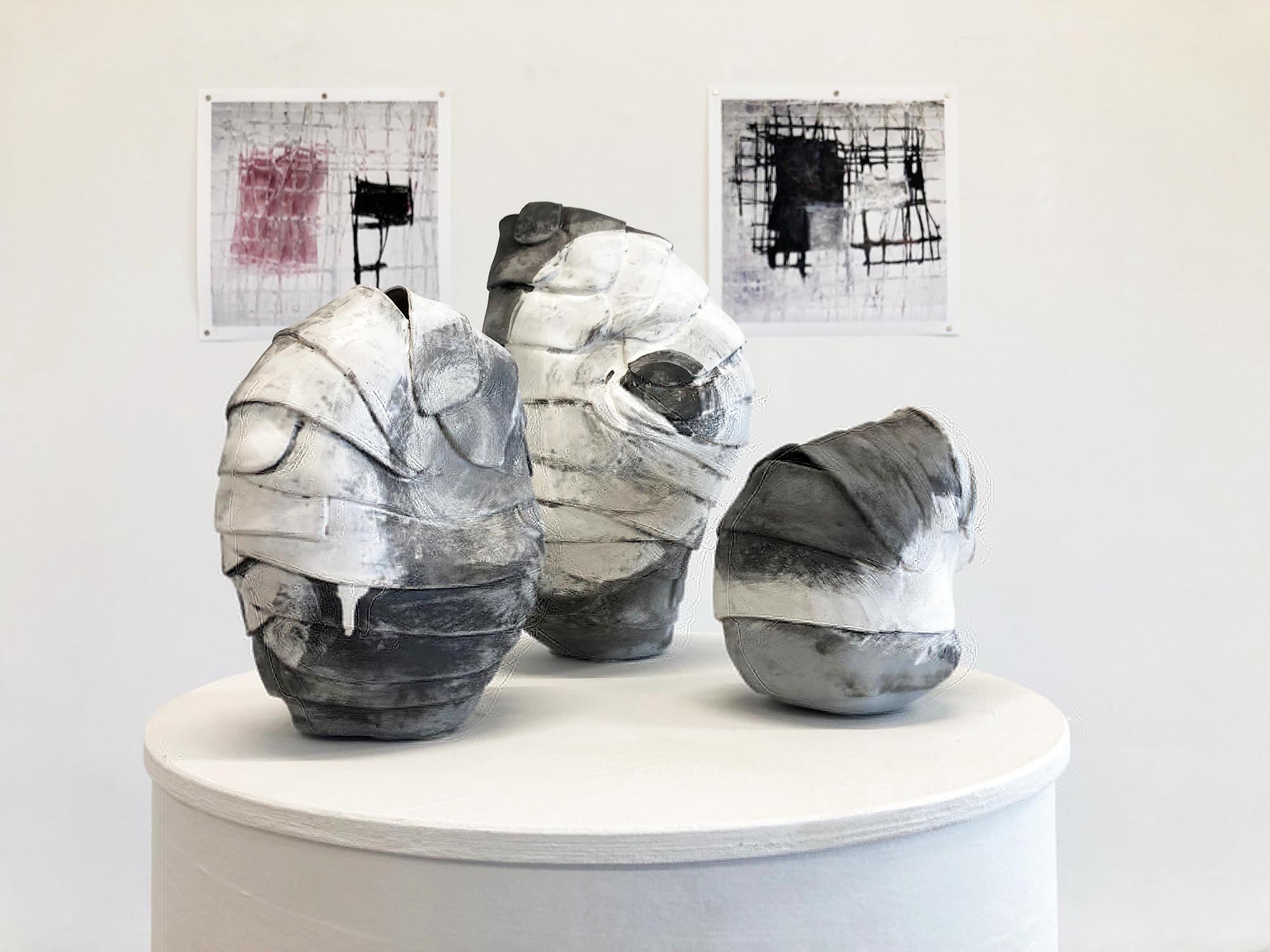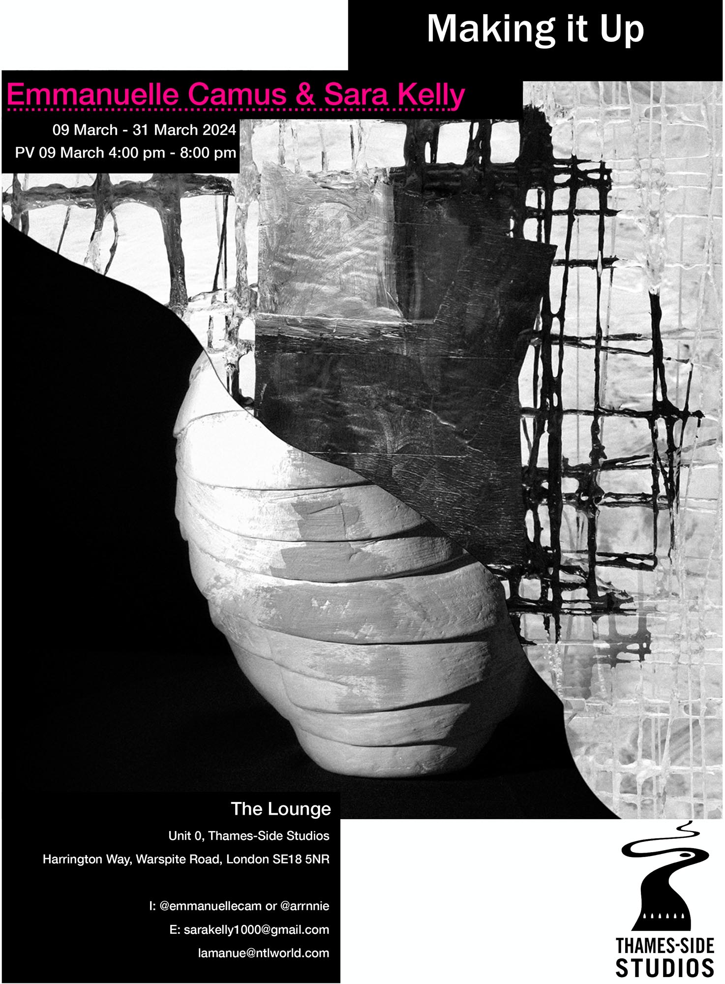 Making it Up showcases the work of two artists who work in different mediums - scraps and found objects assembled for the lens for one, and malleable clay for the other. Despite the divergence in their chosen materials, the exhibition unveils the common thread of improvisation that underpins their creative process. About the artists Emmanuelle Camus (Studio 2-117) was born in the Loire Valley, France, and has lived in London for the past 27 years. She graduated in 2012 with a BA in Ceramics from Camberwell College of Art and Design. Her work originates from her interest in lived experience. Her recent work is an exploration of identity and protection stemming from her personal experience post-Brexit. Camus creates hand-built ceramic sculptures using a variety of techniques. She is presently experimenting with exposed slabs. Follow Emmanuelle on Instagram @emmanuellecam Sara Kelly (Studio 2-105) lives and works in London. She graduated from Middlesex University with an MA Design for Interactive Media. She also holds a BA in English and Drama and studied with Turps Banana, UK, on their correspondence course. She is interested in painting in relation to other genres and translations through the lens. Kelly has participated in various group shows, including Woolwich Contemporary Print Fair, London, Tension Fine Art, London, The Feminist Library London, Testbed Gallery, London, and a solo show at Five Years Archway, London. Follow Sara on Instagram @arrnnie Thames-Side Studios Lounge is located on the second floor of Unit 0 and open to all studio holders and by appointment. For general Thames-Side Studios enquiries please email info@thames-sidestudios.co.uk