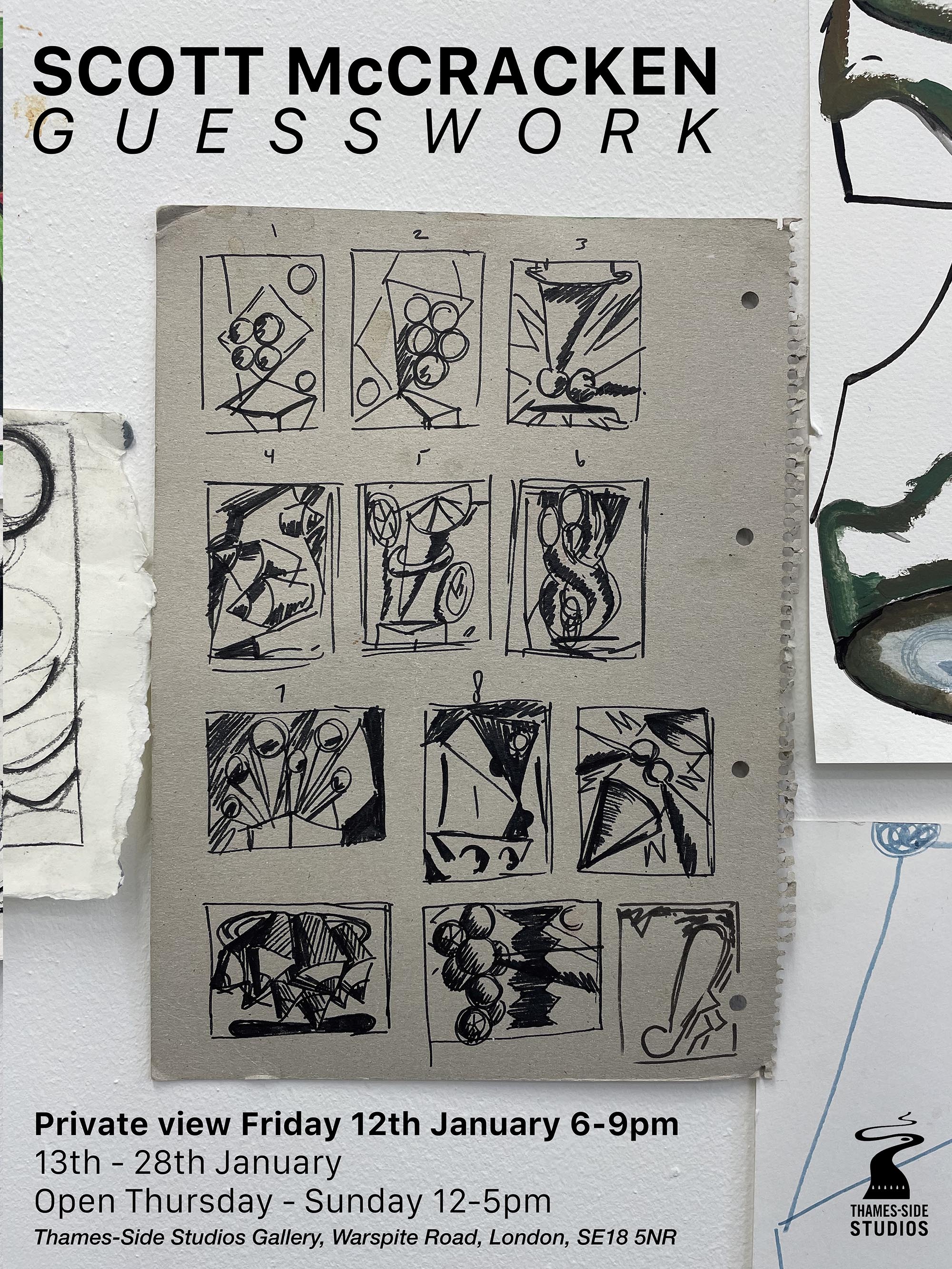 The title of the exhibition Guesswork refers to how the paintings are constructed in the studio, of working out and reworking, where composing and editing occur simultaneously. Working primarily on a small scale, the motifs in the paintings fluctuate between the diagrammatic and the corporeal, but never fully settle as either. They may be landscape paintings that masquerade as still life paintings, still life paintings that masquerade as abstract paintings. What is there in the pictures is taken to a point of recognisability before it becomes named. It is through their indeterminate nature that the paintings eventually find themselves. - Scott McCracken, November 2023. About the artist Scott McCracken is a painter who occasionally writes and organises exhibitions about painting. He studied at Edinburgh College of Art (2005-11) and Turps Art School (2015-17). His work has been exhibited nationally and internationally. In 2017 he was awarded the Darbyshire Prize for Art and in 2019 he was shortlisted for the Contemporary British Painting Prize. He lives and works in London. www.scottmccracken.co.uk Thames-Side Studios Gallery Thames-Side Studios Harrington Way, Warspite Road Royal Borough of Greenwich London SE18 5NR Thames-Side Studios Gallery open Thursday-Sunday 12-5pm during exhibitions and by appointment. For general Thames-Side Studios Gallery enquiries please email info@thames-sidestudios.co.uk