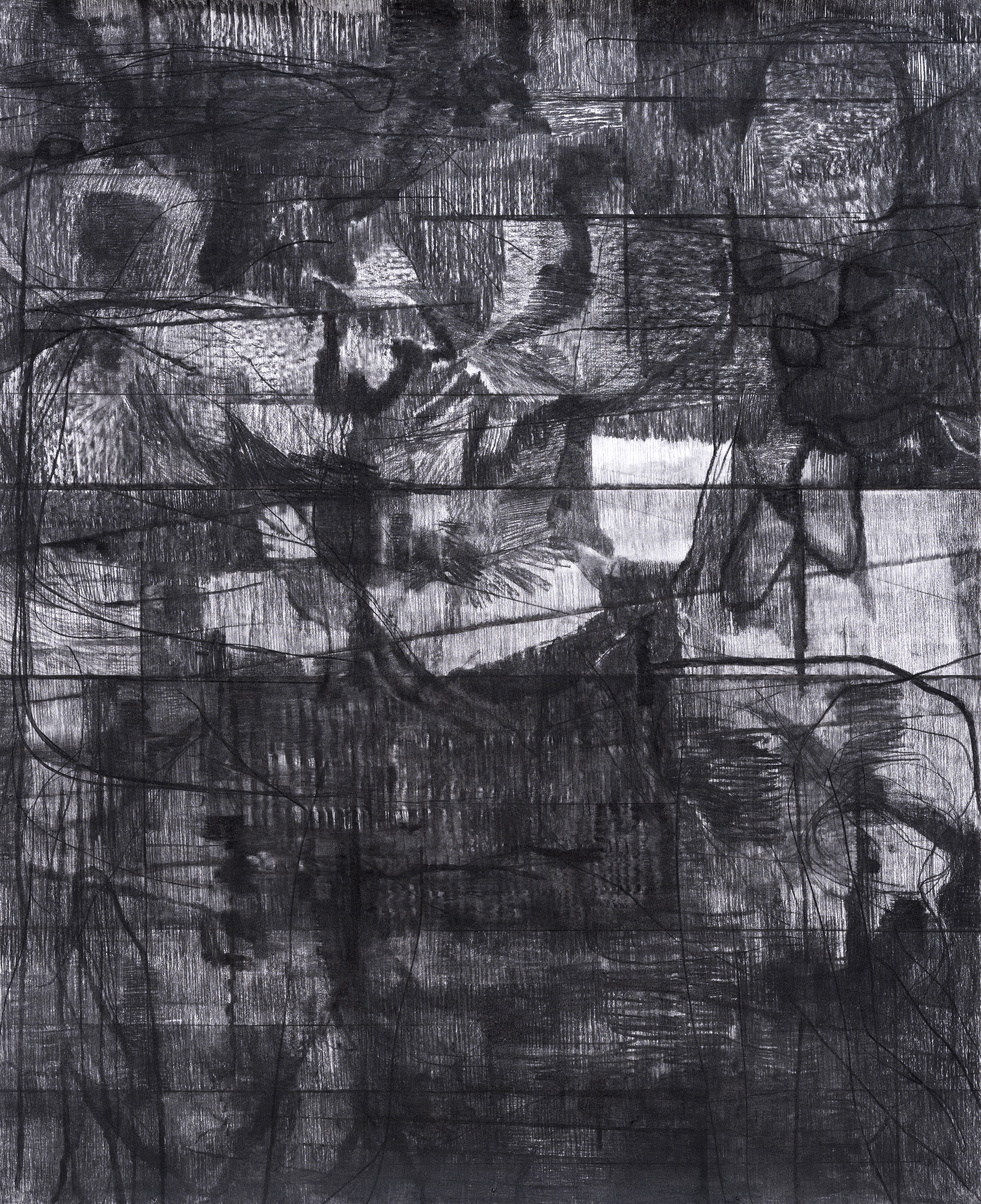 A. van Campenhout (NL) creates intricate spatial worlds through a web of charcoal lines. His work begins with memories, shared histories, and current events - not as literal depictions, but as fragments of a non-linear, layered recollection. In this process, he searches for the right tone, reconstructing meaning step by step. The lines twist and converge, inviting the viewer’s eye to wander through layered realms of light and shadow.