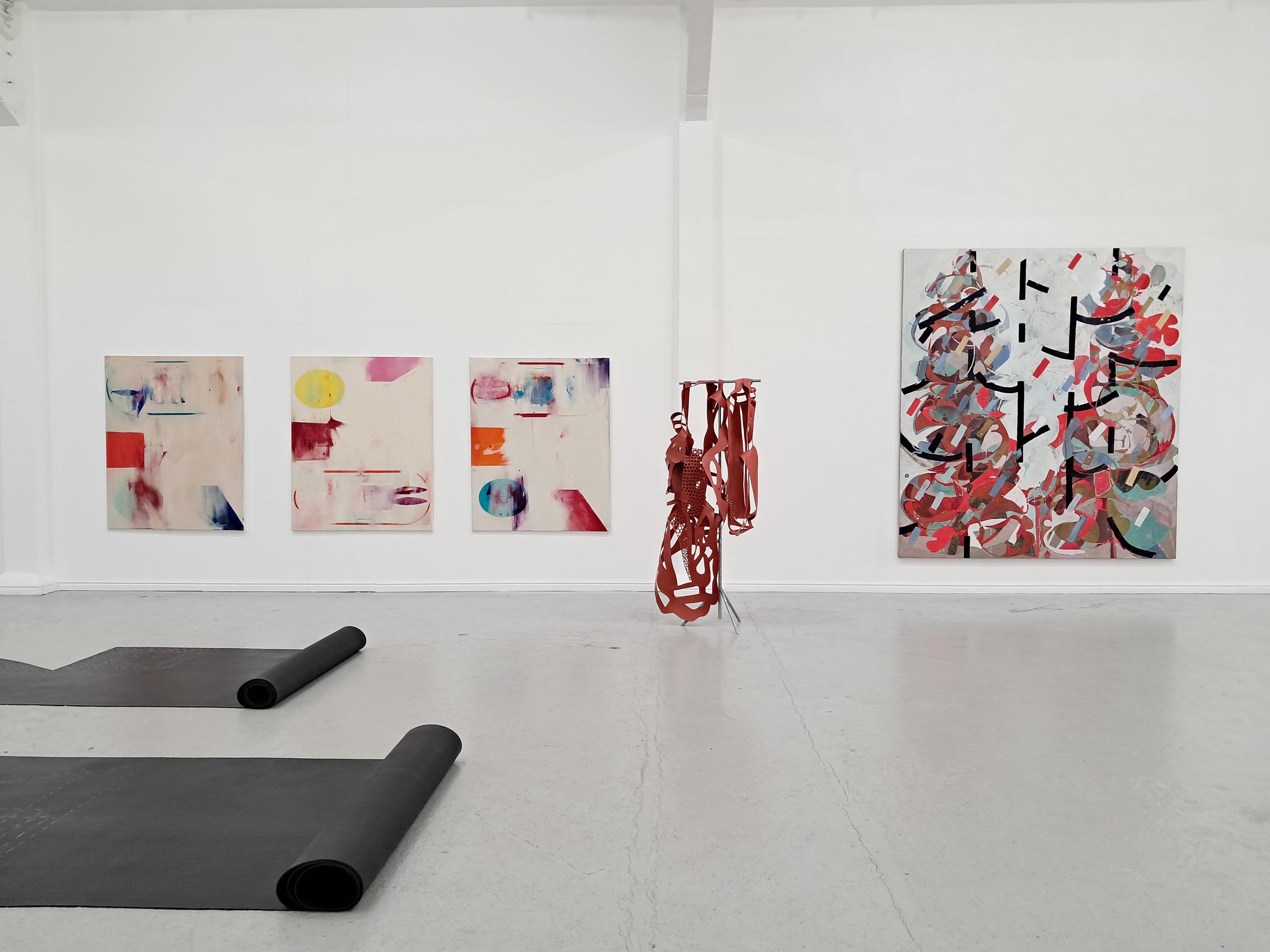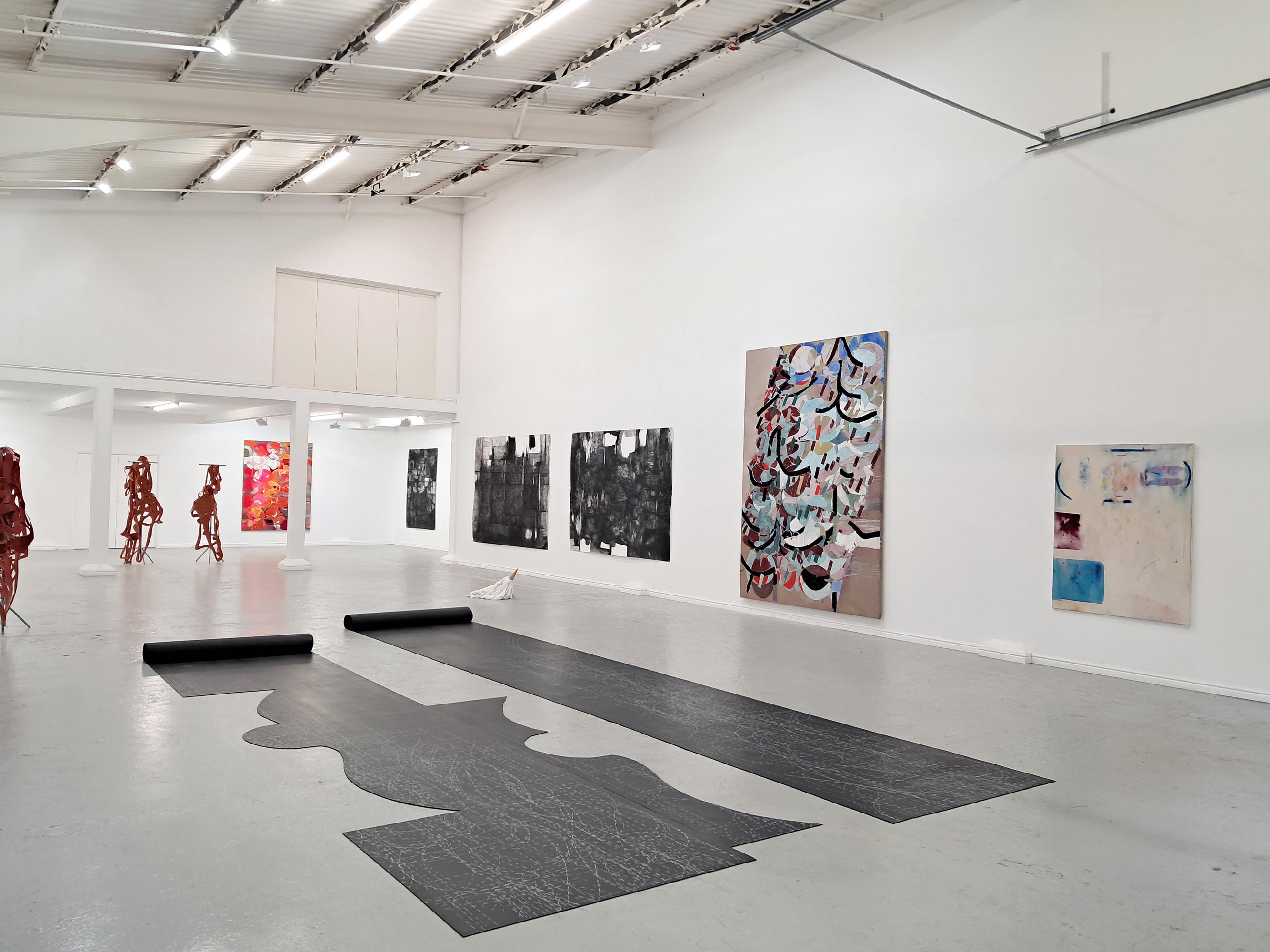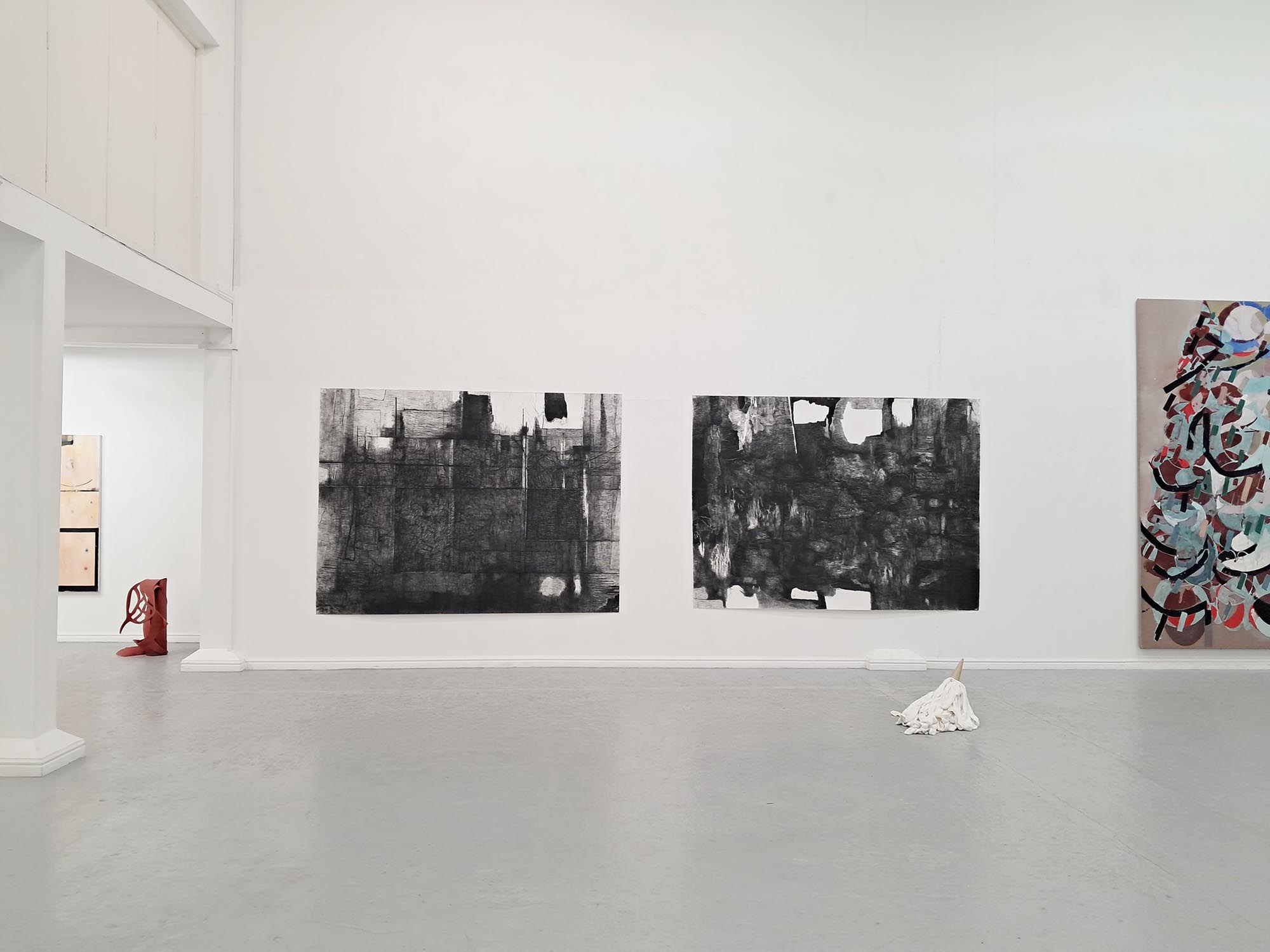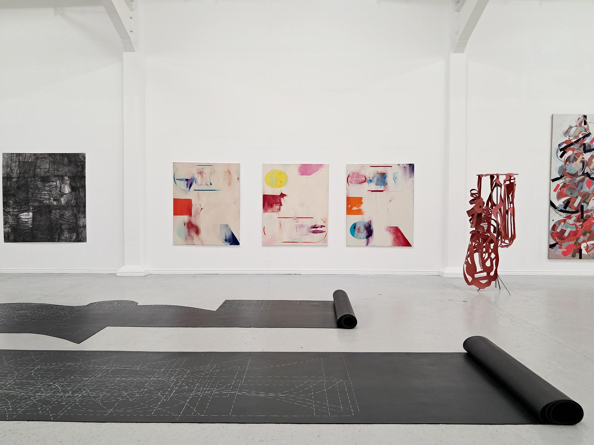 extract from The Unhinged Critic / Matthew Caley [ for A Plan for Living ] supposedly says The Un-hinged Critic resemblance and affirmation canot be uncoupled without a gentle carnage but never in the architect's model where perspective leaves merely an odour and bodies once posed vacate responsibility A Plan for Living is an exhibition of large-scale drawings, paintings, sculpture and installations. The show takes its name from a painting by Stephen Nicholas, now hanging in the studio home of artists Carina Diepens and A. van Campenhout in the Netherlands. This connection between old friends forms the starting point to a conversation about the process of making art. The project explores the tension between planning and making, between idea and realisation, between purpose and result. A plan sets an intention; it is an act of optimism and a gesture towards potential. It also knowingly encompasses the possibility of failure. A map, a scheme, a drawing – a plan - suggests an act that is open to new form and with this marks a beginning and an inherent capacity, a generosity of spirit. The artists search for the dynamic between the planned and the unexpected, the controlled and the uncontrolled, between the material and the immaterial. They are not only looking for the final image but want to probe the relevance of the creative process as a parallel for human connection, feeling and understanding. A Plan for Living acknowledges the physical space of making as well as the mental space that underlies it. As the world grows more polarized and undergoes rapid change, its social challenges inevitably enter the studio. These issues compel artists to take a stance—though the responses are rarely straightforward. Instead, they manifest in abstract ways within the work of the four artists.
