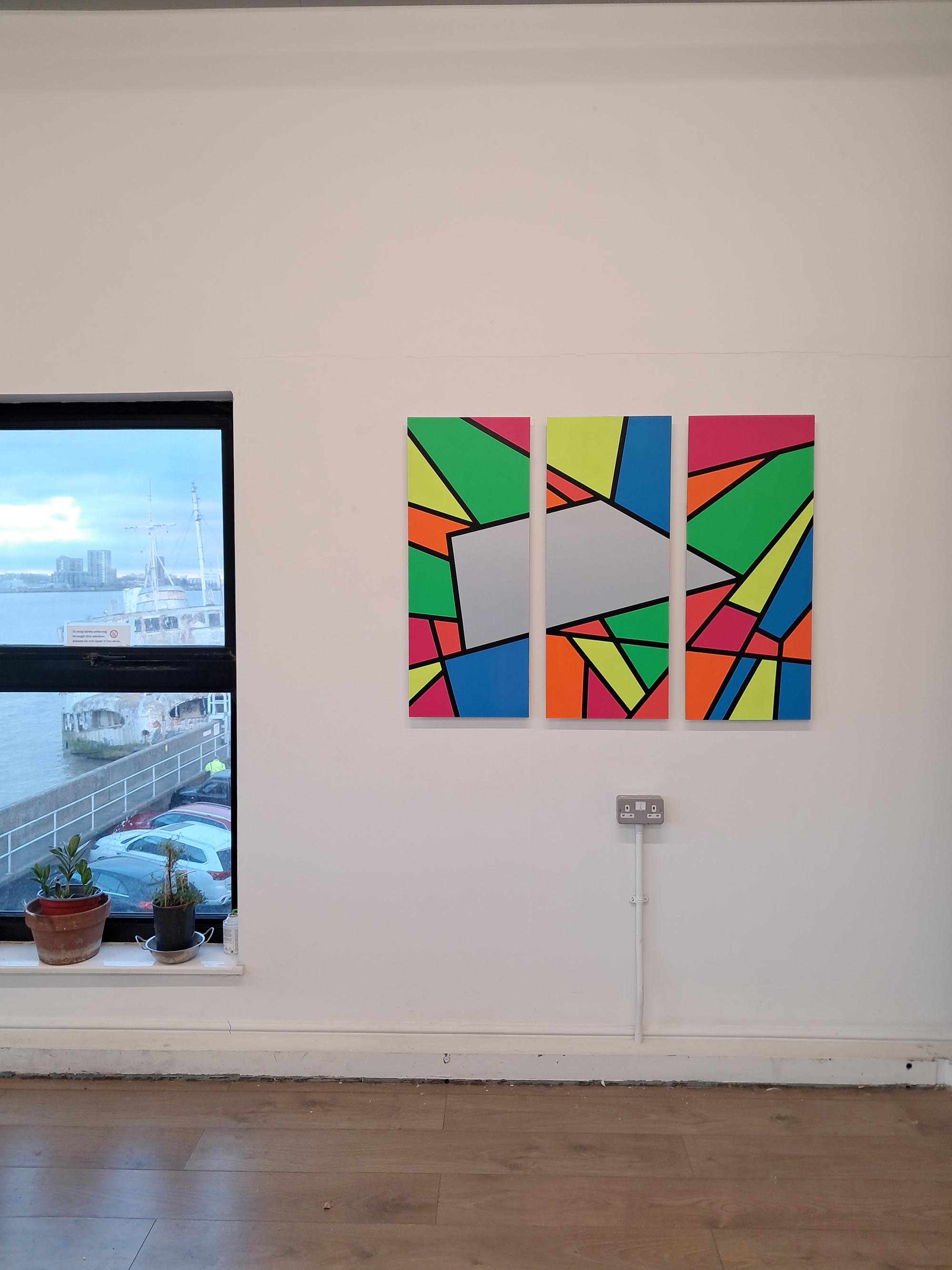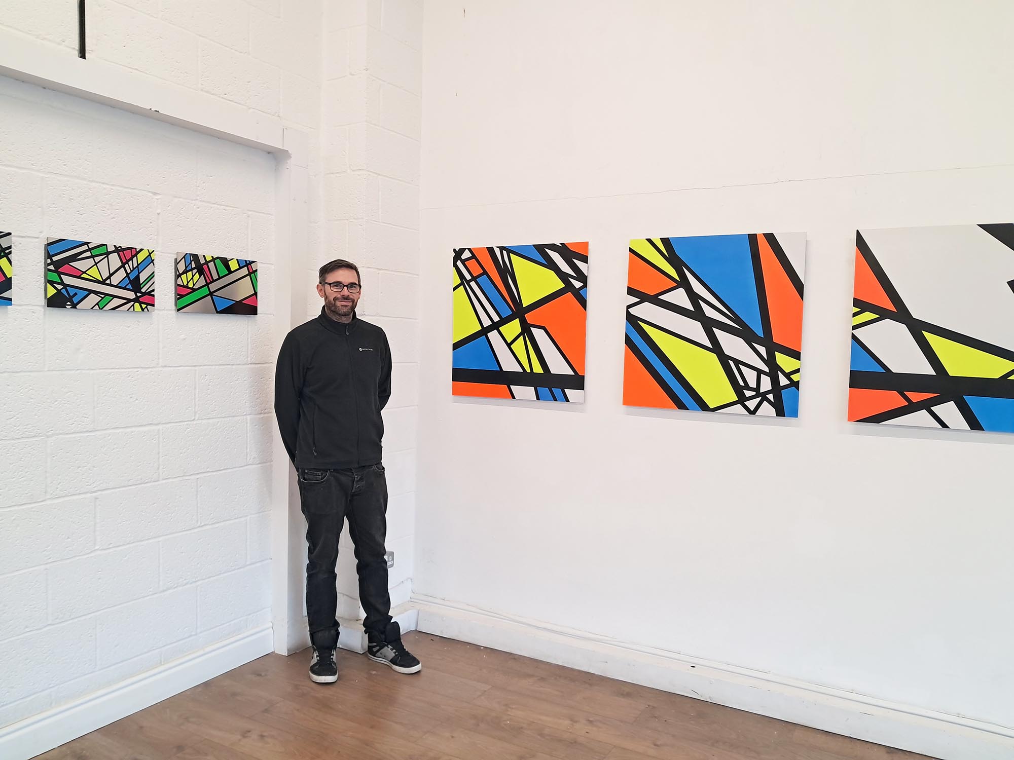 Ben’s artwork is heavily influenced by music. The main style that he works in was created when attempting to visualise the music genre Chiptune. Unnatural colours are his interpretation of the computer-like notes. Held together by hard, straight, black lines are how he sees the beat. Most pieces take their title from lyrics of tunes playing during the creative process of that artwork. Other influences include architecture (particularly Brutalism), stained glass, retro video games, early 00s Emo/Skate/Punk cultures, and art movements such as Cubism, Pop Art, Street Art, Minimalism, and De Stijl.