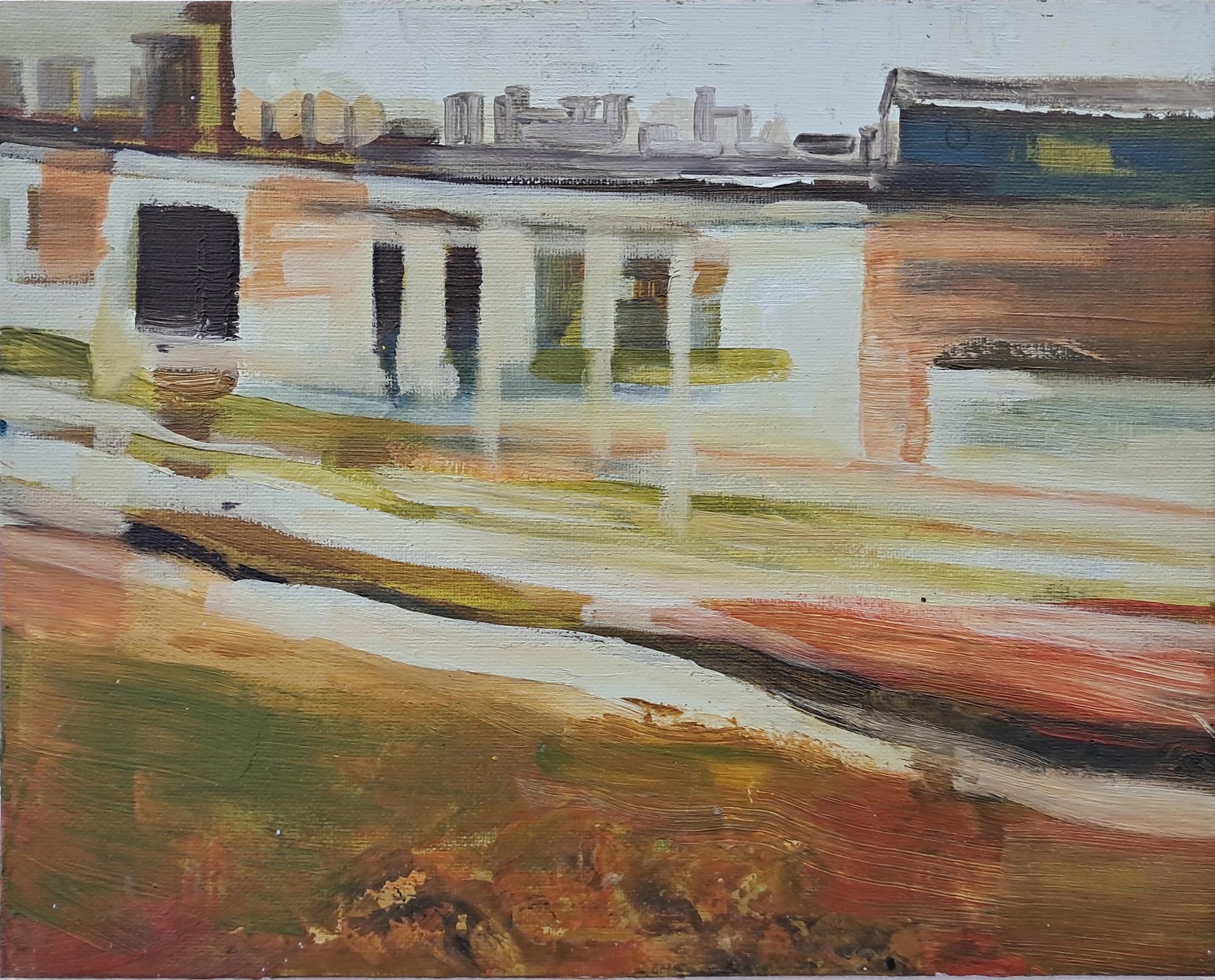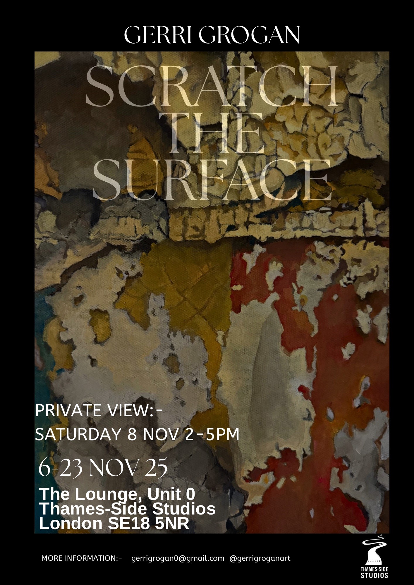 Scratch the surface…initiate an initial investigation to discover something concealed. In this exhibition, Gerri Grogan (7-206) presents work drawn over a period of time, exploring themes of the passing of time, history, nostalgia and making moves towards abstraction. Observing and researching the history of this part of industrial London, she has looked at how we attach sentiment and memory to the environments of our past and the idea that we often look back nostalgically but find the present lacking. Erosion and decay demonstrate how the passage of time impacts on the surface and material of those environments. The use of doors as art links directly to entering those different worlds and the idea of stepping into the artists’ mind. The Royal Iris ferry conveys a real sense of past glories eroding before our eyes, as do the once busy local pubs and workplaces which have been left to the ravages of time. The Tate and Lyle factory however is a still functioning reminder of the industrial heart of this part of London, and remains a constant landmark on the horizon, with moving elements reminding us of its purpose. This view has continued to inspire Gerri’s work, more recently towards a more abstract interpretation of the colour palette and ever- changing light quality reflected back from the river and the sky. About the artist: Gerri Grogan studied Fine Art at Wolverhampton University then later a MA at SOAS in Art and Architecture of South East Asia. She has been an art teacher both full and part time for over 30 years, only coming back to her own practice more fully in the last nine years. She also volunteers as a guide at Tate Modern. Her work has been very inspired by the history of her environment, whether that is urban London or the Buddhist stupas of India, but in particular the erosion and surface qualities of those environments and how they convey the passage of time has held a particular fascination. Gerri has participated in several group shows, including in Wolverhampton, Thames-Side Studios and Tate Modern staff shows, as well as a solo exhibition at the Brunel Museum café. She was also previously an artist in residence in Bangkok. For more details and information please get in touch with Gerri directly here and follow on Instagram @gerrigroganart Thames-Side Studios Lounge is located on the second floor of Unit 0 and open to all studio holders and by appointment. For non-studio holders please DM the artist to arrange an appointment.