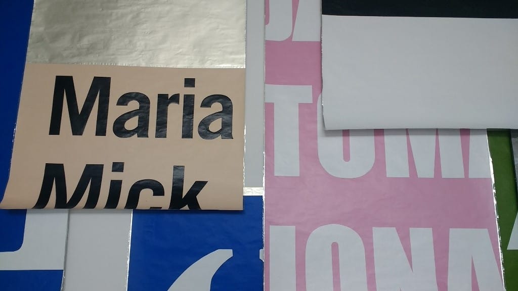 Lizi Sánchez's (2-54) solo exhibition, Maria, Rosa, Mick & John opens at DOMOBAAL on Friday 29 September, 6-8pm. Open Thursday - Sunday, 12-6pm. The exhibition continues until 28 October 2017. Maria, Rosa, Mick & John is an installation of new large format works on aluminium foil that hang loosely on the wall, their lower edges flicking up as if hastily fly–posted, overlapping and partially obscuring, while jostling each other for attention. Full details at www.domobaal.com Image: Lizi Sánchez, Maria, Rosa, Mick & John(detail), acrylic on aluminium, each piece 130 × 76cm, 2017, courtesy the artist and DOMOBAAL.