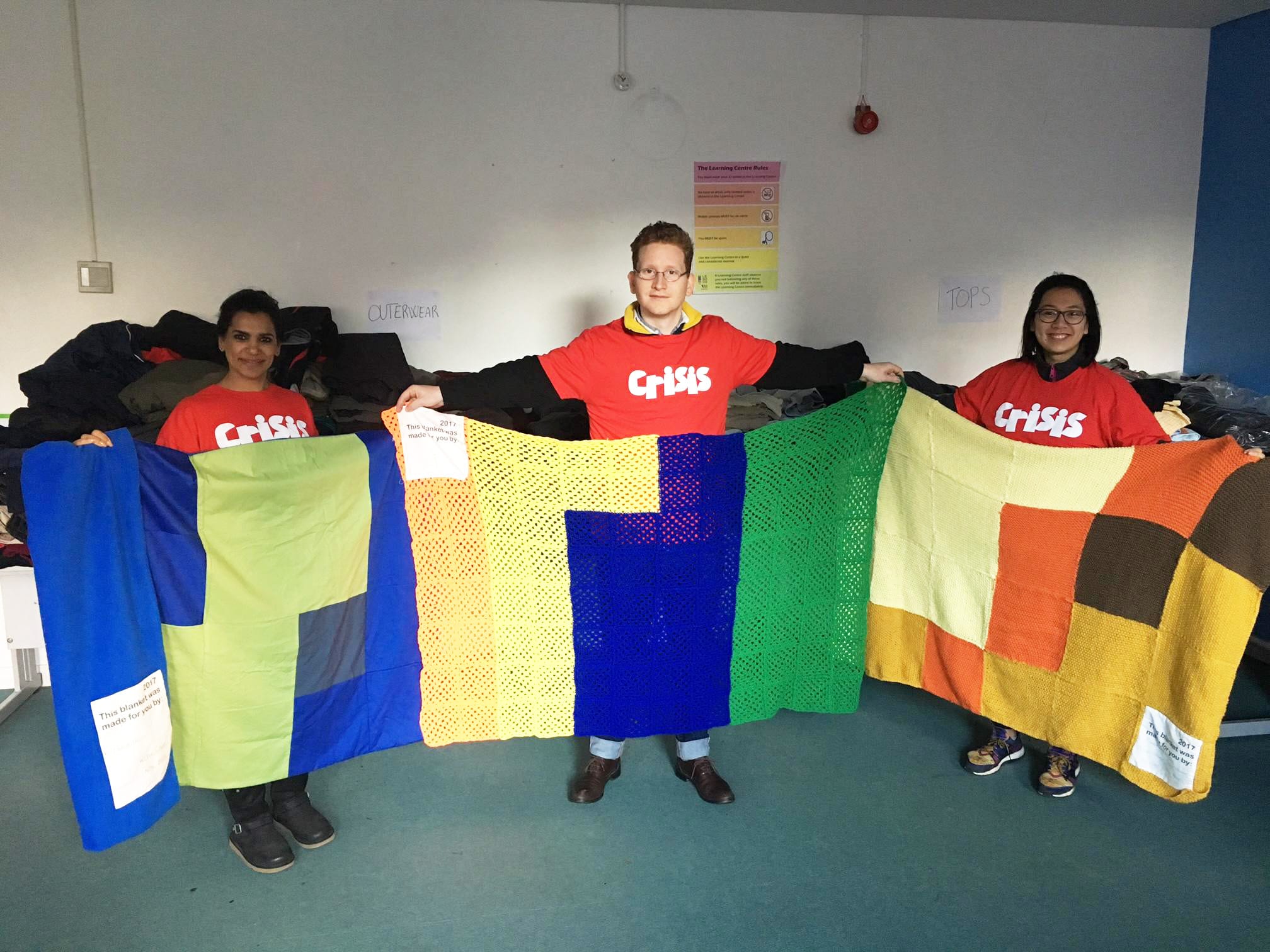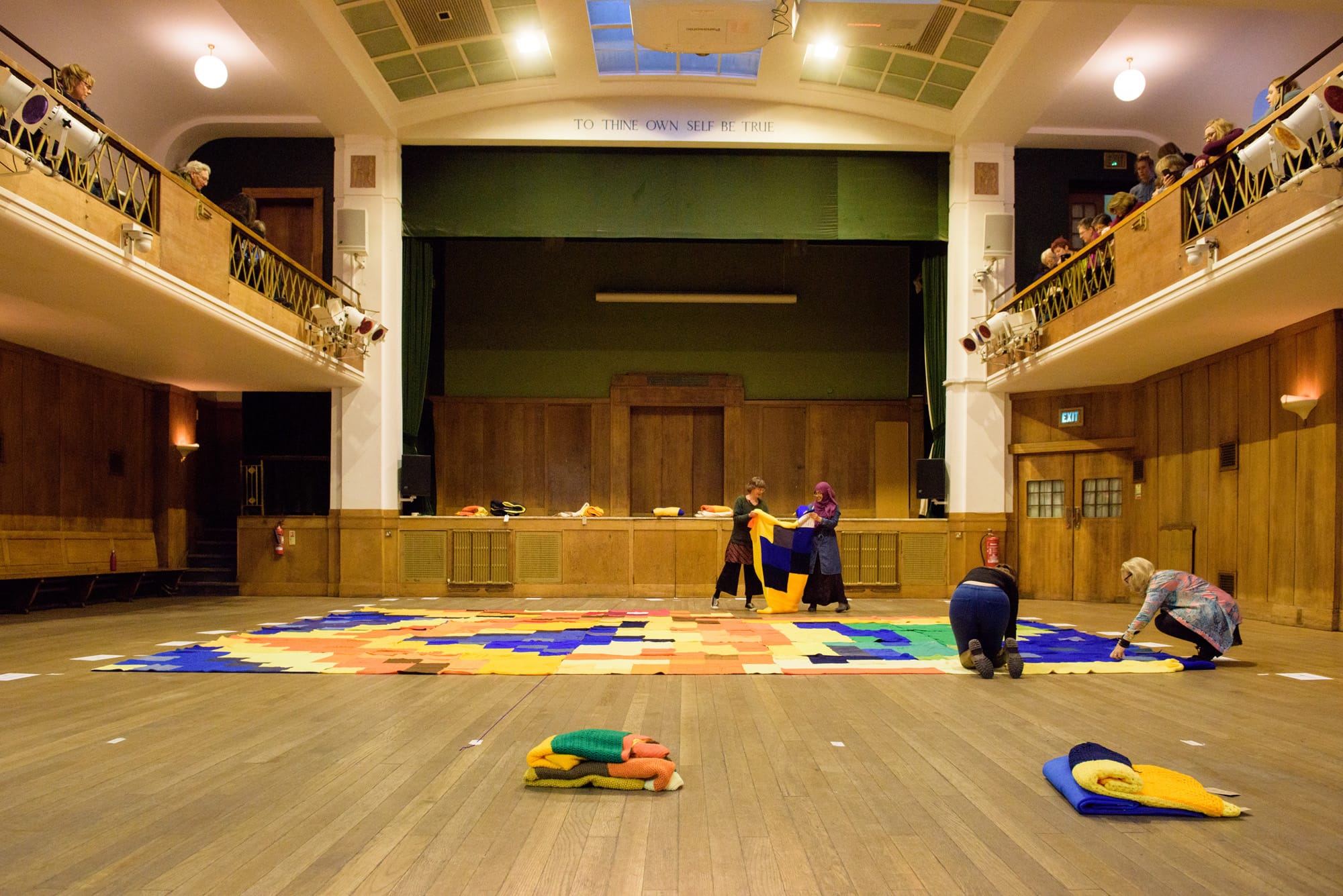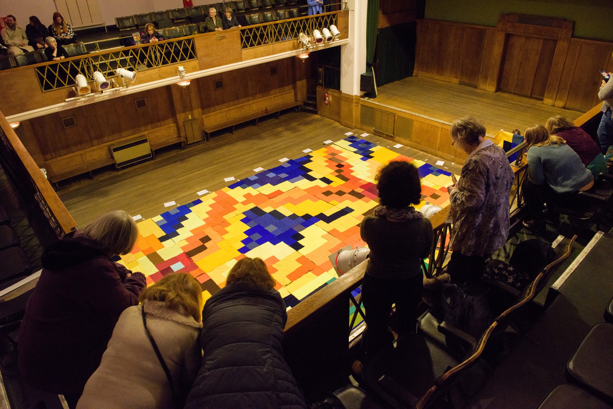 It was exhibited at the Conway Hall on Wednesday 6 December 2017. Afterwards Crisis in Lewisham distributed them to their Christmas Centres which are open for Christmas week, providing meals, advice, healthcare and company to thousands of homeless Londoners. Watch a time lapse of the project here Images: pictures of the blankets being laid out at Conway Hall; a picture of the blankets at the Crisis Centre in Lewisham. All photography by Steve Blunt.