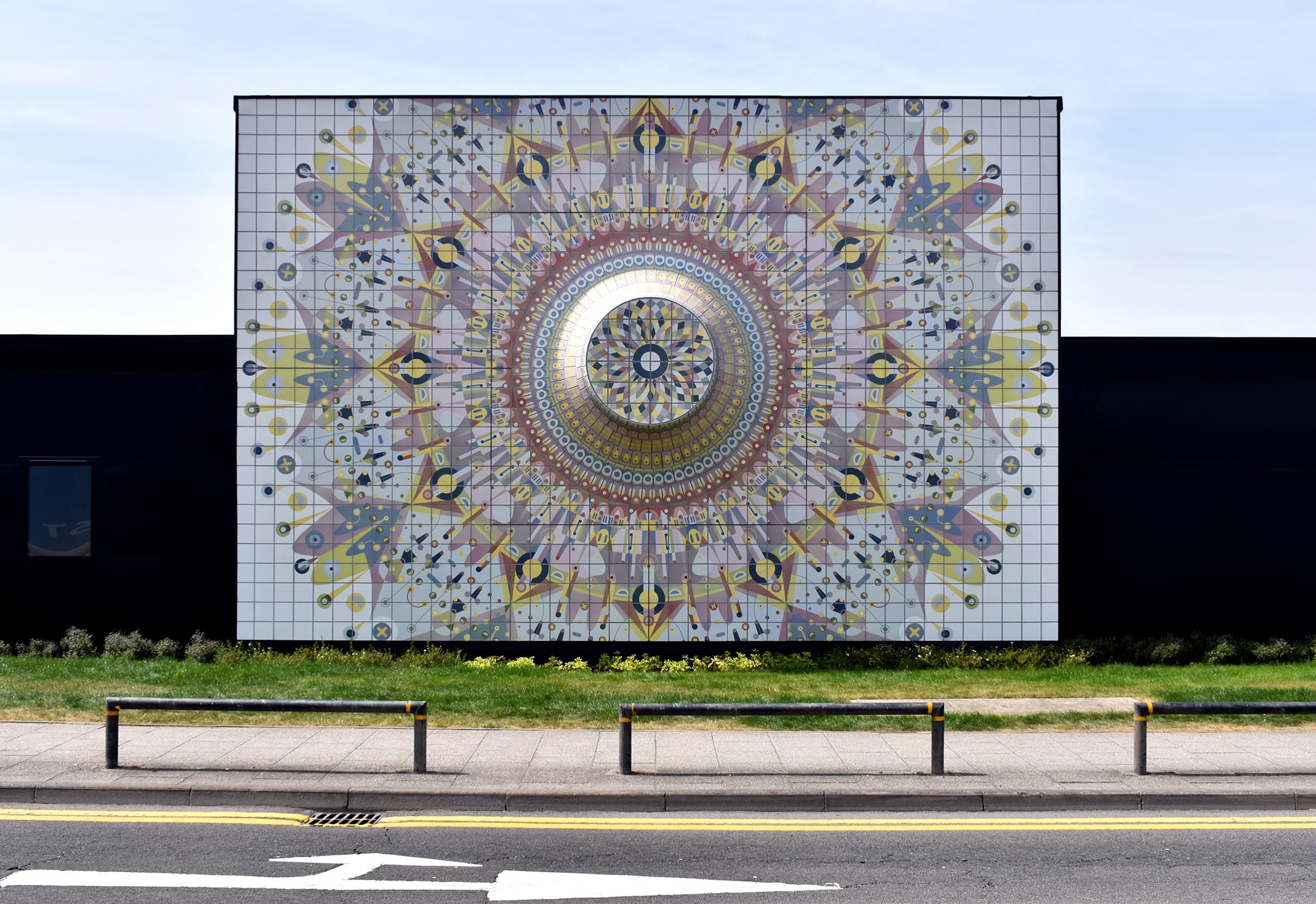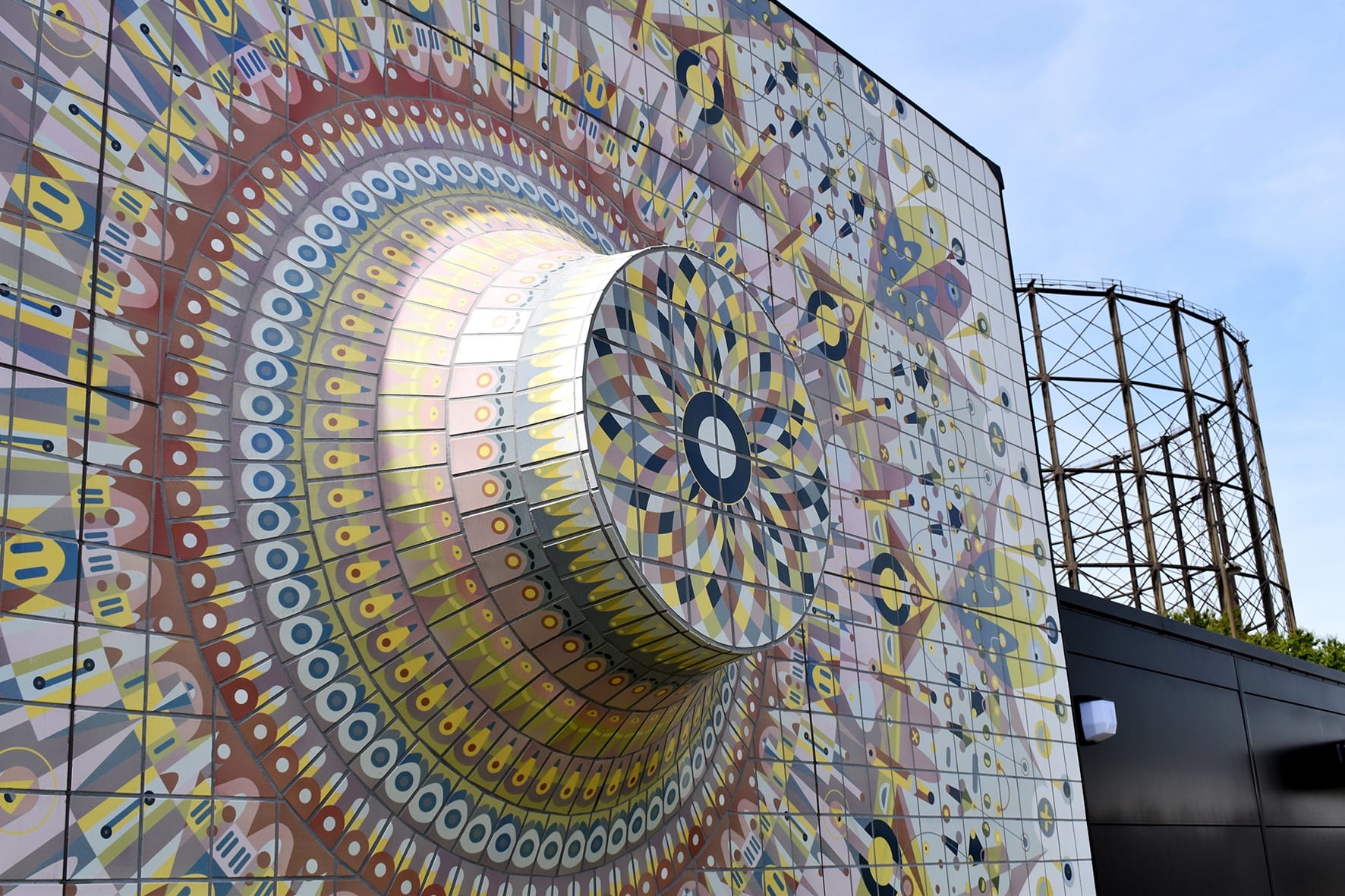 Located on Millennium way and conceived as part of the ongoing Peninsula regeneration, A Pinch in Time takes inspiration from the surrounding rich and industrial context within which it sits. Pascal and Thomas created an overlaid pattern using circular motifs from the area, such as the Blackwall gas tower, the Millennium Dome and the Great Hall of Queens House, which they then coloured, scaled and manipulated to create a vibrant form imbued with the past. This layered pattern was then digitally printed, by Liverpool based Tilefire, on 20 x 20cm ceramic tiles, totalling 1250 tiles that were each one of a kind. FleaFolly wanted to create a bold and distinctive pattern across this 9 x 6m wall but also wanted it to go beyond a flat tiled mural to create something with a more spatial quality that would not only surprise the passer-by but change across the day under different weather conditions and when viewed from different perspectives. To achieve this, FleaFolly enlisted Articole Studios, a fiberglass fabricator with experience in making props for theatre, TV and film. A 3 x 3m fiberglass mould was produced that sits at the centre of the tiled wall creating a literal ‘pinch’ in the mural that pulls the tiled skin out and away from the building creating a new extruded formation. FleaFolly tiled the wall alongside tiling specialist Colin Barber and was generously supplied their tile adhesives by Ardex. For more information on FleaFollyArchitects go to www.fleafollyarchitects.com Images: courtesy FleaFollyArchitects, 2018