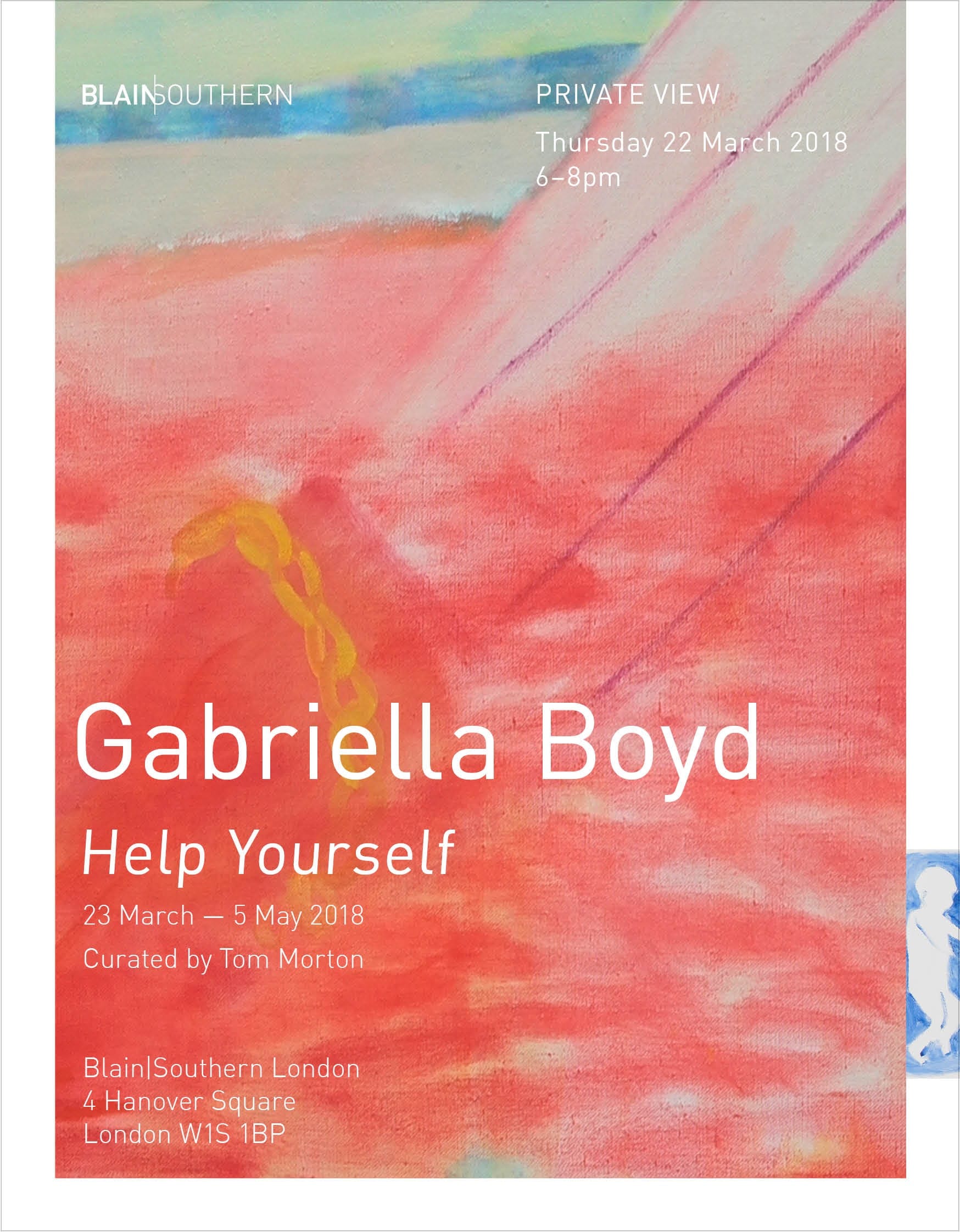 Gabriella Boyd's (TB-264) solo exhibition, Help Yourself, opens at Blain|Southern London on Thursday 22 March 2018, 6-8pm. Help Yourself is part of Lodger, a series of exhibitions running concurrent to the exhibitions in the central space at Blain|Southern and conceived by Tom Morton, writer, curator, and contributing editor for frieze magazine. A publication accompanies the exhibition, with a new text by Tom Morton. Gabriella Boyd (b.1988, Glasgow) studied at Glasgow School of Art (2007-2011) and Royal Academy Schools, London (2014-2017). Selected previous exhibitions include Dreamers Awake, White Cube Bermondsey (2017), Royal Academy Schools Show (2017), Everyone is Rich Now Apparently, Supplement at 255 Canal St, NYC (2017), Gabriella Boyd & Marco Giordano, Art Park, Glasgow International (2016). Boyd was shortlisted for the John Moores Painting Prize in 2016, and was commissioned by the Folio Society to illustrate a new edition of Sigmund Freud’s The Interpretation of Dreams in 2015. Her work will feature in the forthcoming Glasgow International 2018, where it will be shown at The Pipe Factory. Previous artists participating in the Lodger series include Alex Dordoy, Sophie Jung, and Brian Griffiths. Exhibition Dates: 23 March-5 May 2018 Blain|Southern, 4 Hanover Square, London W1S 1BP www.blainsouthern.com