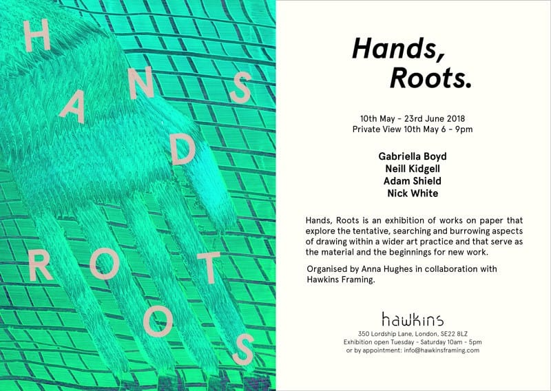 Gabriella Boyd (TB-264), Neill Kidgell (TB-257), Adam Shield (5-101) and Nick White are exhibiting in Hands, Roots, an exhibition of works on paper that explore the tentative, searching and burrowing aspects of drawing within a wider art practice and that serve as the material and the beginnings for new work. Organised by Anna Hughes (5-101) in collaboration with Hawkins Framing. Exhibition Dates: 10 May-23 June 2018 Private View: 10 May 2018, 6-9pm Hawkins 350 Lordship Lane London E22 8LZ www.hawkinsframing.net Exhibition open Tuesday-Saturday, 10am-5pm, or by appointment info@hawkinsframing.com