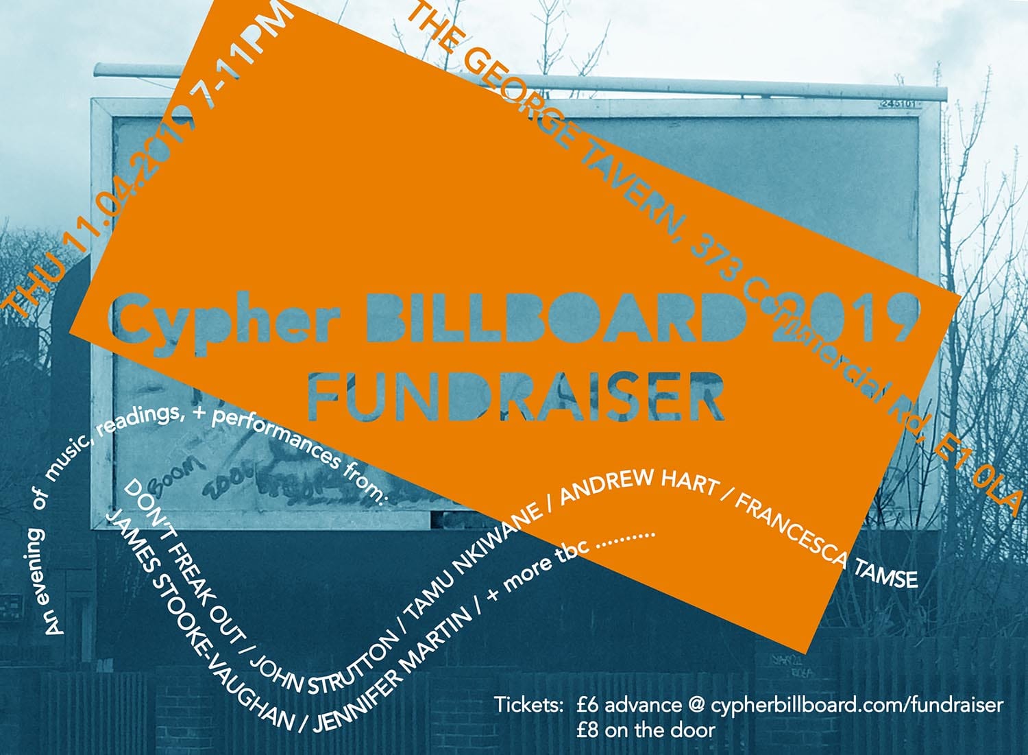 Holly Graham (4-108), Erin Hughes and Amba Sayal-Bennett are launching their Cypher Billboard 2019 programme in May to take place over the summer months. It'll be a jam-packed line-up of artists producing new and exciting artworks and events pivoting around their billboard site in Bounds Green including Eilis Searson + Jakob Rava, Jennifer Martin, soft/WALL/studs collective, Dan Mitchell, and Larry Achiampong. The programme will also be accompanied by digital works developed for online project space Skelf by Billboard 2019 artists and previous exhibitors Holly Graham, Erin Hughes, Milly Peck, Amba Sayal-Bennett + Ralph Hunter-Menzies, and Francesca Tamse. In the meantime to help them cover production costs they're putting on a night of music, readings, performances by programme artists and friends. Expect contributions spanning audio presentation, poetry, funk-soul covers from Don't Freak Out, John Strutton, Tamu Nkiwane, Andrew Hart, Francesca Tamse, James Stooke-Vaughan, Jennifer Moore and more to be confirmed. Launch Event: Thursday 11 April 2019, 7-11pm Venue: The George Tavern, 373 Commercial Road, London, E1 0LA Tickets are £6 when purchased in advance via our website, or £8 in cash on the door. More about Cypher Billboard here: www.cypherbillboard.com