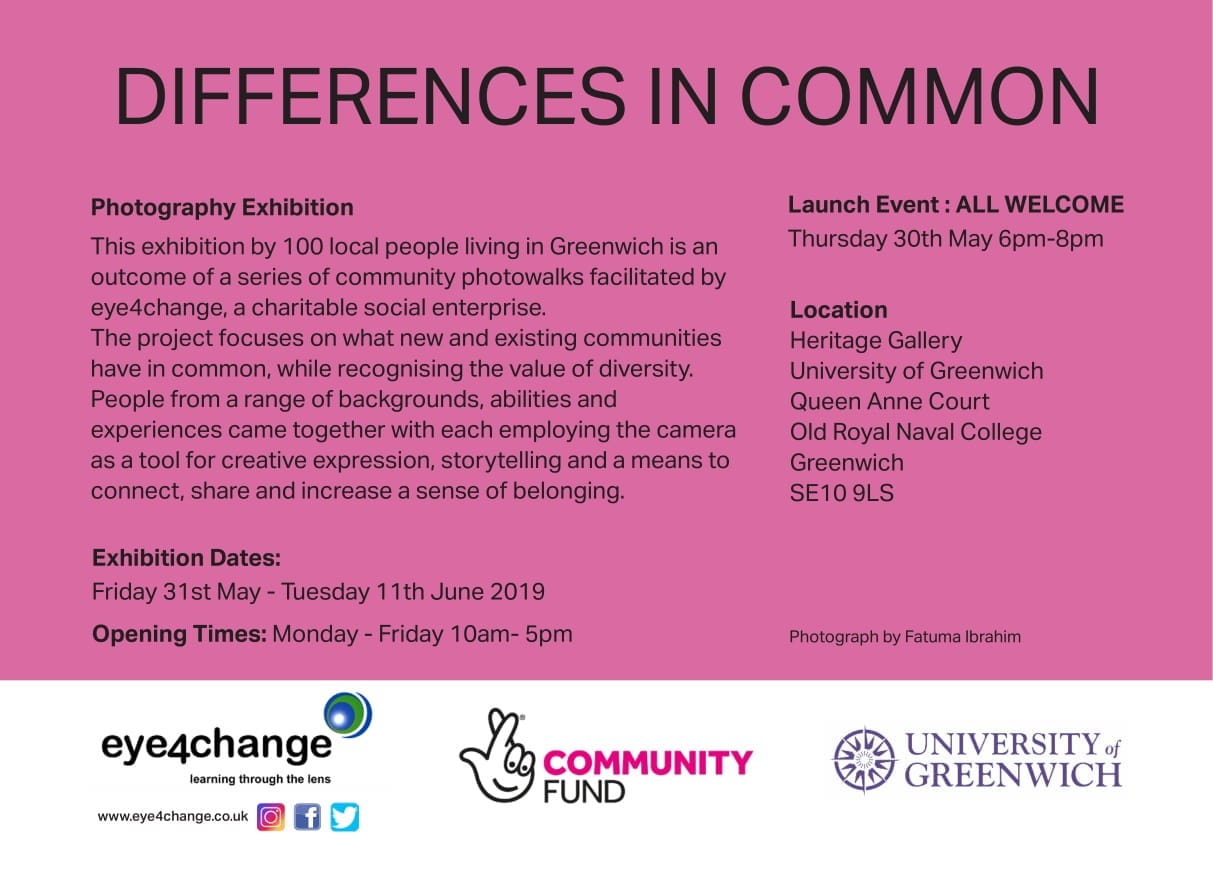 Differences in Common is the outcome of a series of community photowalks through the Royal Borough of Greenwich, facilitated by eye4change. One hundred people from a range of backgrounds, abilities and experiences came together, each employing the camera as a tool for creative expression, storytelling and a means to connect, share and increase a sense of belonging. Joining the project with different abilities, perceptions and experiences, these participants shared a common goal of taking in local street scenes and open spaces on a series of enjoyable walks, photographing things often seen, but left unnoticed. By examining the familiar and recognising that which had gone unobserved in any great depth before, the camera bore witness to the experience. Compelling contemplation. Recording the familiar. Distilling the moment on a single frame. Heritage Gallery, University of Greenwich, Queen Anne Court, Old Royal Naval College, London SE10 9LS. Opening times: Monday-Friday, 10am-5pm Photo: Fatuma Ibrahim