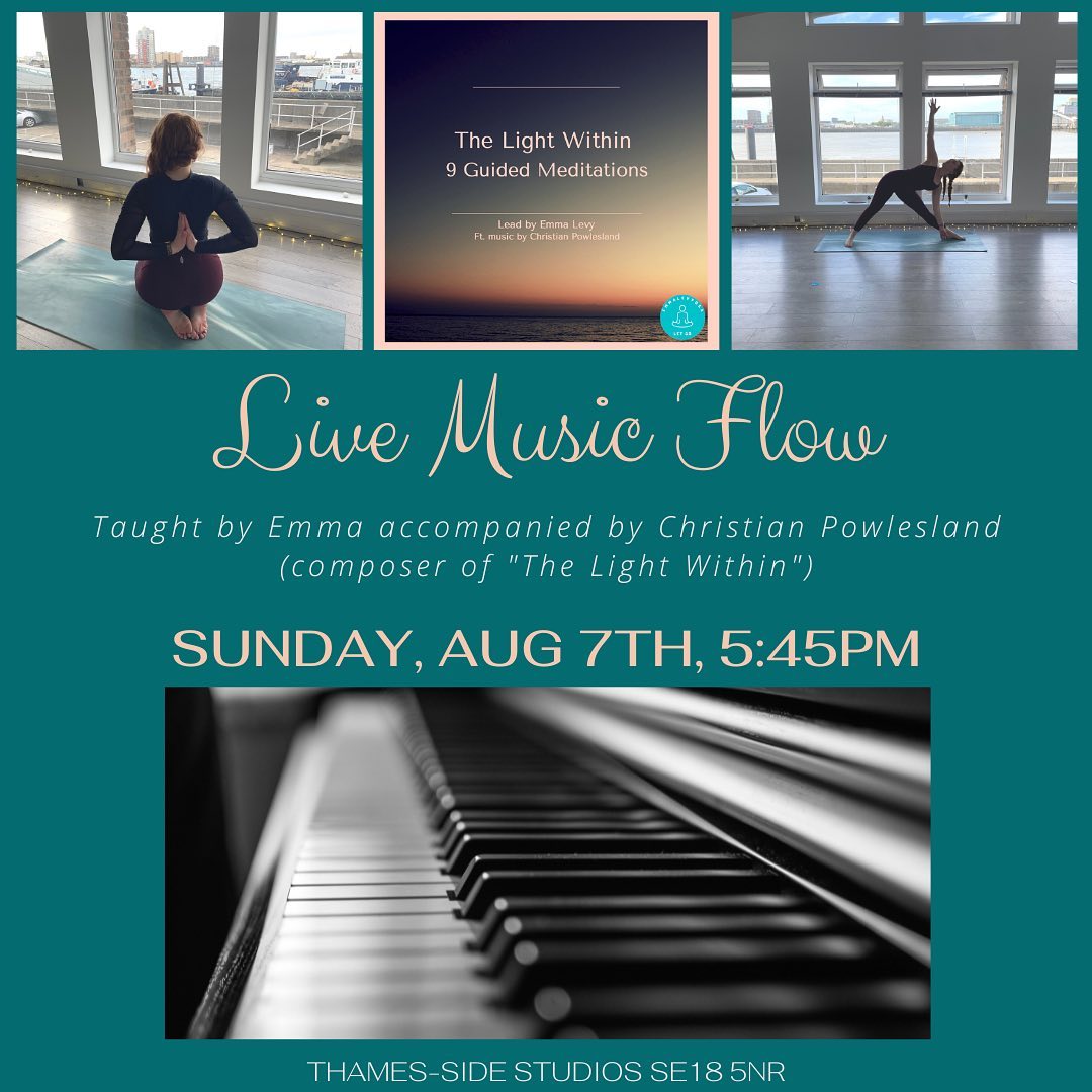 Unit 2, first floor Sunday 7th August, 5.45-7.00pm. Join Emma Levy for a gentle yoga flow accompanied by Christian Powlesland on the piano. Appreciate the beauty of live music and indulge in the sounds for 75 minutes of long full body and soul experience. Give yourself and your loved ones the gift of live music. Christian Powlesland is an actor, musician, composer and writer. He is the composer and creator of the music of The Light Within, a meditation album featuring leading meditations by Emma Levy. The music at the event will compile elements of the album with other original pieces to aid total relaxation. Follow Christian on Instagram @christianpowlesland Price: £20. Suitable for everyone. Thames-Side Studios based studio holders receive £5 off. Email emmalevyoga@gmail.com for your discount code and any further questions. This event has limited space and will book quickly.