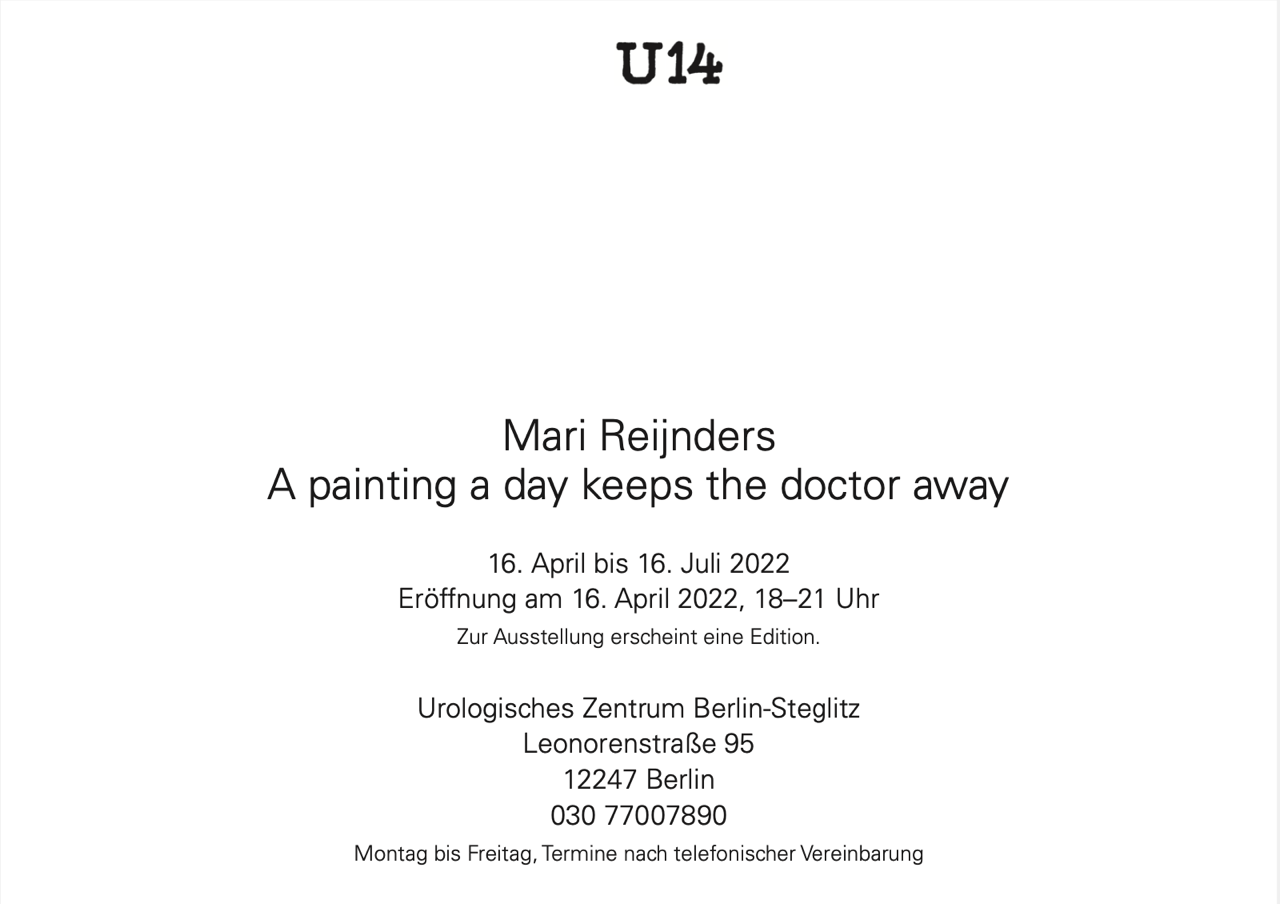 Mari Reijnders (Studio 1-04) solo exhibition A painting a day keeps the doctor away, is on display at U14, Berlin until 16 July. Urologisches Zentrum Berlin-Steglitz, Leonorenstrasse 95, 12247 Berlin. Open Monday-Friday. Open Monday-Friday by appointment. Images: courtesy Mari Reijnders, 2022