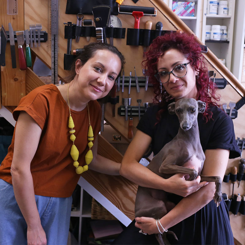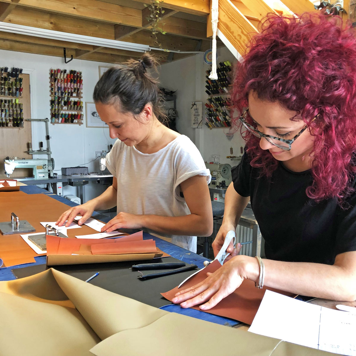 The London Leather Workshop (Studio TB-111) is a design, prototyping and manufacturing studio founded by Italian designers and makers Sara Battiston and Melissa Bruscoli in 2012. With 20 years of experience in the fashion and accessory industry Sara and Melissa work with both local and international customers ranging from start-ups to established brands. Their studio is able to offer a range of services from design consultancy to product development and from prototyping to manufacturing of handbags, accessories and soft furnishings. They also design and manufacture their own signature embroidered appliqué decorations for fashion and interiors for both private and commercial orders. Sara and Melissa share their knowledge and expertise through classes and one-to-one training, suitable for professionals looking to improve their skill set, amateur leather craftspeople and anyone who has an interest in developing a career in the industry. They believe that their industry can change for the better through the smallest choices and are passionate about supporting the growth of sustainable businesses that share the same values: appreciation of artisanship and respect for the environment. For more details about classes visit www.thelondonleatherworkshop.com and follow on Instagram @the_london_leather_workshop Images: courtesy The London Leather Workshop, portraits taken in the studio on 7th June 2022.