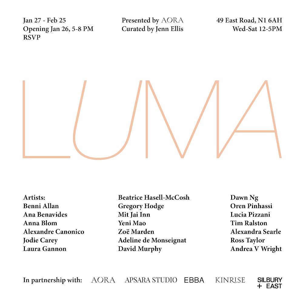Alexandra Searle (Studio TW-134) and Andrea V Wright (Studio 0-108) are exhibiting in LUMA curated by Jenn Ellis and presented by AORA. Private View: Thursday 26th January, 5-8pm. Open Wednesday-Saturday, 12-5pm. Exhibition continues until 25th February. LUMA, 49 East Road, London N1 6AH. For more details follow @aoraspace on Instagram.