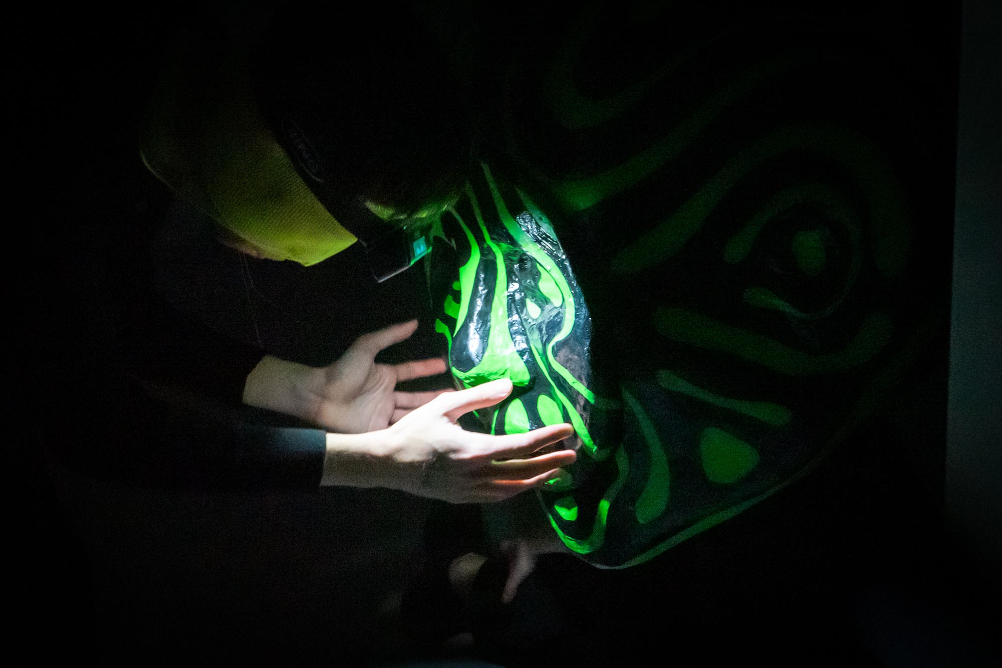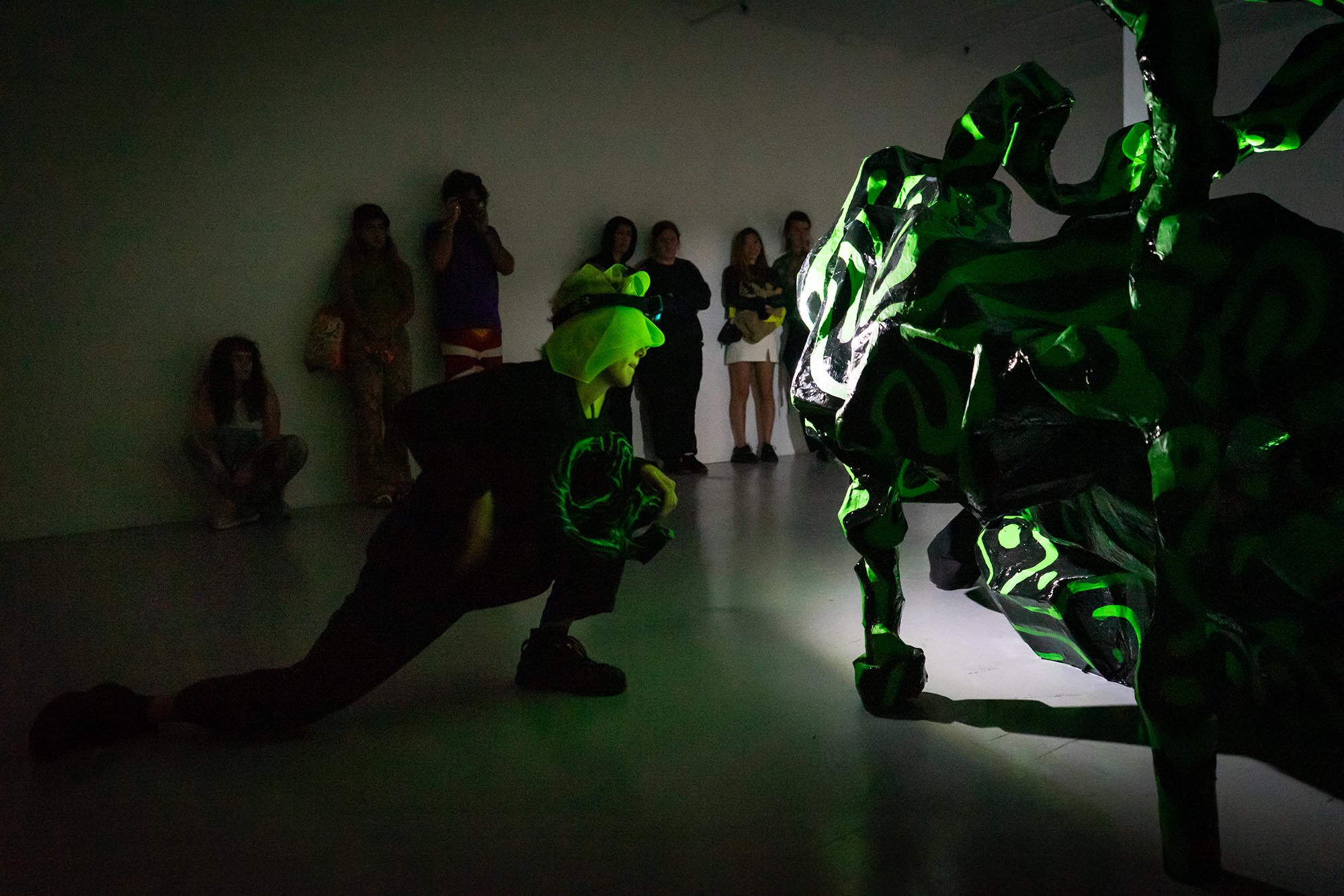 P300 was a one-off live-to-digital performance by artist Aoibheann Greenan (U2-126) presented in the Photography Studio (Woolwich, Unit 8) on Saturday 30th September. A giant multiple sculpture, inspired by neural architecture, was probed and manipulated by performers, accompanied by a live electronic score. The P300 is a specific brain wave that is generated in response to the recognition of a stimulus. Its discovery has led to a wide variety of applications, including the ‘oddball’ test, a lie detection method used in criminal investigations. P300 imagines a near future in which our intrusive thoughts are mined by consumer neuro technologies. P300 was a collaboration with Travis Yu, Lily Tonkin-Wells, Fionnuala Kennedy and Dominic Kennedy. Documentation of the work will be developed into Aoibheann's upcoming video work. See Aoibheann's work at www.aoibheanngreenan.com and follow on Instagram @rodeo.oracle