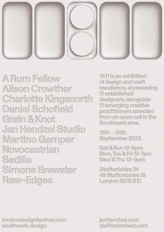 Jan Hendzel Design (Studio TB-01/00) is currently presenting new works in their curated 11:11 exhibition at Staffordshire Street Gallery in Peckham, on show until 24th September. Part of London Design Festival, the exhibition takes its name from New Age and numerological beliefs, where 11:11 is seen as a special set of numbers rooted in synchronicity, chance, new beginnings and opportunities for growth. After an open call earlier this summer, they invited eleven emerging creatives to exhibit a piece of work alongside their roster of established designers. Read more here Staffordshire Street Gallery, 49 Staffordshire Street, London SE15 5TJ. www.staffordshirest.com/janhendzel Open Monday, Tuesday and Friday, 12-7pm, Wednesday and Thursday 12-9pm and weekends 12-6pm.