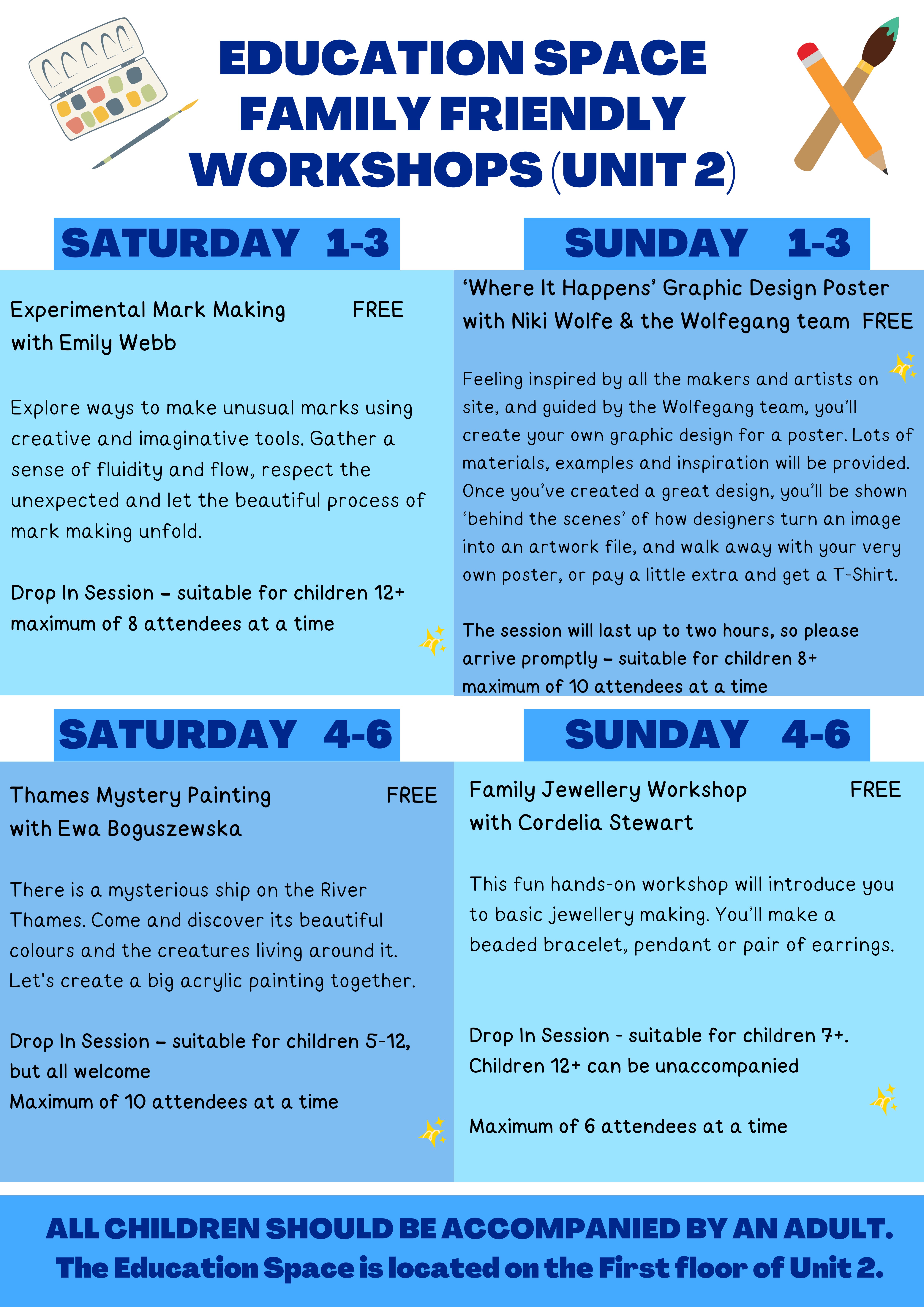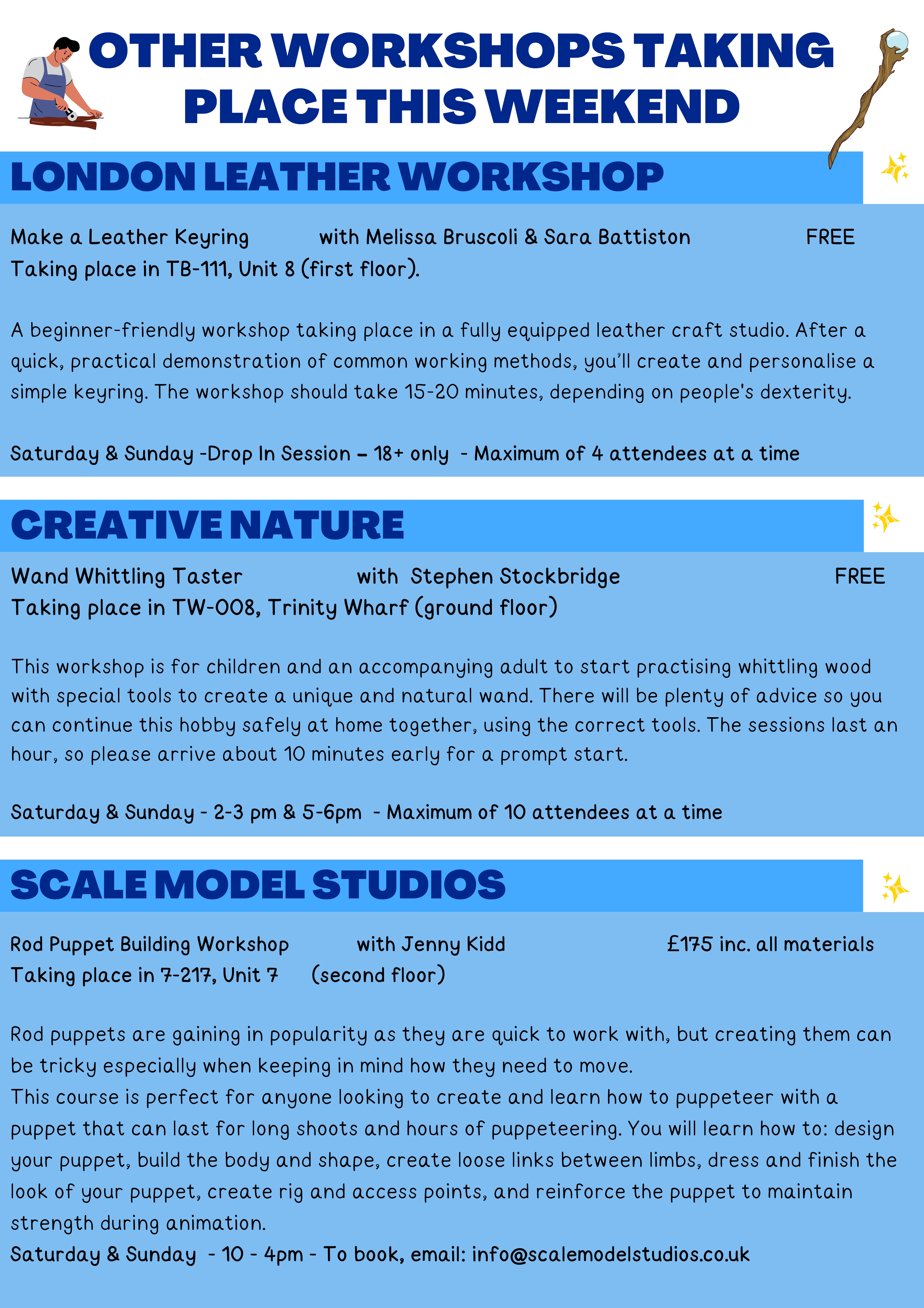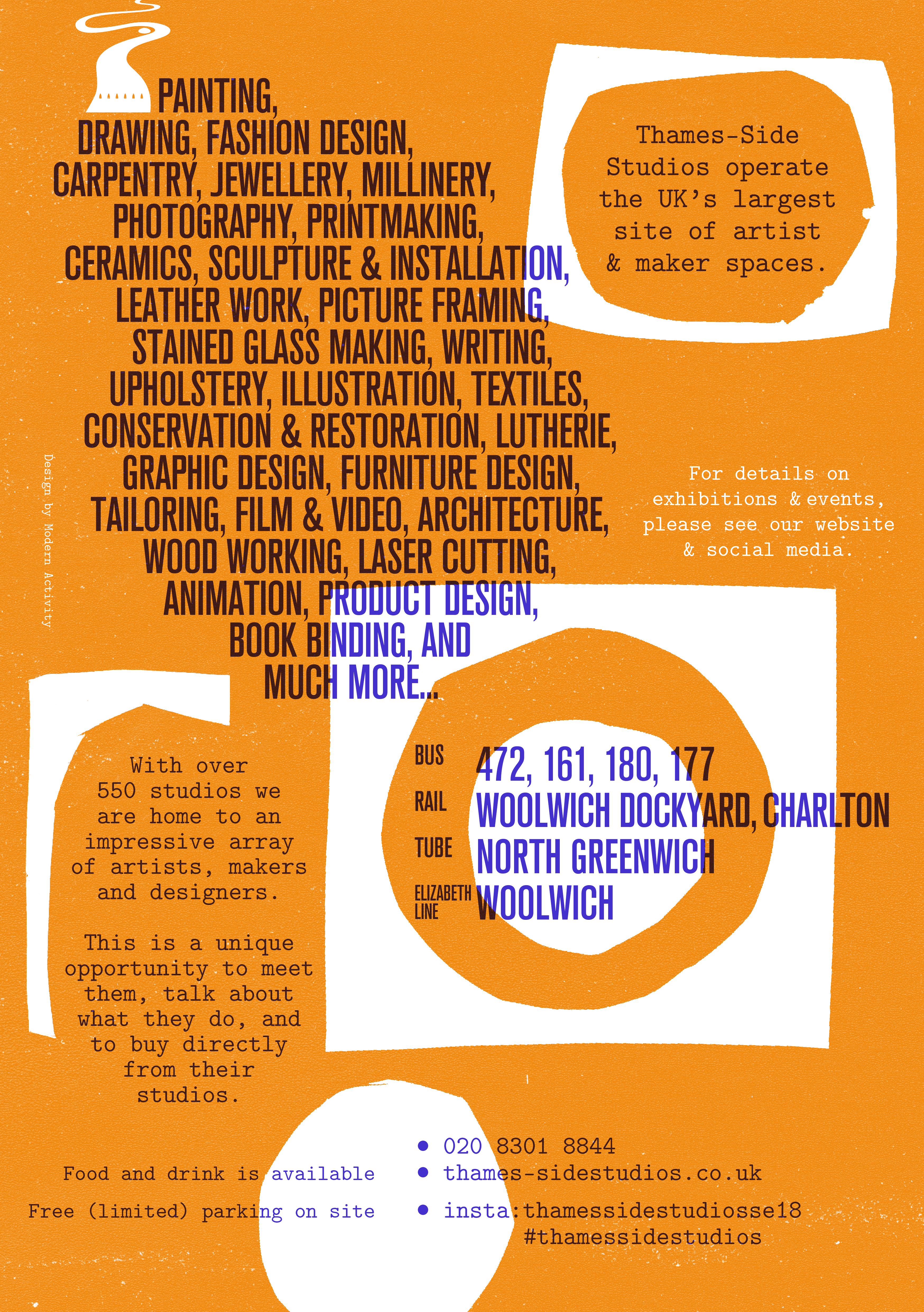 Our 2023 Woolwich Open Studios took place on Saturday 10th and Sunday 11th June. Thames-Side Studios operate the UK's largest site of artist and maker spaces. With over 550 studios we are home to an impressive array of artists, makers and designers. This is a unique opportunity to meet them, talk about what they do, and to buy directly from their studios. Painting, drawing, fashion design, carpentry, jewellery, millinery, photography, printmaking, ceramics, sculpture & installation, tailoring, leather work, picture framing, stained glass making, writing, upholstery, illustration, textiles, conservation & restoration, lutherie, graphic design, furniture design, film and video, architecture, wood working, laser cutting, product design, book binding, animation, and much more… FREE Weekend Workshops in the Education Space (Unit 2, 1st floor) Saturday, 1-3pm Experimental Mark Making with Emily Webb FREE Explore ways to make unusual marks using creative and imaginative tools. Gather a sense of fluidity and flow, respect the unexpected and let the beautiful process of mark making unfold. Materials provided. Drop In Session – maximum of 8 attendees at a time – suitable for children 12+. Saturday, 4-6pm Thames Mystery Painting with Ewa Boguszewska FREE There is a mysterious ship on the River Thames. Come and discover its beautiful colours and the creatures living around it. Let's create a big acrylic painting together. Drop In Session – maximum of 10 attendees at a time – suitable for children 5-12, but all welcome. Sunday, 1-3pm Where It Happens Graphic Design Poster with Niki Wolfe & the Wolfegang team FREE Thames-Side Studios is Where it Happens. Feeling inspired by all the makers and artists on site, and guided by the Wolfegang team, you’ll create your own graphic design for a poster. Lots of materials, examples and inspiration will be provided. Once you’ve created a great design, you’ll be shown ‘behind the scenes’ of how our designers turn an image into an artwork file, and walk away with you very own poster. If you love your design so much, the Wolfegang team can print you a t-shirt for an additional fee. Please attend for the full session – maximum of 10 at a time - suitable for children 8+. Sunday, 4-6pm Family Jewellery Workshop with Cordelia Stewart FREE This fun hands-on workshop will introduce you to basic jewellery making. You’ll make a beaded bracelet, pendant or pair of earrings. Drop In Session – maximum of 6 attendees at a time – suitable for children 7+. Children 12+ can be unaccompanied. FREE Weekend Workshops in the Lounge (Unit 0, 2nd floor. Lift access available). Saturday, 1-3pm Creatures of the Thames Clay Workshop with Fran Reeves FREE Create a creature of the Thames or sea monster from the Estuary! Use air dry clay to sculpt a small river beastie to take away with you, be it a bird, fish, eel or something else entirely that lurks about the muddy Thames! Drop In Session – maximum of 6 attendees at a time – suitable for children 5-12, but all welcome. Saturday, 4-6pm Experimental Mark Making with Emily Webb FREE Explore ways to make unusual marks using creative and imaginative tools. Gather a sense of fluidity and flow, respect the unexpected and let the beautiful process of mark making unfold. Materials provided. Drop In Session – maximum of 8 attendees at a time – suitable for children 12+. Sunday, 1-3pm Wildflower Seed Bomb Making with Miyuki Kasahara FREE Make flower, butterfly, bee and other pollinator-shaped wildflower seed bombs in this free, fun and practical workshop. During the session, we will talk about what kinds of wildflowers encourage particular pollinators and their relationships. We will also consider how much they have declined in recent years and how we can help them. The wildflower seed bombs can be distributed in your garden, by the roadside, riverbanks or derelict land, to help the pollinators. Drop In Session – maximum of 10 attendees at a time – suitable for children 5+. ‘Positive message’ Creative Badge Making with Ania Pawlik FREE Come along to create your own unique and personalised badges with a positive message to share with the world. Feel free to look through some examples of other badges or just let your creativity be playful. All materials will be provided, just bring your imagination and simply enjoy the process of turning your design into a badge. Drop In Session – maximum of 10 attendees at a time – suitable for children 5+. Other Workshops Taking Place This Weekend London Leather Workshop Make a Leather Keyring with Melissa Bruscoli & Sara Battiston FREE Taking place in TB-111, Unit 8 (first floor). A beginner-friendly workshop taking place in a fully equipped leather craft studio. After a quick, practical demonstration of common working methods, you’ll create and personalise asimple keyring. The workshop should take 15-20 minutes, depending on people's dexterity. Saturday & Sunday - Drop In Session – 18+ only - Maximum of 4 attendees at a time CREATIVE NATURE Wand Whittling Taster with Stephen Stockbridge FREE Taking place in TW-008, Trinity Wharf (ground floor) This workshop is for children and an accompanying adult to start practising whittling wood with special tools to create a unique and natural wand. There will be plenty of advice so you can continue this hobby safely at home together, using the correct tools. The sessions last an hour, so please arrive about 10 minutes early for a prompt start. Saturday & Sunday - 2-3 pm & 5-6pm - Maximum of 10 attendees at a time Scale Model Studios Rod Puppet Building Workshop with Jenny Kidd £175 including all materials Taking place in 7-217, Unit 7 (2nd floor) Rod puppets are gaining in popularity as they are quick to work with, but creating them can be tricky especially when keeping in mind how they need to move. This course is perfect for anyone looking to create and learn how to puppeteer with a puppet that can last for long shoots an