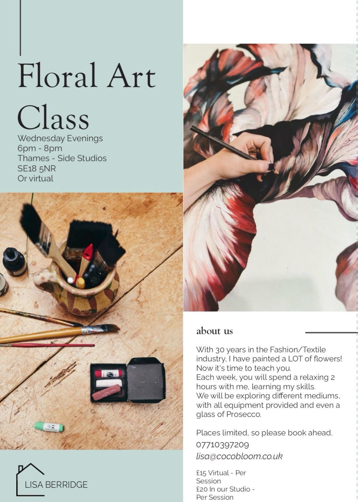 Lisa Berridge of CocoBloom (Studio 4-102) runs a Floral Art Class on Wednesdays from 6-8pm, £20. With 30 years in the Fashion/Textile industry, Lisa has painted a lot of flowers. Now it's time to teach you. Each week you can spend a relaxing two hours learning Lisa's skills and exploring different mediums. All materials are provided and you'll even enjoy a glass of Prosecco. cocobloom.co.uk Classes resume on Wednesday 4th September and every Wednesday thereafter. To find out more and book your place email lisa@cocobloom.co.uk or call Lisa on 07710 397 209.