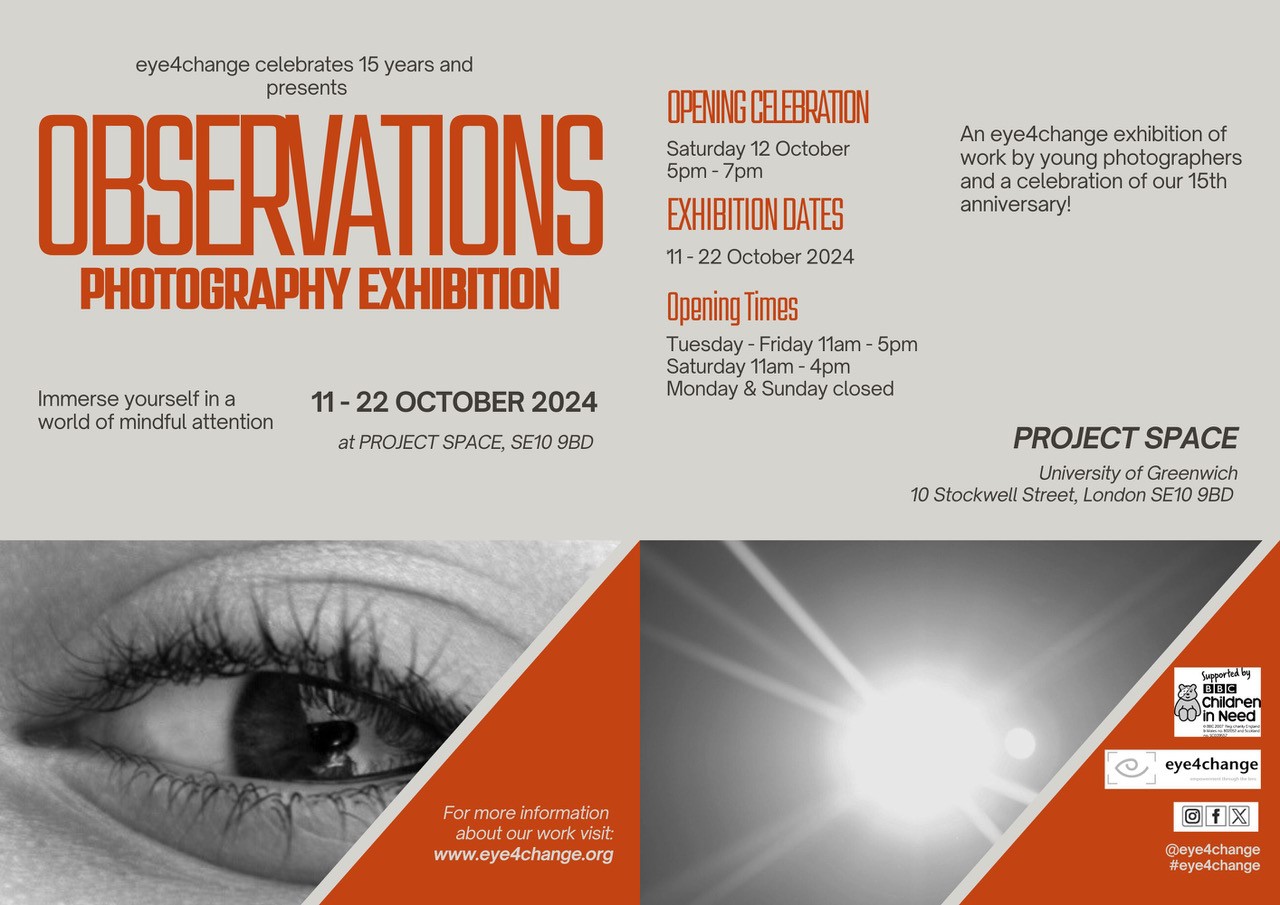 This exhibition marks the 15 Year Anniversary of eye4change, an award winning charity committed to providing a means of connection and community, for disadvantaged people of all ages, particularly young people. Harnessing the power of photography, to improve confidence, communication, wellbeing and a sense of belonging. www.eye4change.org. Watch the London Live interview here.