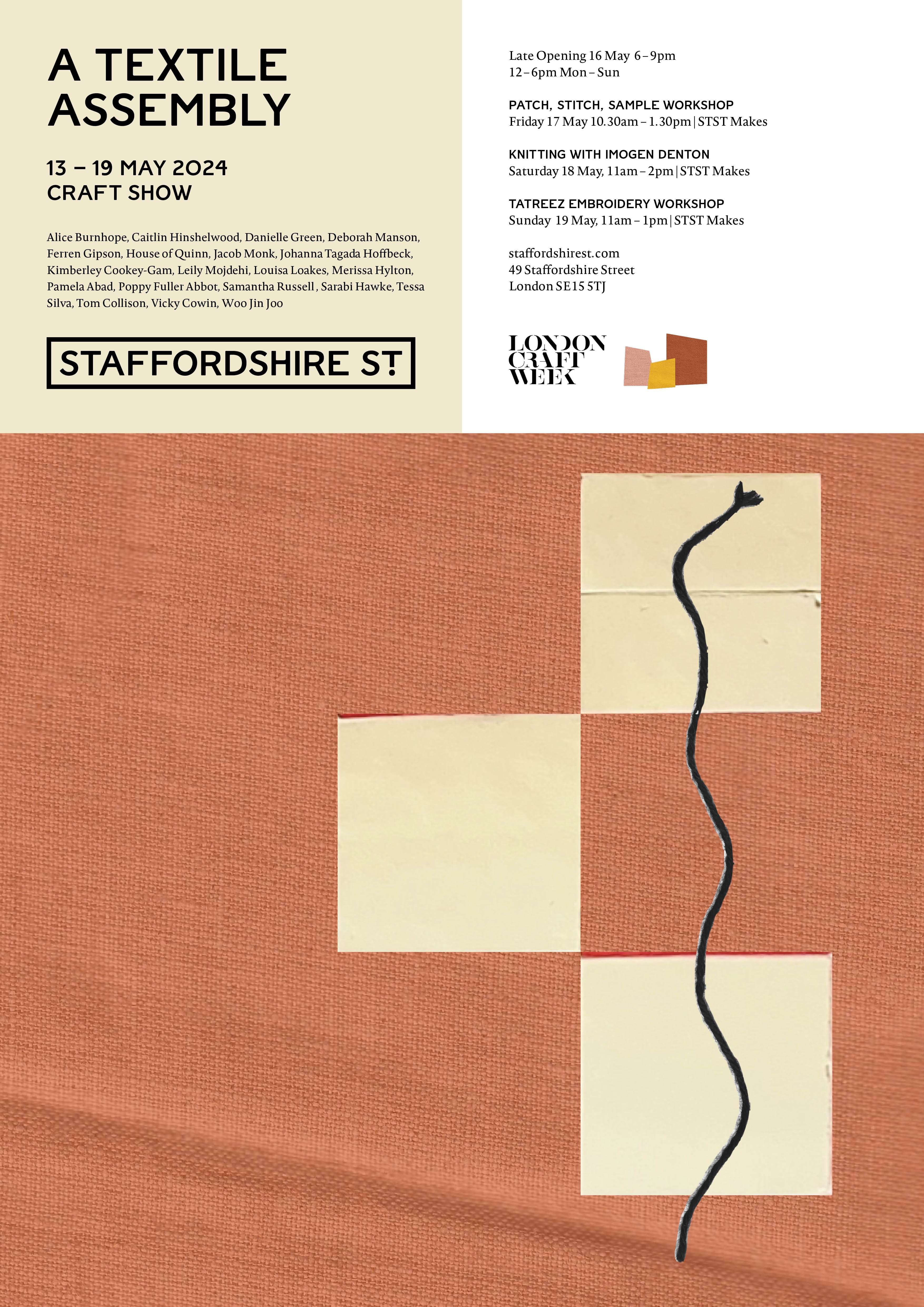 Vicky Cowin (Studio 5-237) is exhibiting in A Textile Assembly at Staffordshire St, curated by Craft Show: an exhibition of textiles and textile art opening as a part of London Craft Week’s official schedule. Showcasing the work of both celebrated and emerging makers, the exhibition will explore textile construction and the personal stories woven into their very fabric. The act of making will be at the heart of the space, with a programme of hands-on workshops, drawing inspiration from the exhibition itself. From natural dye and embroidery to yarn art and quilting, the exhibition will be alive with the hum of conversations and craftspeople sharing their skills. Exhibiting artists: Alice Burnhope, Caitlin Hinshelwood, Danielle Green, Deborah Manson, Ferren Gipson, House of Quinn, Jacob Monk, Johanna Tagada Hoffbeck, Kimberley Cookey-Gam, Leily Mojdehi, Louisa Loakes, Merissa Hylton, Pamela Abad, Poppy Fuller Abbott, Samantha Russell, Sarabi Hawke, Tessa Silva, Tom Collison, Vicky Cowin, Woo Jin Joo. Staffordshire St, 49 Staffordshire Street, London SE15 5TJ. www.staffordshirest.com/peckham-craft-show