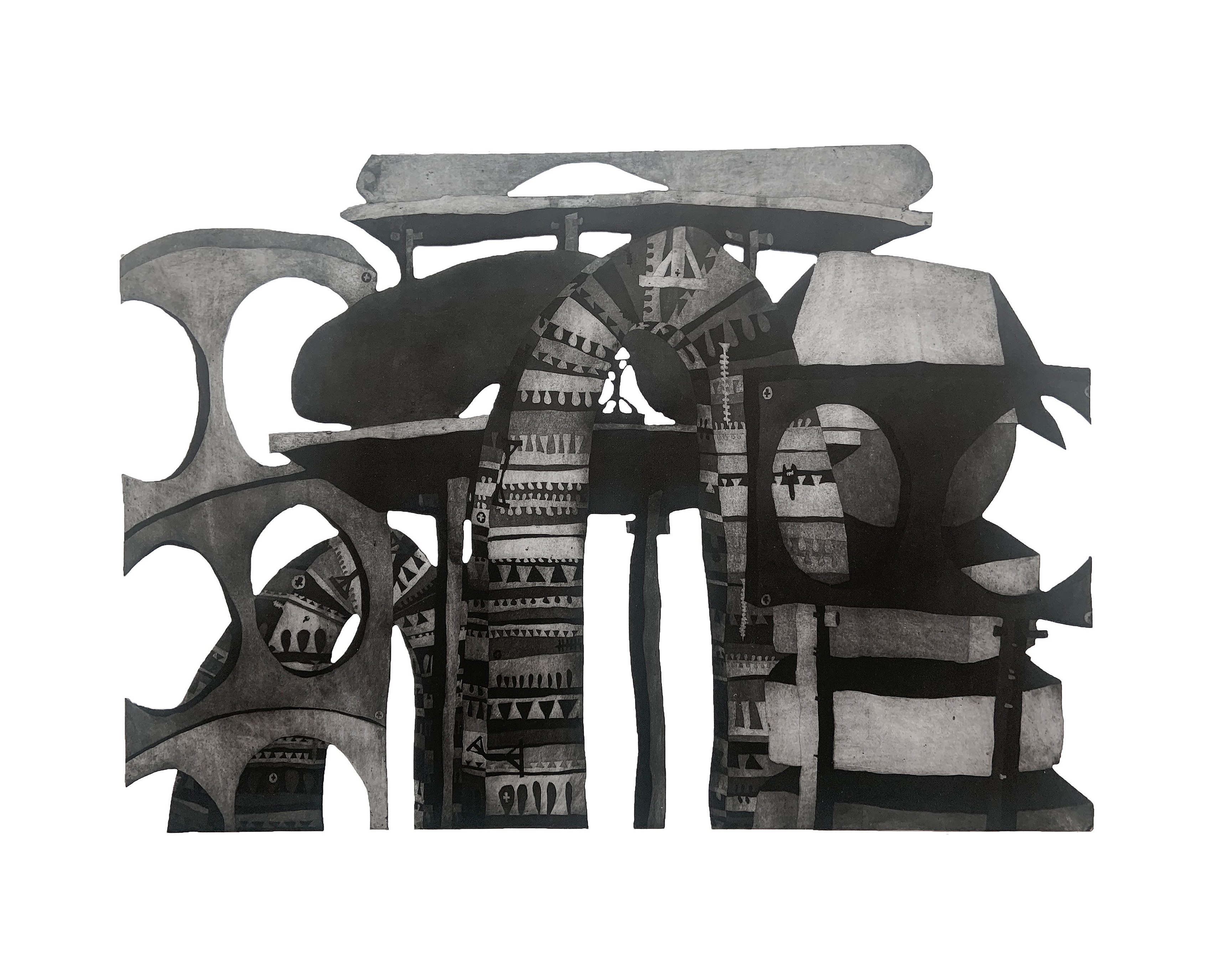 With her prints she combines different etching processes, layering aquatint and photo-etching within the same print. She convert photographs of her sculptural works into photo-etchings, incorporating and blending them within the aquatint drawings. Imagery and motifs within the prints are constantly repeated and she tries to play with the space created by the plate and subsequent emboss on the paper. The composition of the etching within the plate helps to hint at the scale and space in which the objects exist within.