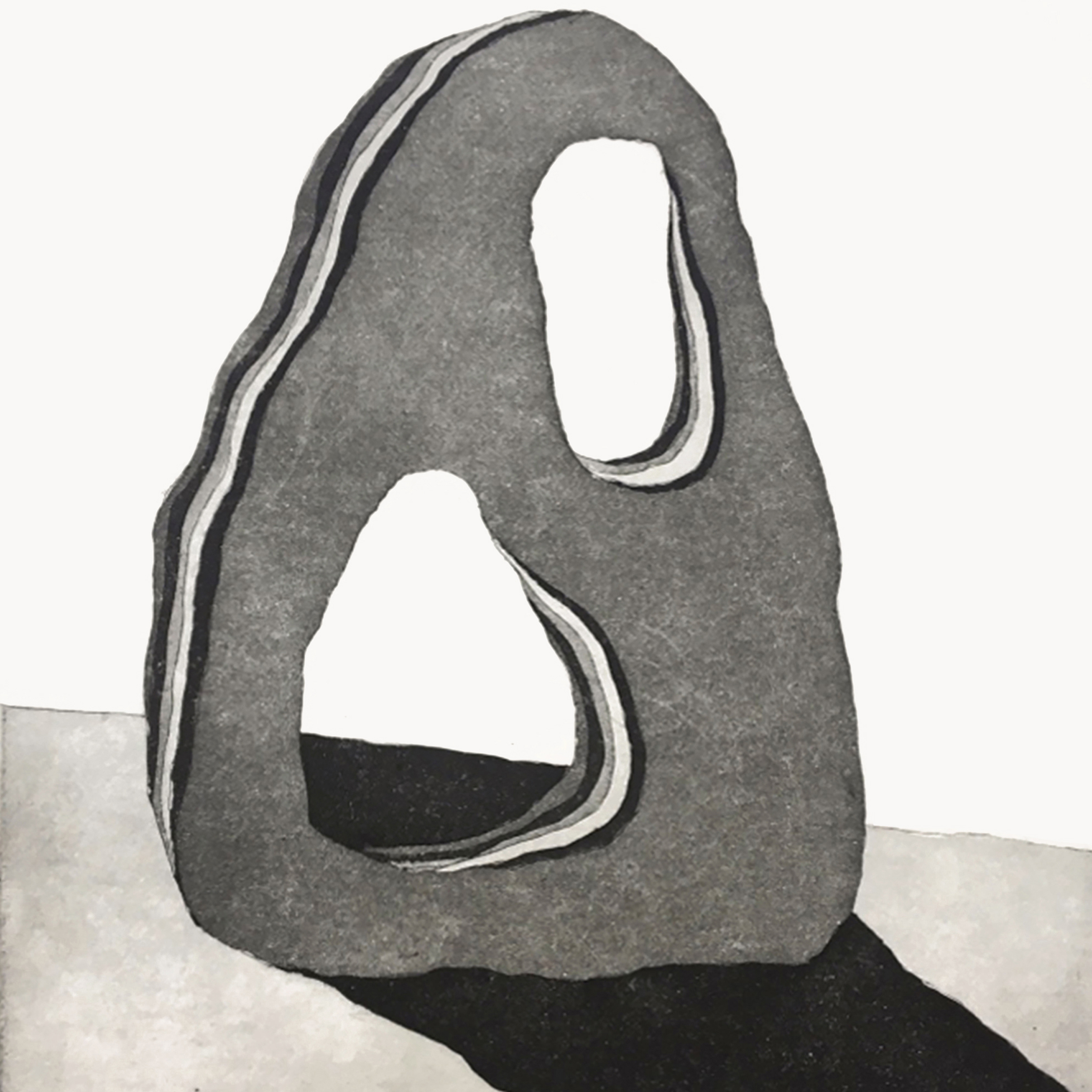 With her prints she combines different etching processes, layering aquatint and photo-etching within the same print. She convert photographs of her sculptural works into photo-etchings, incorporating and blending them within the aquatint drawings. Imagery and motifs within the prints are constantly repeated and she tries to play with the space created by the plate and subsequent emboss on the paper. The composition of the etching within the plate helps to hint at the scale and space in which the objects exist within.