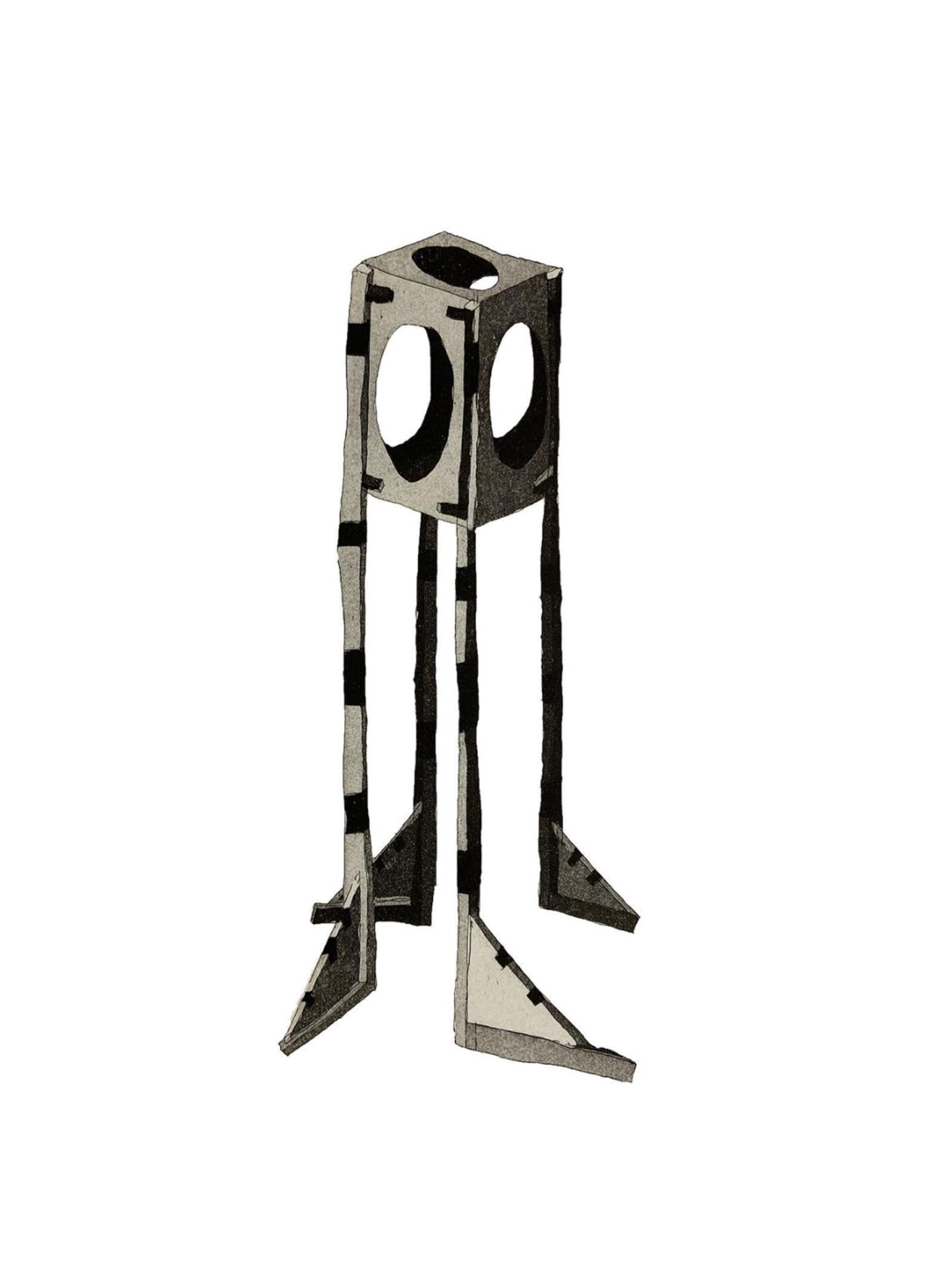 With her prints she combines different etching processes, layering aquatint and photo-etching within the same print. She convert photographs of her sculptural works into photo-etchings, incorporating and blending them within the aquatint drawings. Imagery and motifs within the prints are constantly repeated and she tries to play with the space created by the plate and subsequent emboss on the paper. The composition of the etching within the plate helps to hint at the scale and space in which the objects exist within.