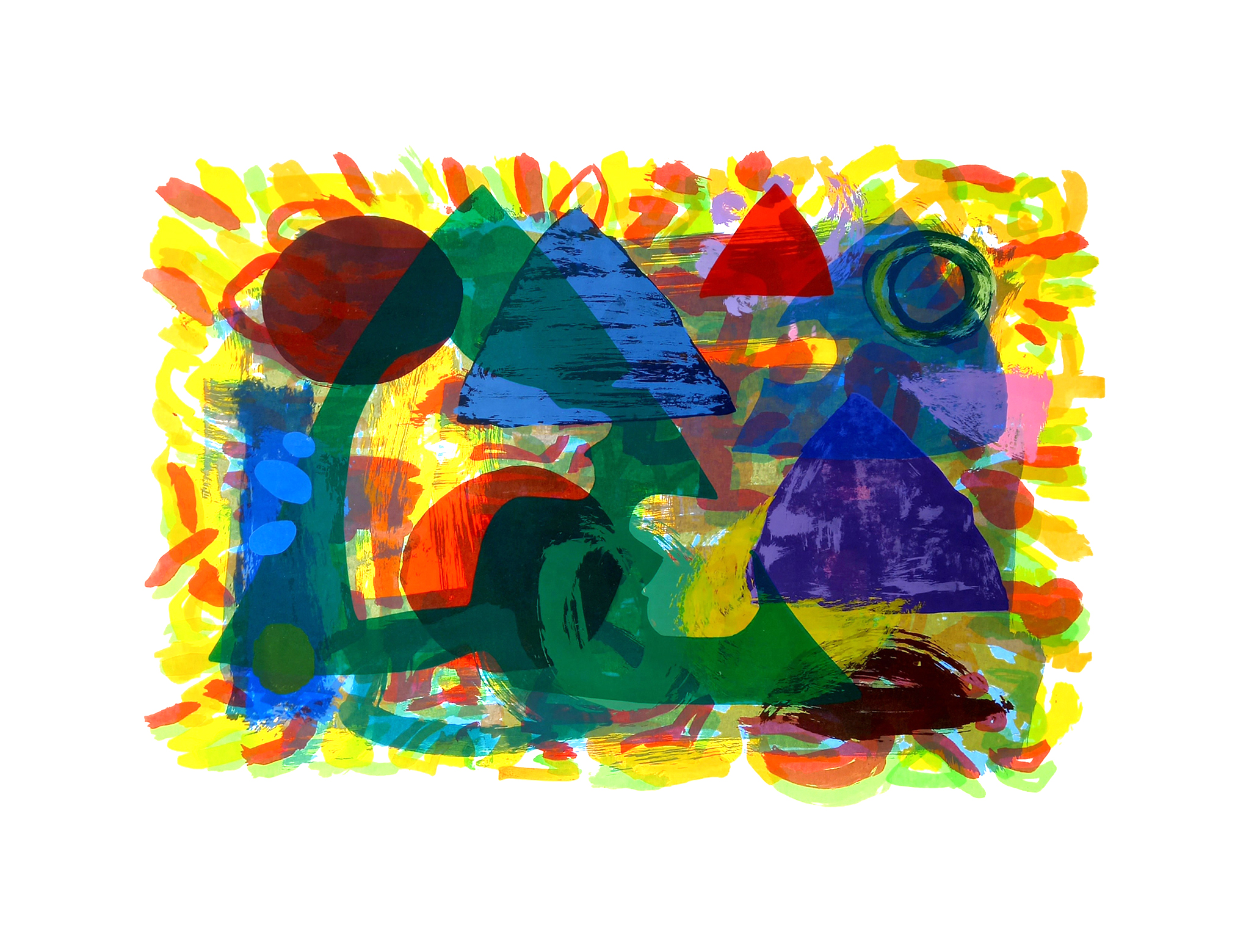 Joan Miro, John Hoyland, Bert Irvin and A. R. Penck, artists I liked at the time, had been influences during this period. I have treated screenprinting as an abstract fine artist would starting with random, chaotic shapes and colours and gradually adding more refined and considered elements to arrive at a final composition. I have created stencils that explore both opaqueness and transparency by adjusting the amount of acrylic medium used. Also, by mixing hard edged shapes with more freeform brushed edges.