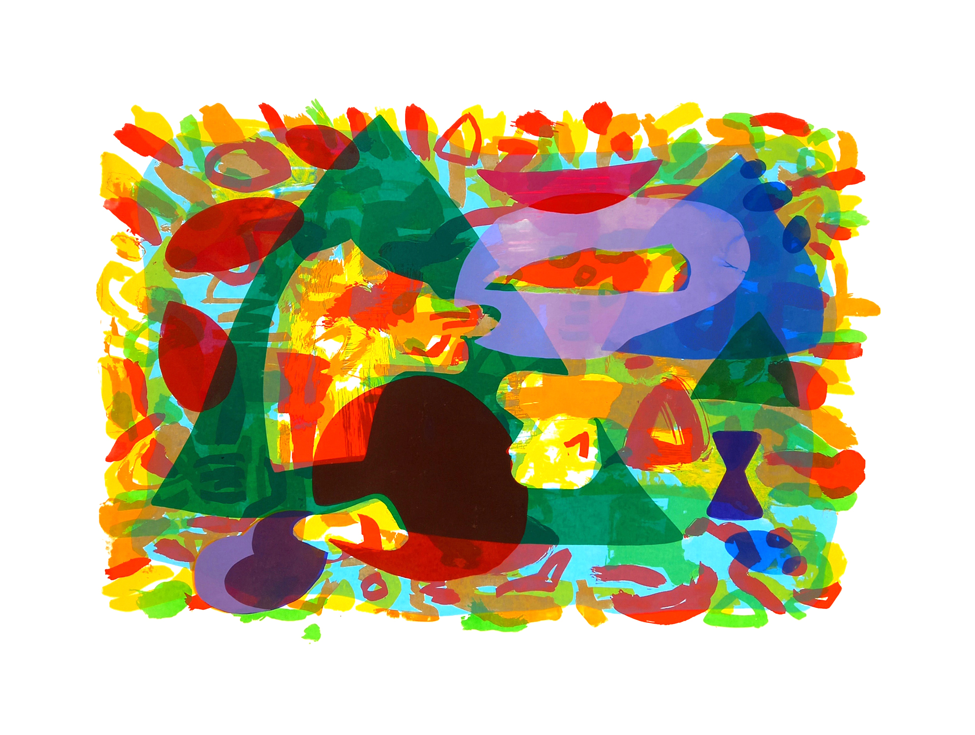 Joan Miro, John Hoyland, Bert Irvin and A. R. Penck, artists I liked at the time, had been influences during this period. I have treated screenprinting as an abstract fine artist would starting with random, chaotic shapes and colours and gradually adding more refined and considered elements to arrive at a final composition. I have created stencils that explore both opaqueness and transparency by adjusting the amount of acrylic medium used. Also, by mixing hard edged shapes with more freeform brushed edges.